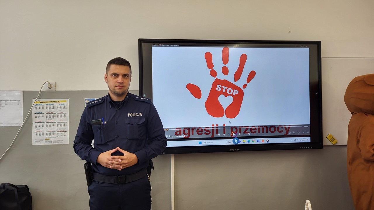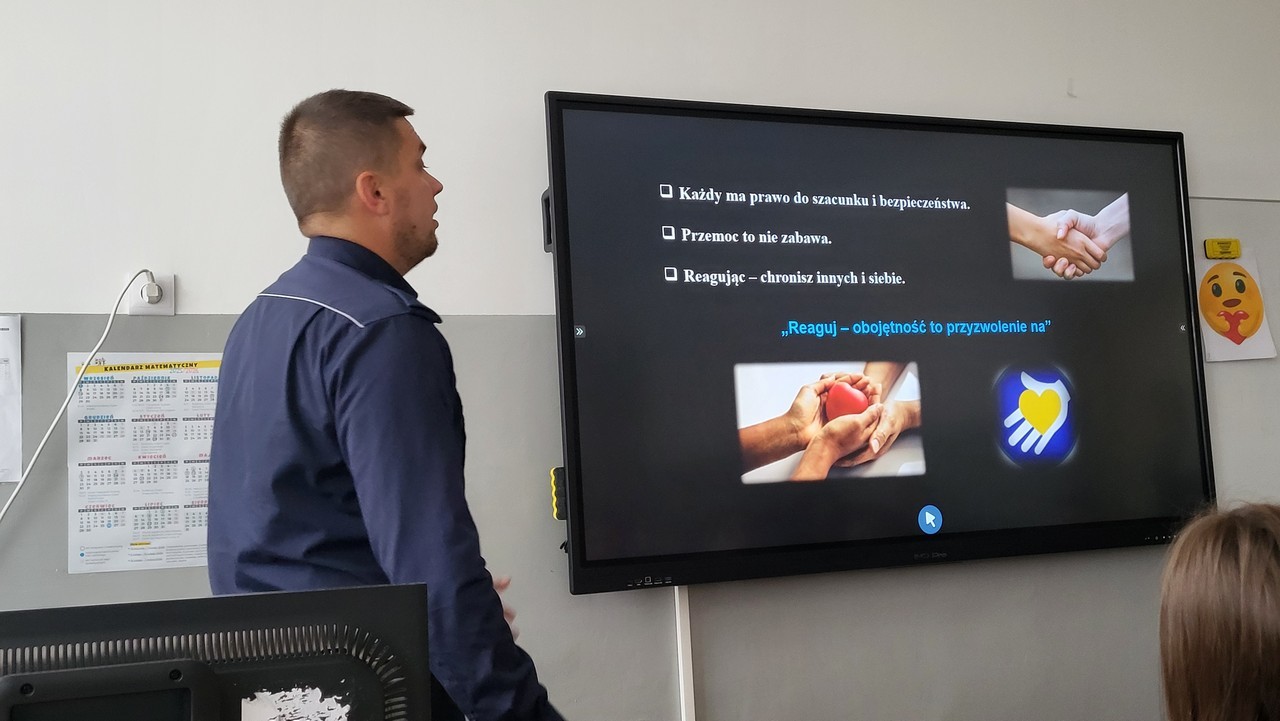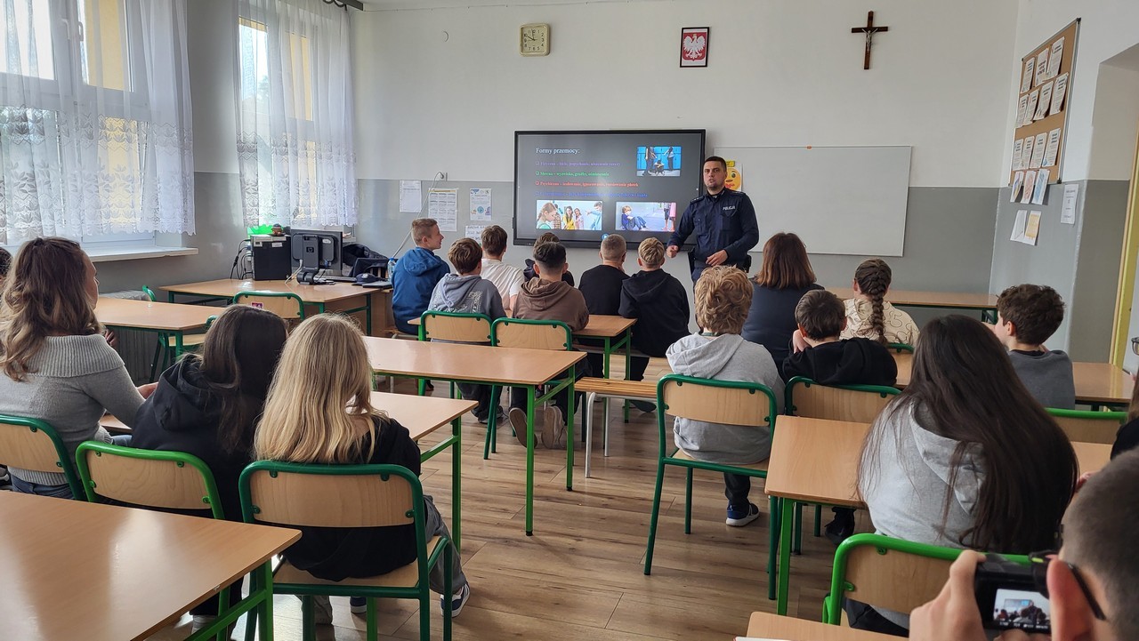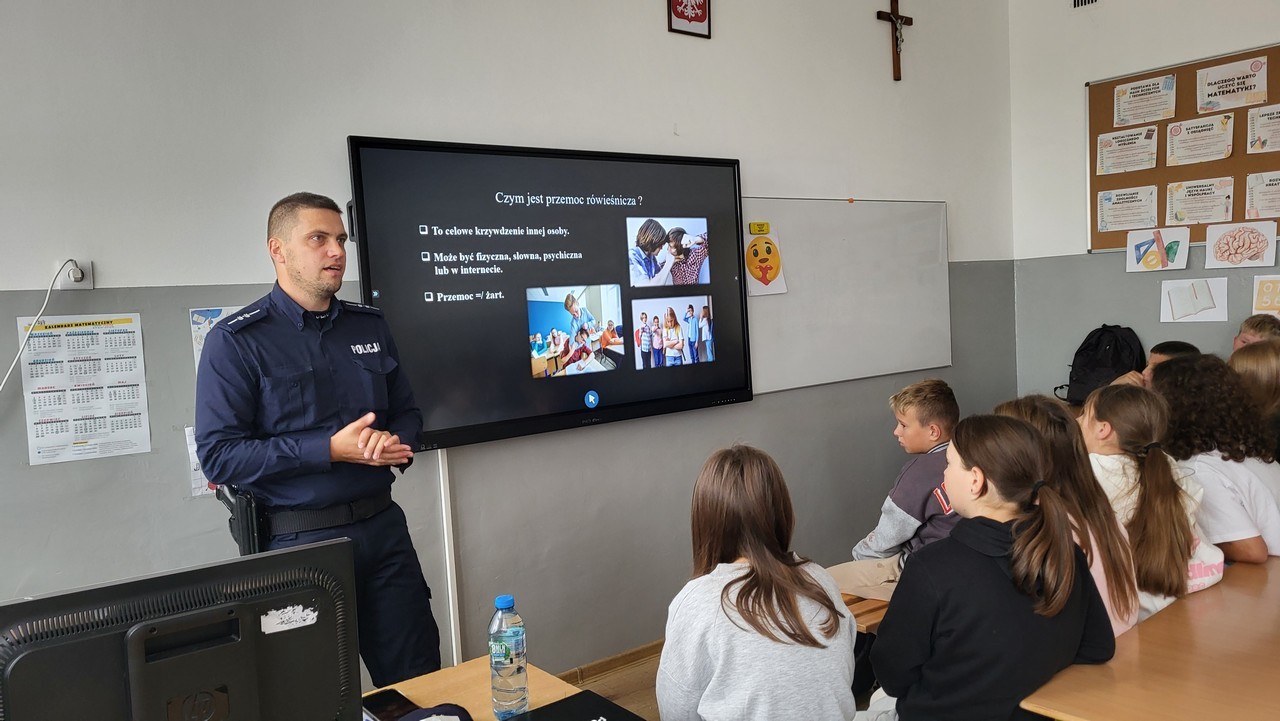Wizyta policjanta była ważnym elementem działań profilaktycznych w naszej szkole, w której dbamy o dobry klimat, nie pozwalamy na krzywdę, a w razie trudności – wspólnie ustalamy kroki naprawcze.