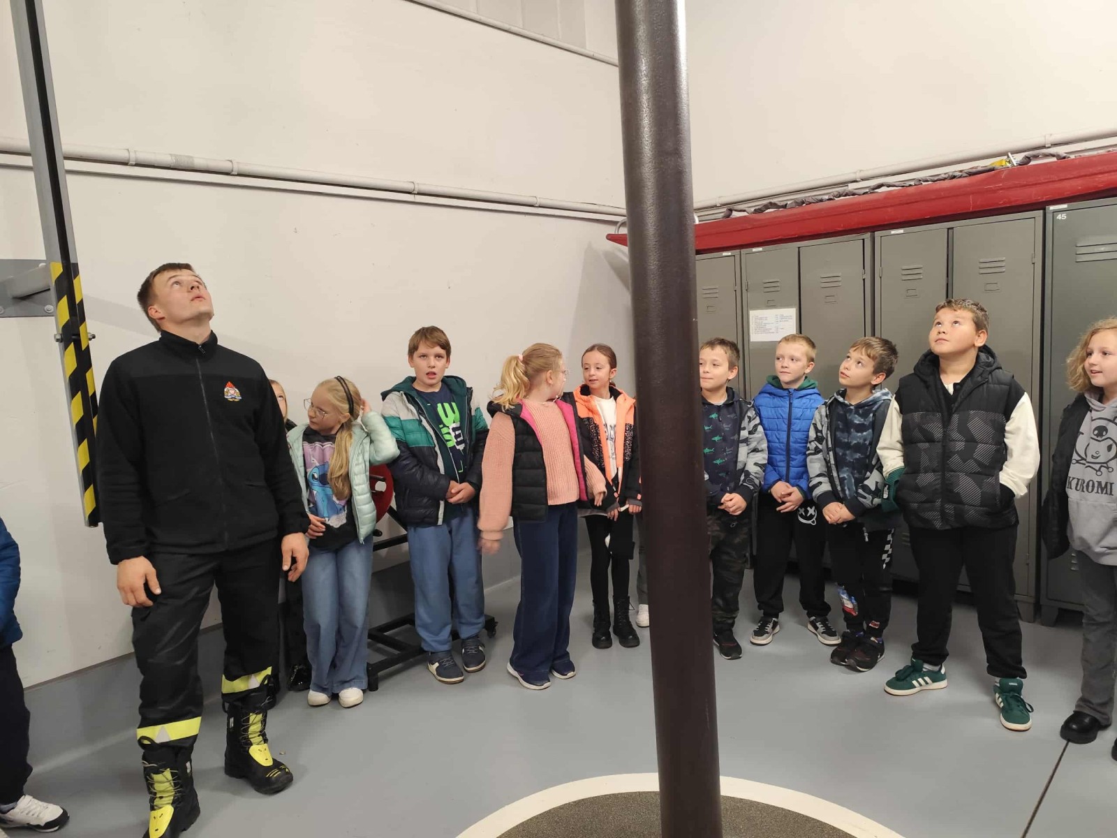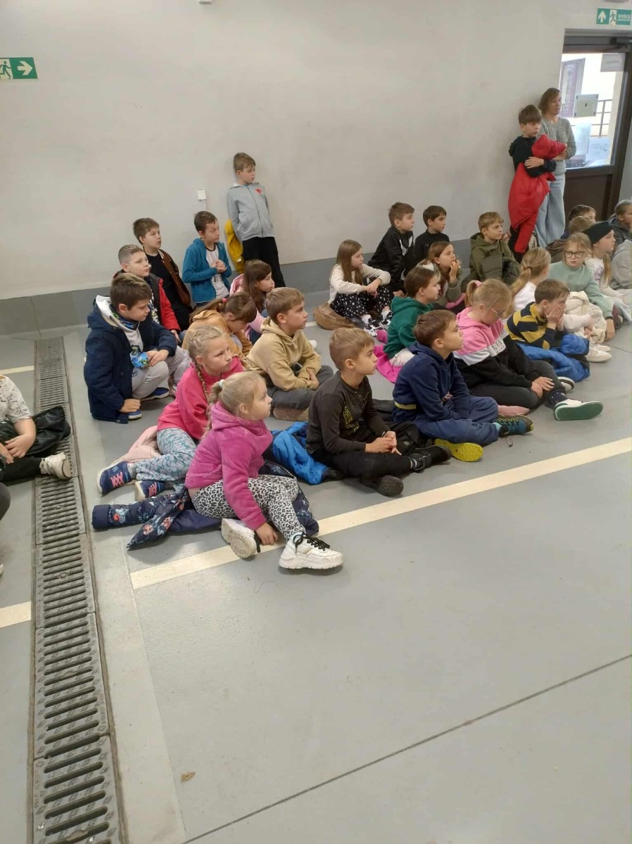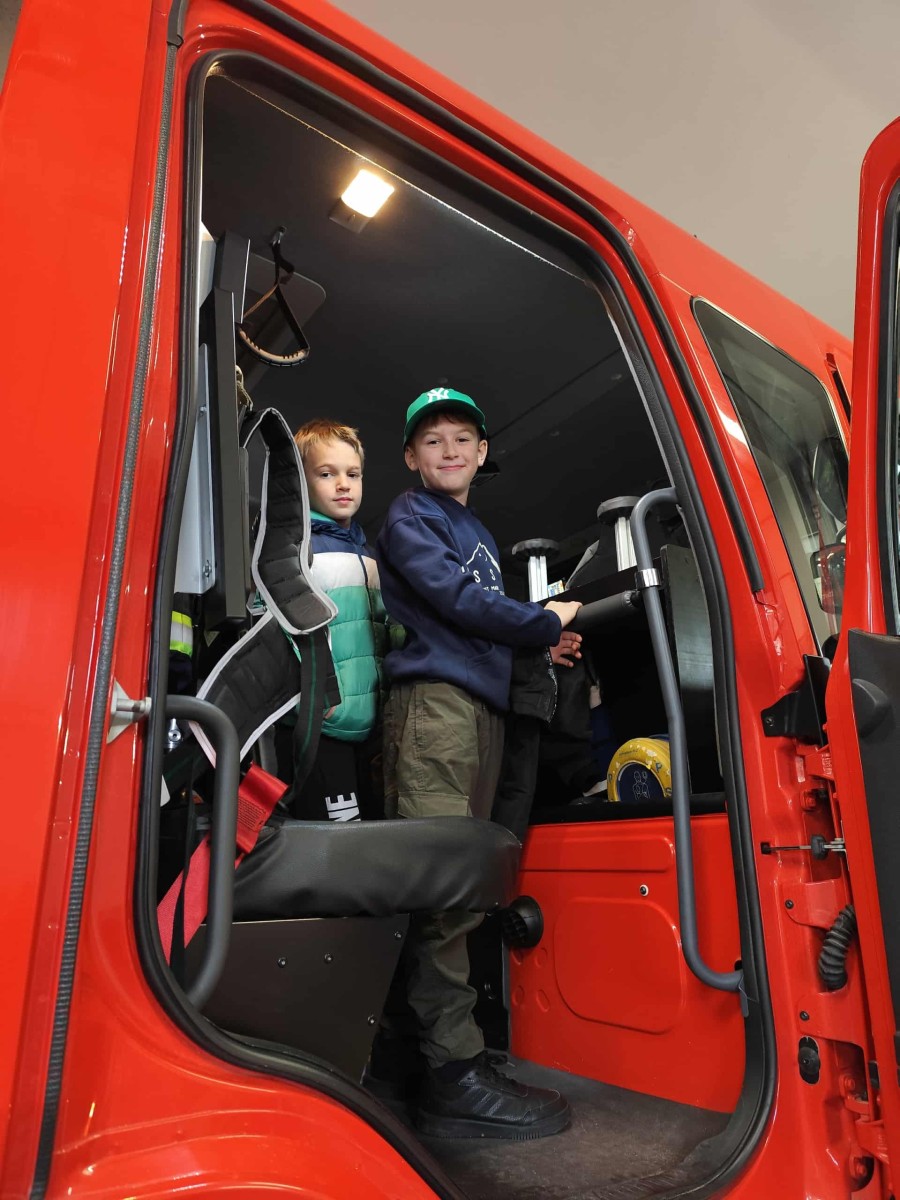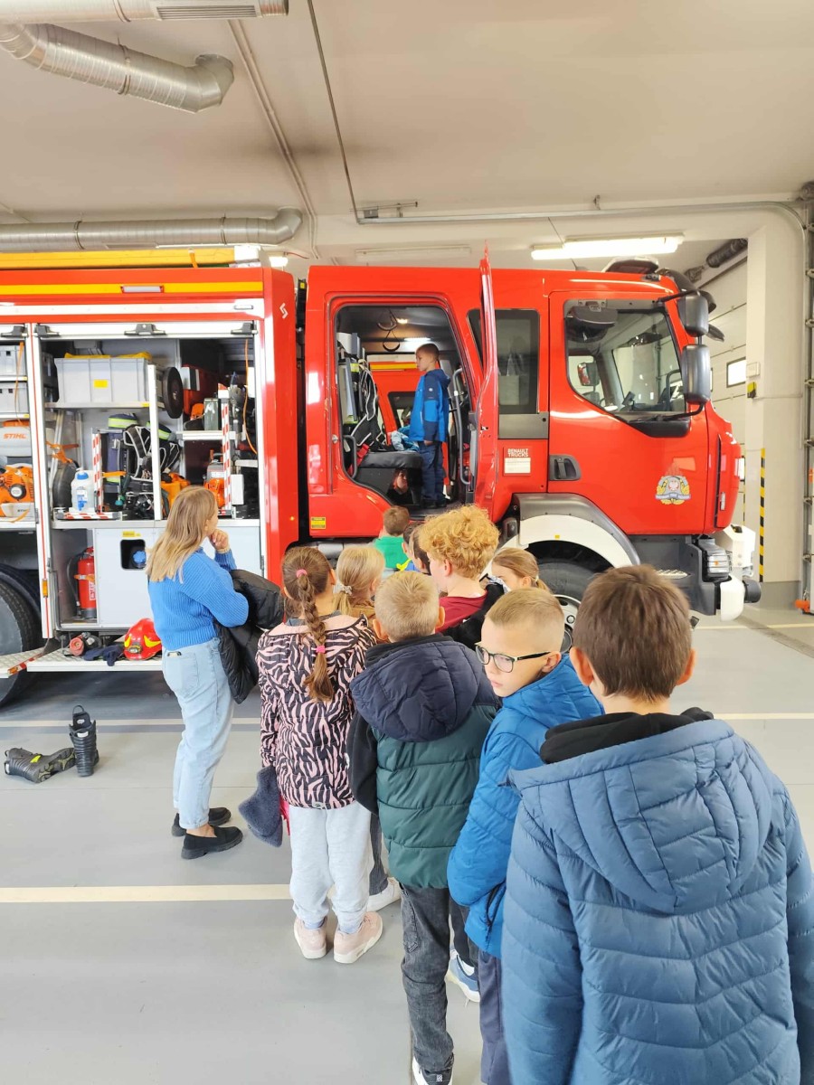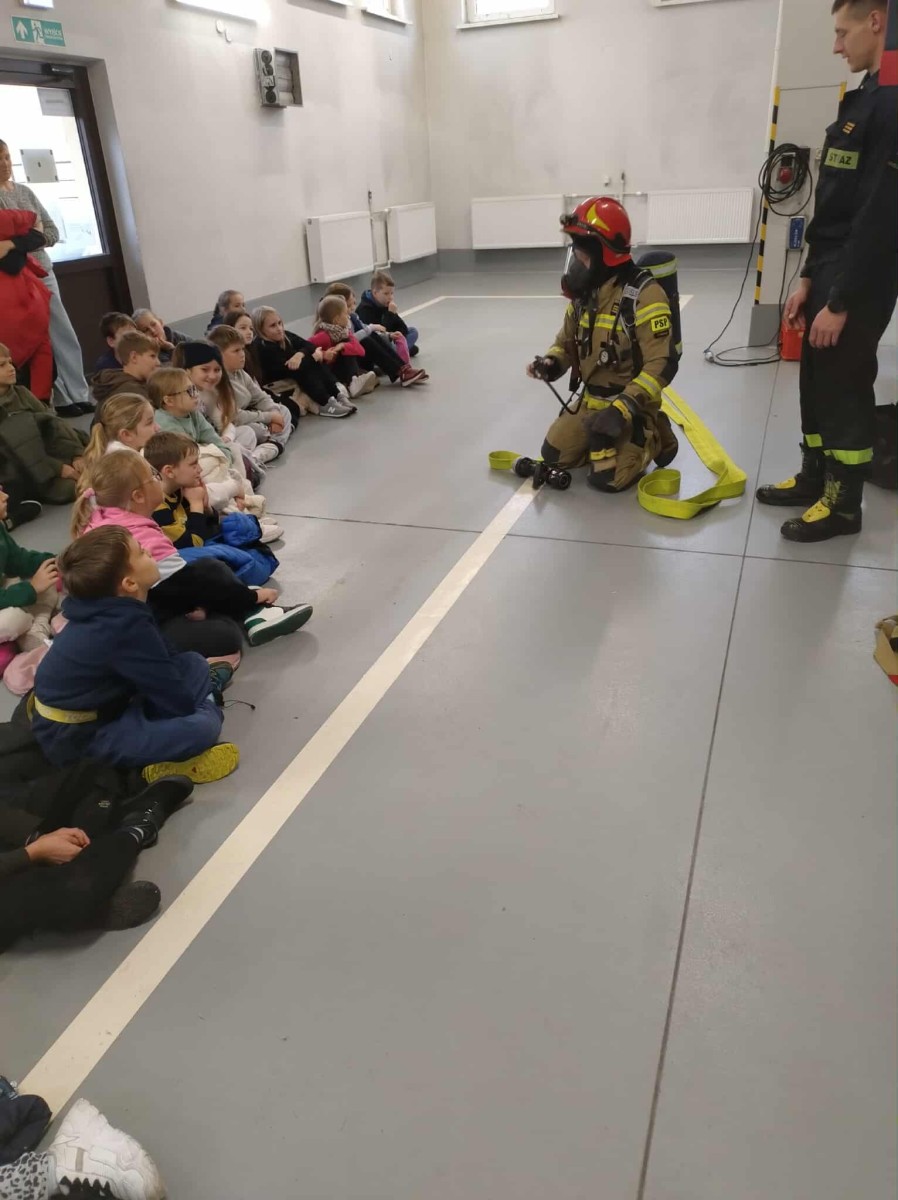 Dużym zainteresowaniem cieszył się także pokaz zjazdu po strażackiej rurze, który wzbudził prawdziwy zachwyt wśród uczniów. Dzięki wizycie dzieci dowiedziały się, jak odpowiedzialna i wymagająca jest praca strażaka, a także jak ważne jest przestrzeganie zasad bezpieczeństwa w codziennym życiu. Spotkanie zakończyło się wspólnym zdjęciem i gromkimi brawami dla naszych lokalnych bohaterów.