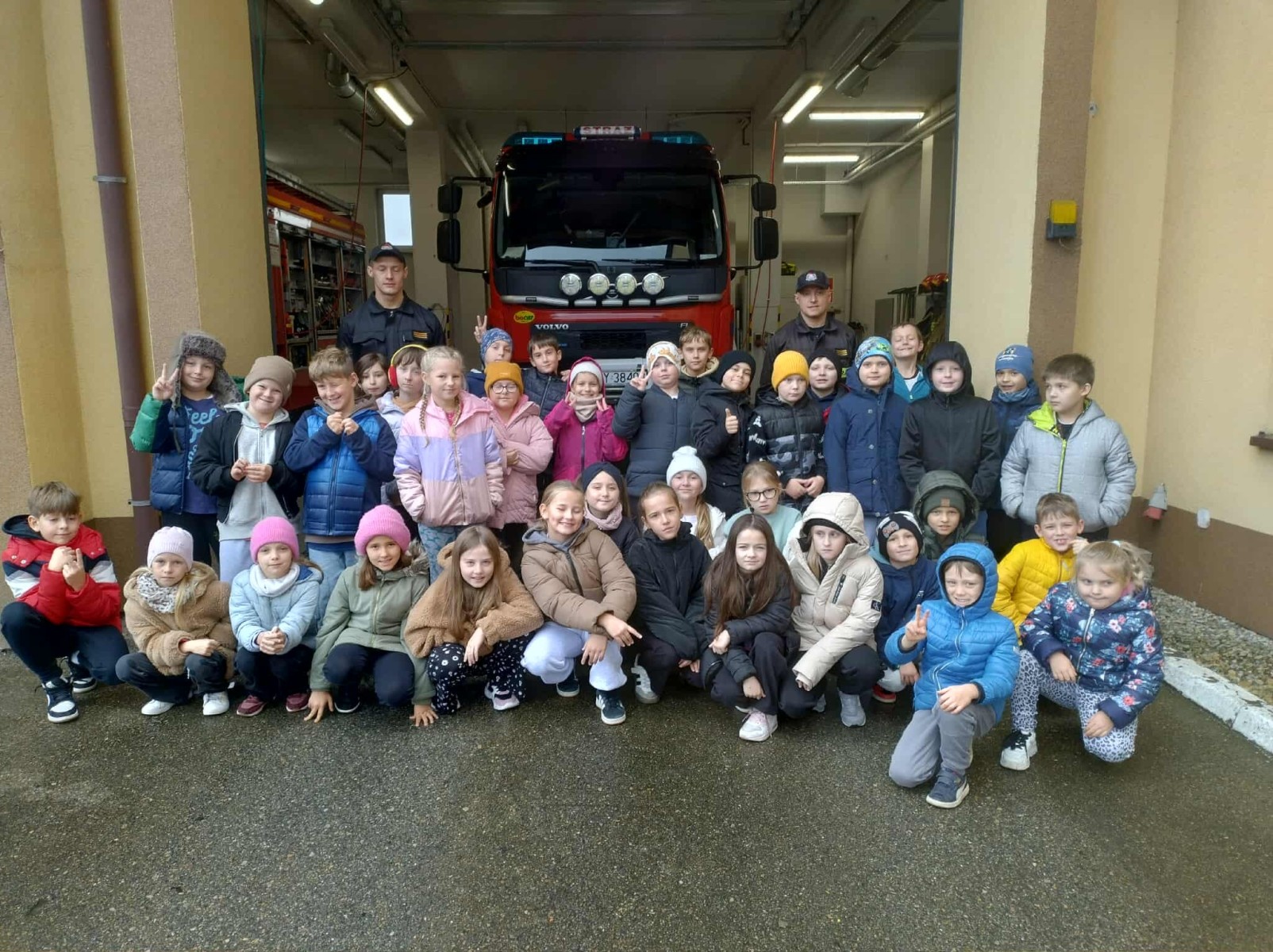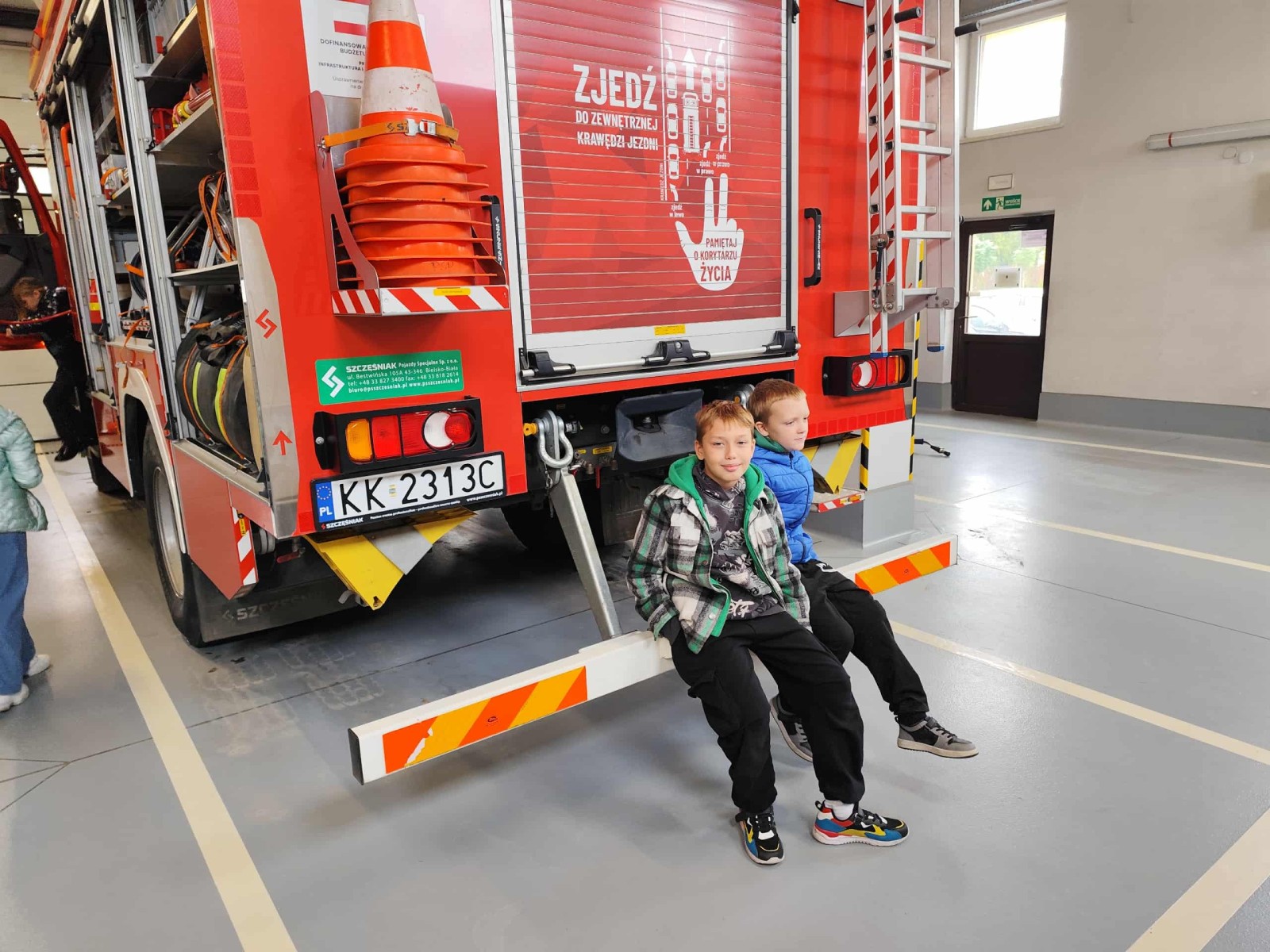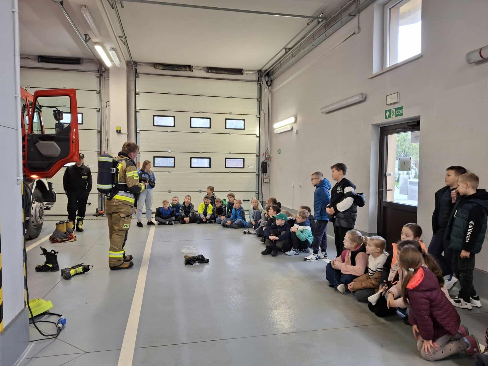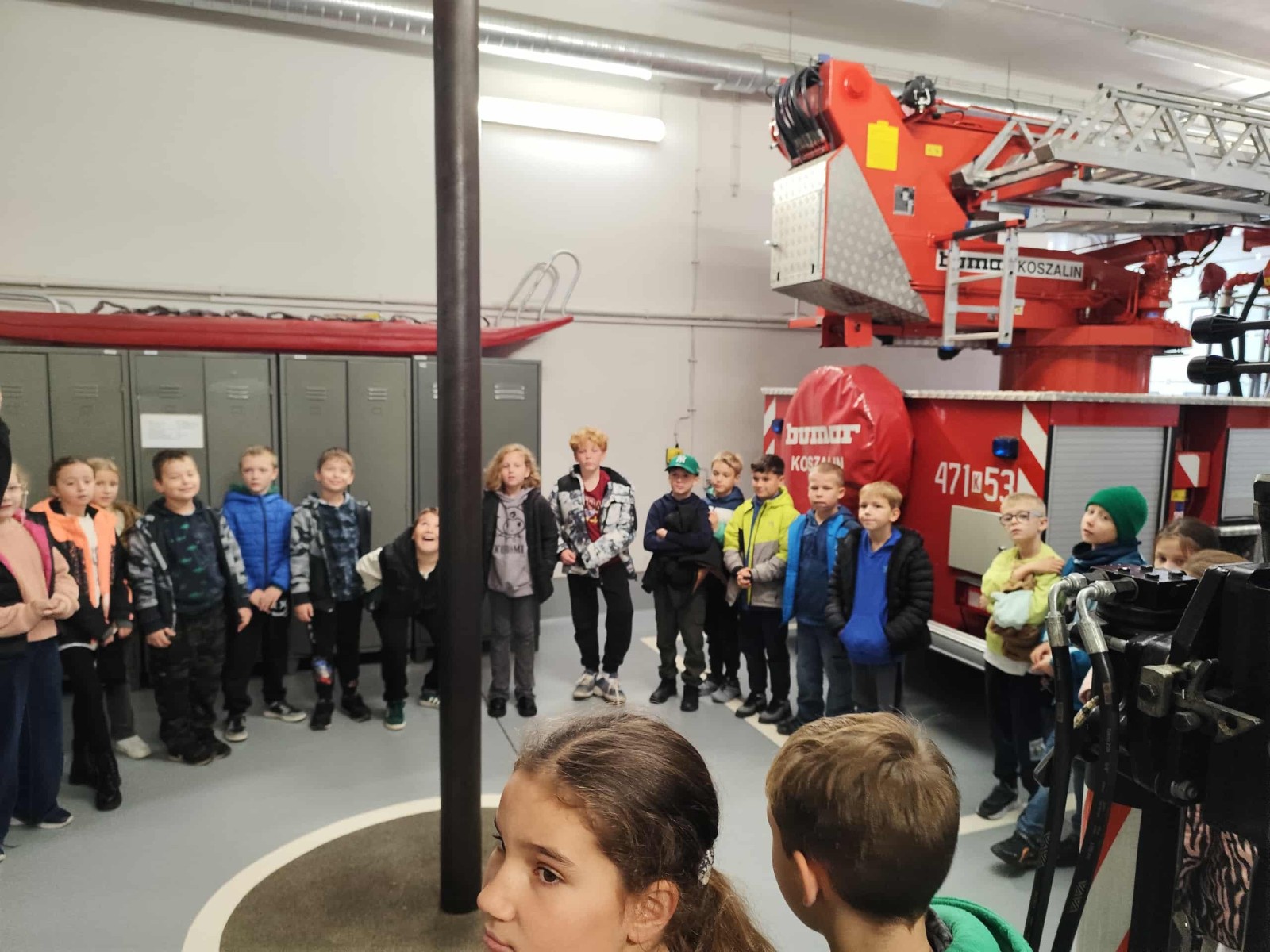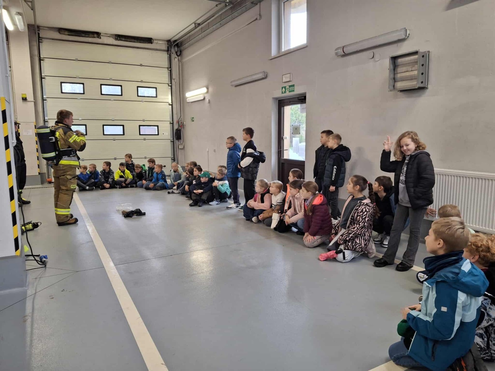 Dużym zainteresowaniem cieszył się także pokaz zjazdu po strażackiej rurze, który wzbudził prawdziwy zachwyt wśród uczniów. Dzięki wizycie dzieci dowiedziały się, jak odpowiedzialna i wymagająca jest praca strażaka, a także jak ważne jest przestrzeganie zasad bezpieczeństwa w codziennym życiu. Spotkanie zakończyło się wspólnym zdjęciem i gromkimi brawami dla naszych lokalnych bohaterów.