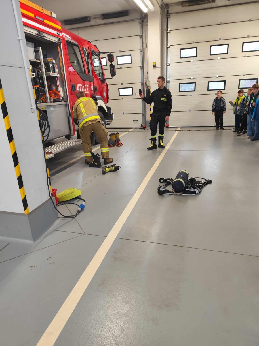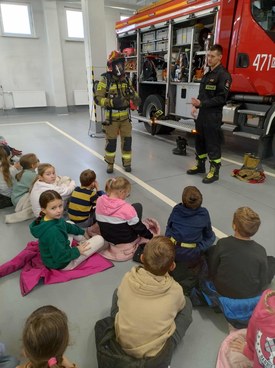 Wczoraj uczniowie naszej szkoły mieli niezwykłą okazję odwiedzić Państwową Straż Pożarną w Myślenicach. Celem wycieczki było poznanie zawodu strażaka, jego codziennej pracy oraz zasad bezpieczeństwa. Podczas wizyty strażacy opowiedzieli uczniom o swoich obowiązkach, pokazali nowoczesne wozy strażackie oraz sprzęt, który wykorzystują w akcjach ratunkowych. Dzieci mogły z bliska zobaczyć, jak wygląda profesjonalny strój strażaka i przekonać się, jak szybko potrafią go założyć w sytuacji alarmowej.