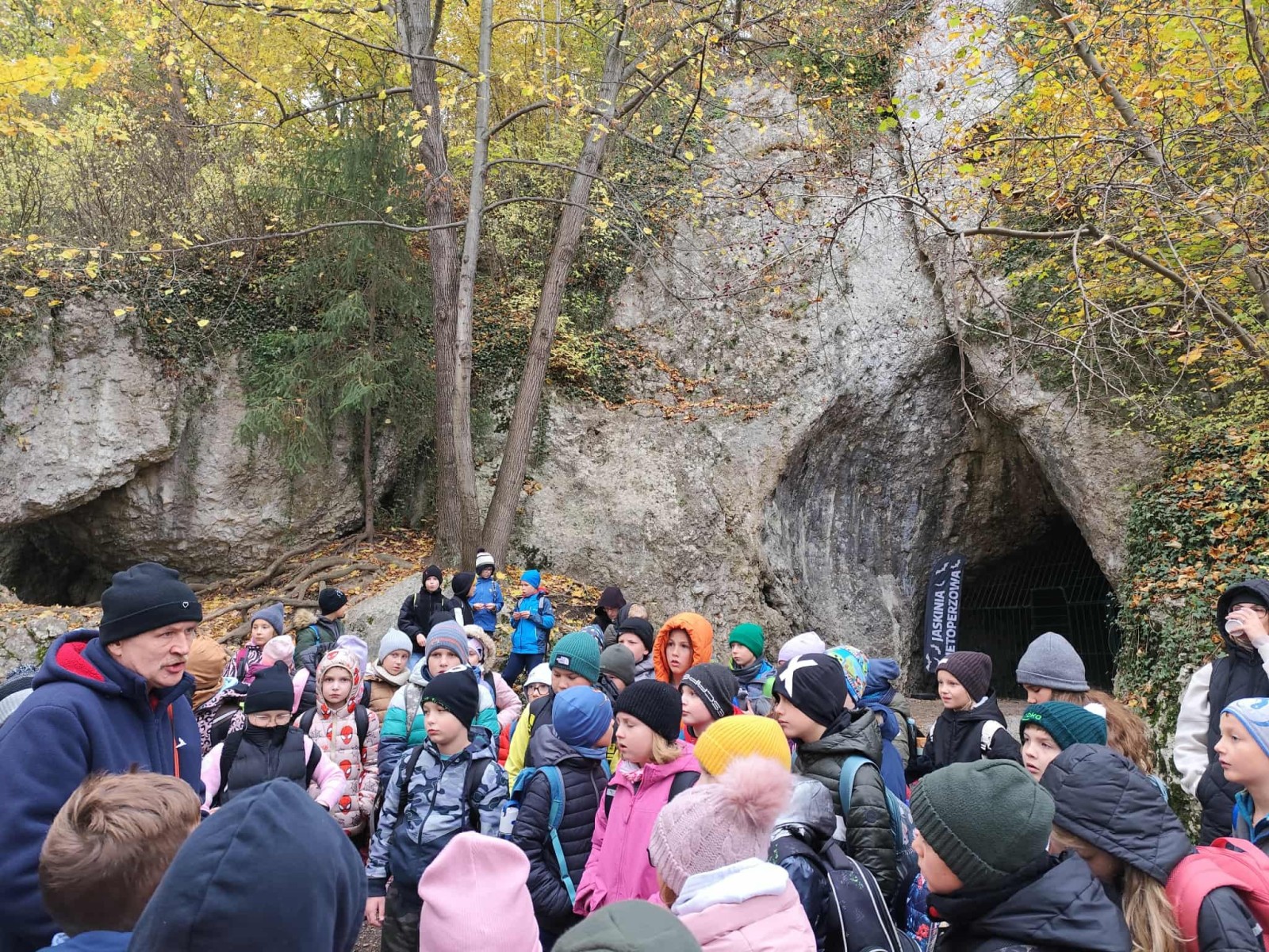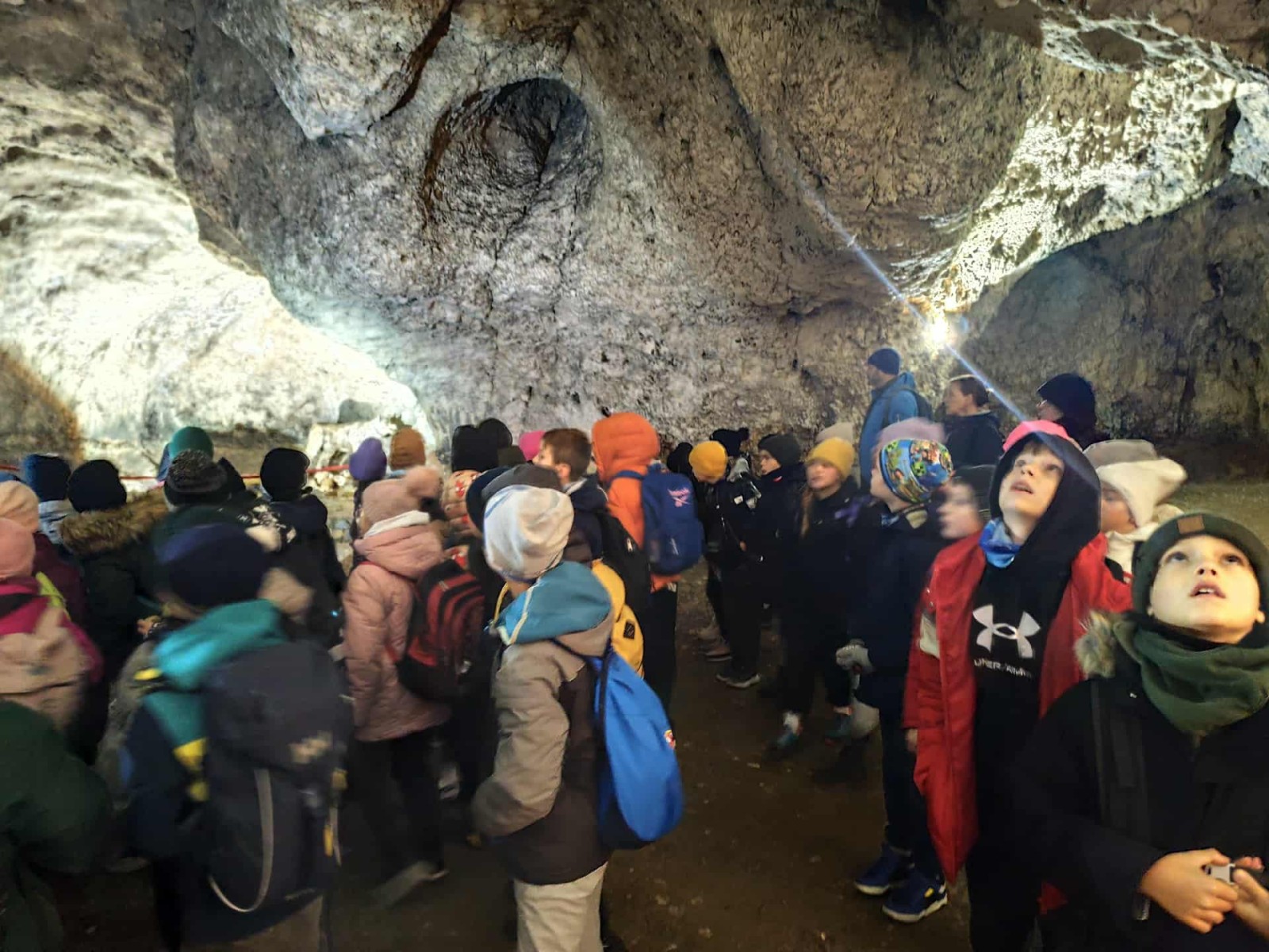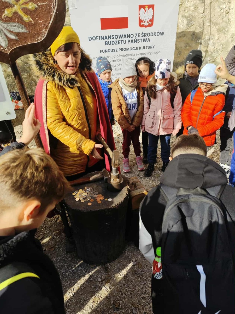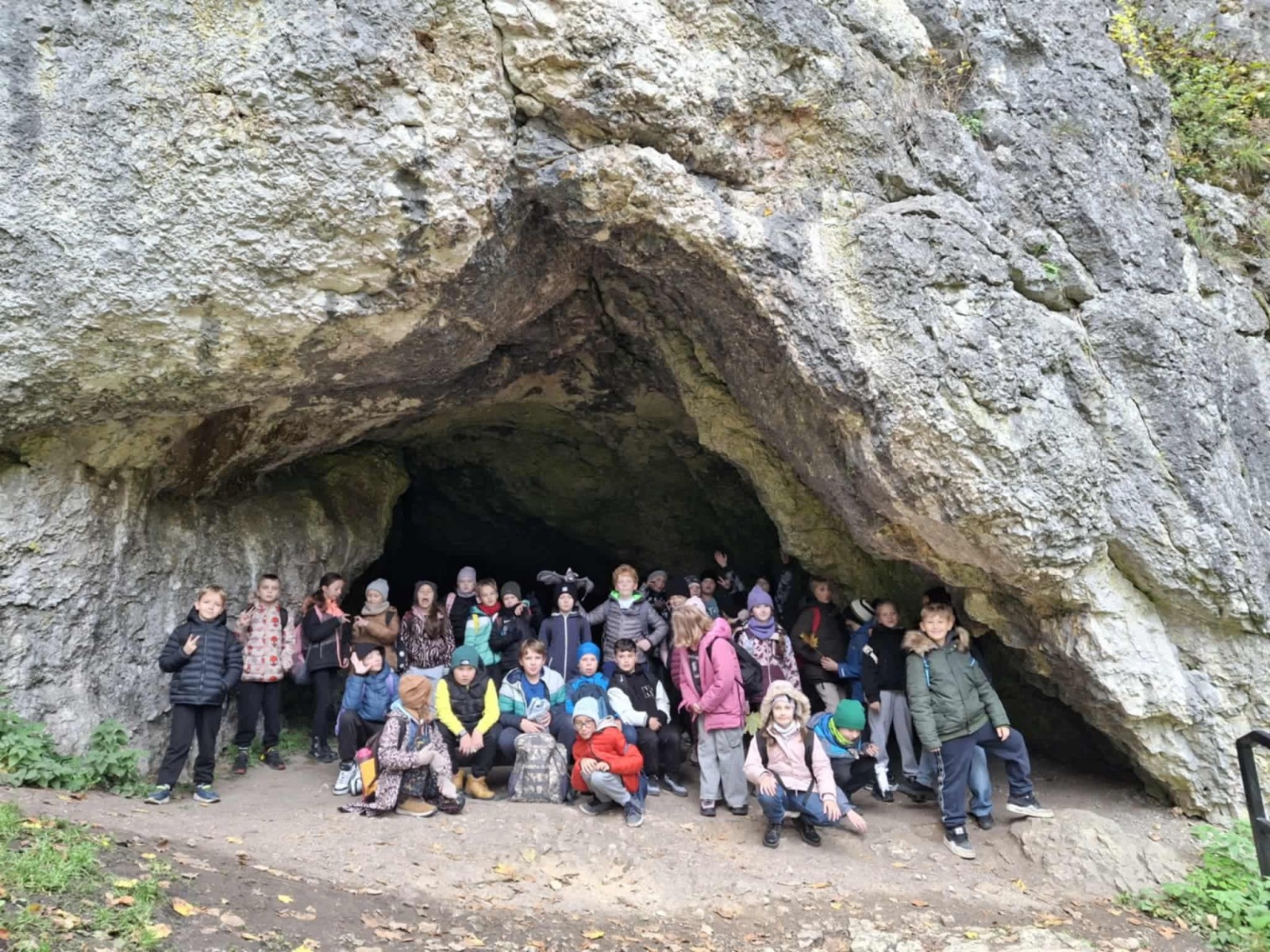 Pierwszym punktem programu była Jaskinia Nietoperzowa, położona niedaleko Jerzmanowic. Przewodnik opowiedział dzieciom o historii jaskini i o tym, że dawno temu mieszkali tam ludzie pierwotni i prehistoryczne zwierzęta. Uczniowie dowiedzieli się także, że jaskinia wzięła swoją nazwę od licznych nietoperzy, które mają tam swoje zimowe schronienie. W środku panował chłód, ale mogliśmy podziwiać piękne formacje skalne – stalaktyty i stalagmity. Niektórzy po raz pierwszy widzieli taką jaskinię, więc było to dla nich bardzo ekscytujące przeżycie.