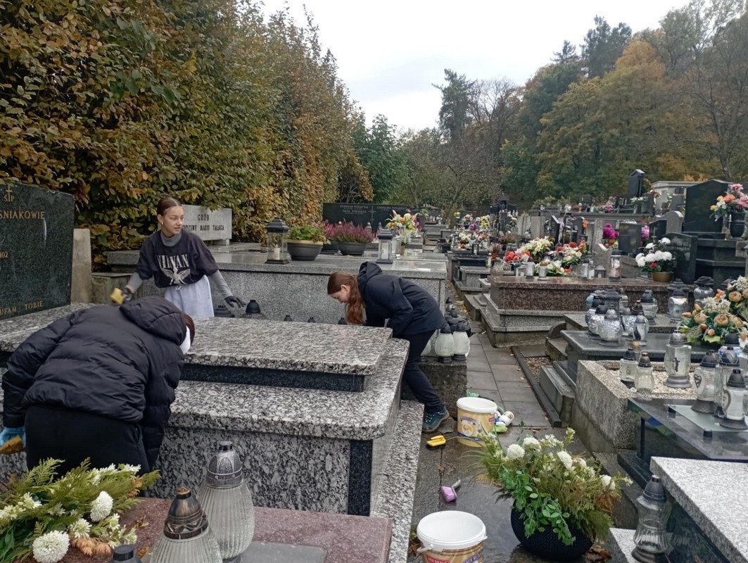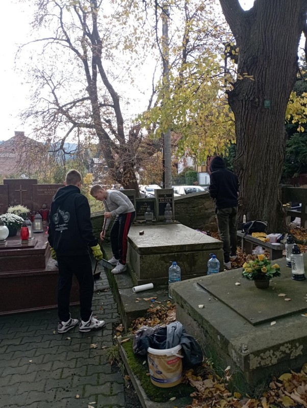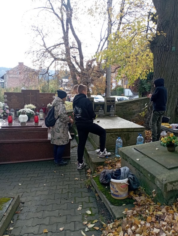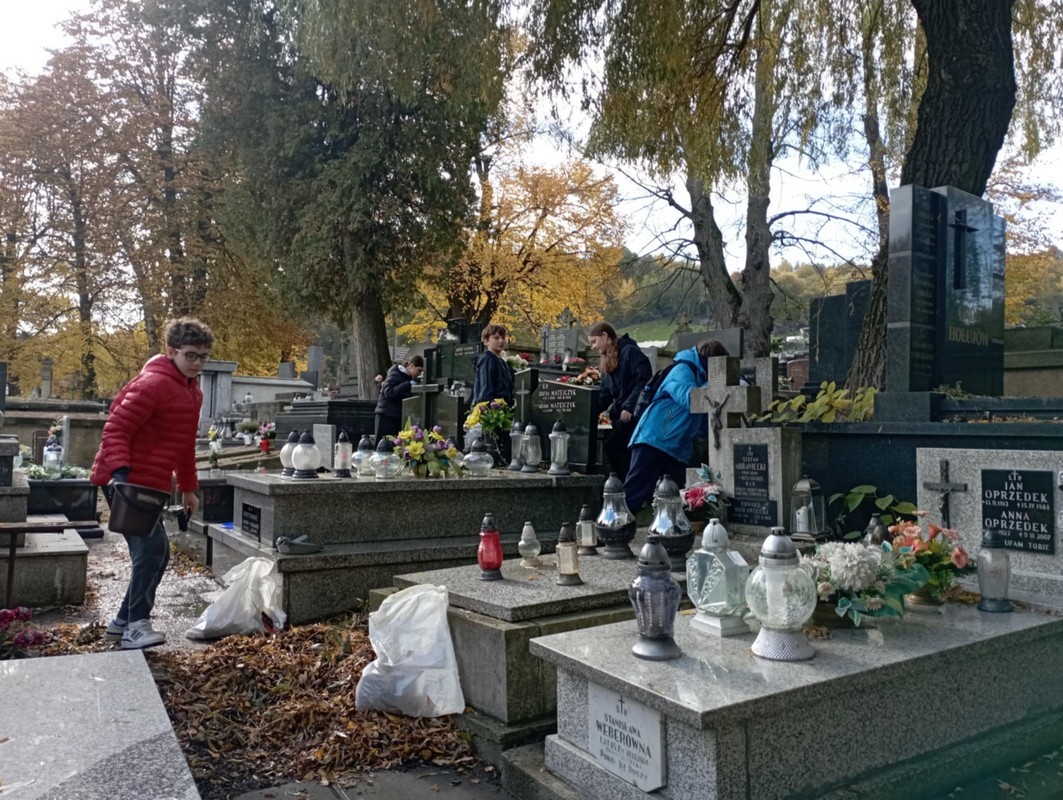 W słoneczny, ale chłodny poranek , 22 października, (obok kościółka św. Jakuba na Stradomiu) oraz w czwartek, 23 października, (na cmentarzu komunalnym w Myślenicach-Polance) grupa uczniów wraz z wychowawcami zgromadziła się na miejscu akcji. Wyposażeni w sprzęt, worki i środki czystości, z uśmiechem na twarzach zabrali się do pracy.