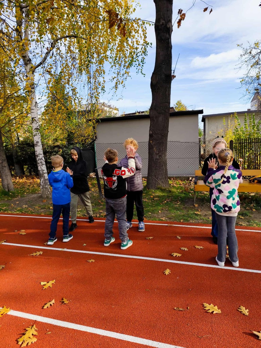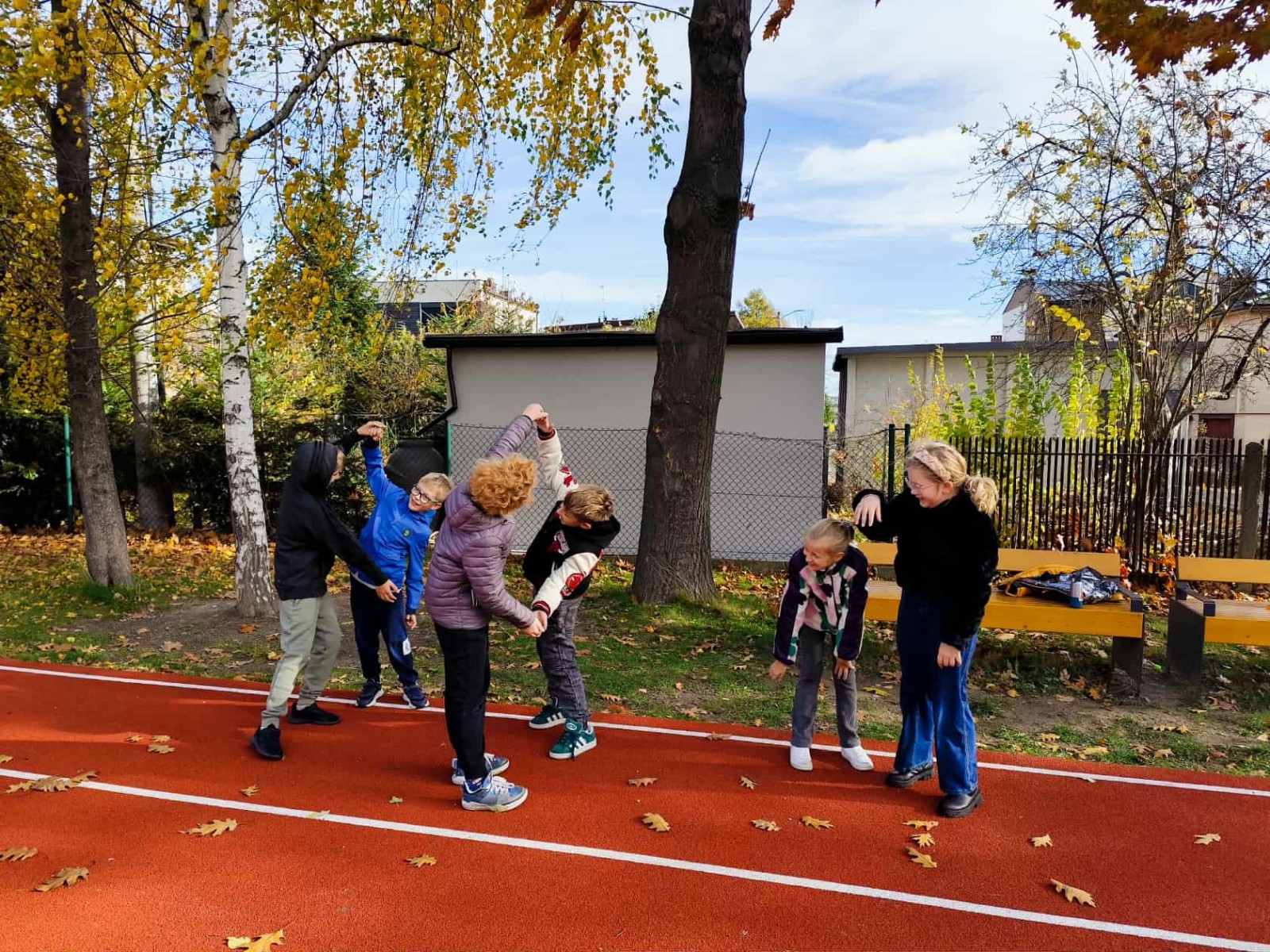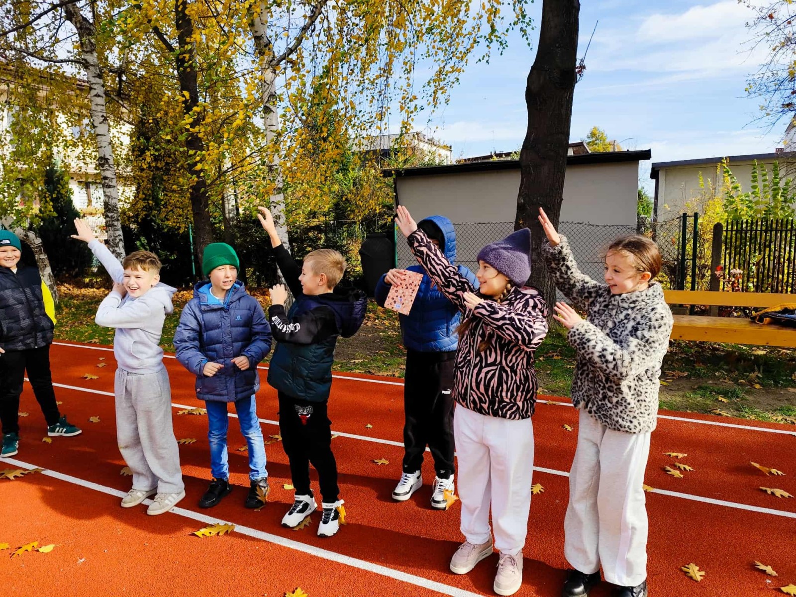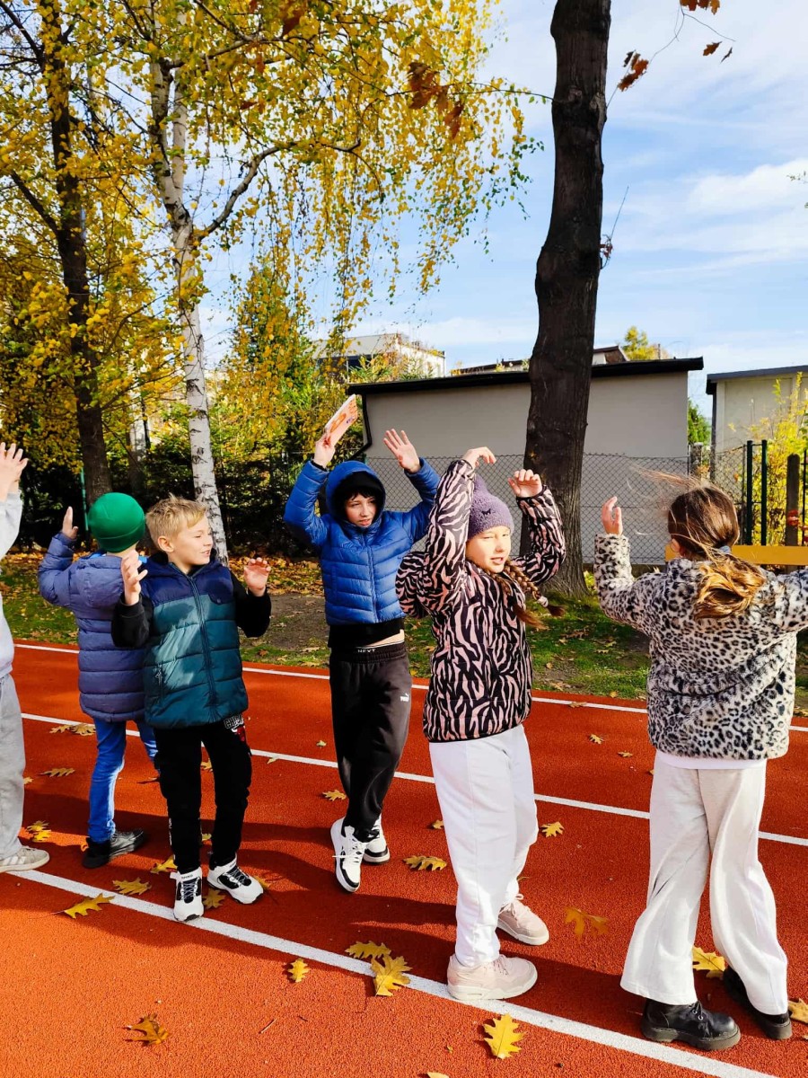 Jesienny taniec na świeżym powietrzu – „Wyginam śmiało ciało” – uczniowie z ogromnym entuzjazmem układali własne choreografie, łącząc ruch, muzykę i dobrą zabawę. Wspólne tańczenie na świeżym powietrzu dostarczyło wszystkim mnóstwo radości i pozytywnej energii!