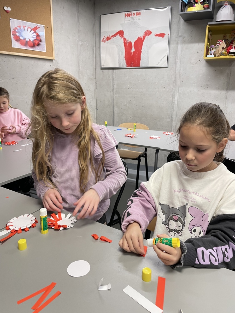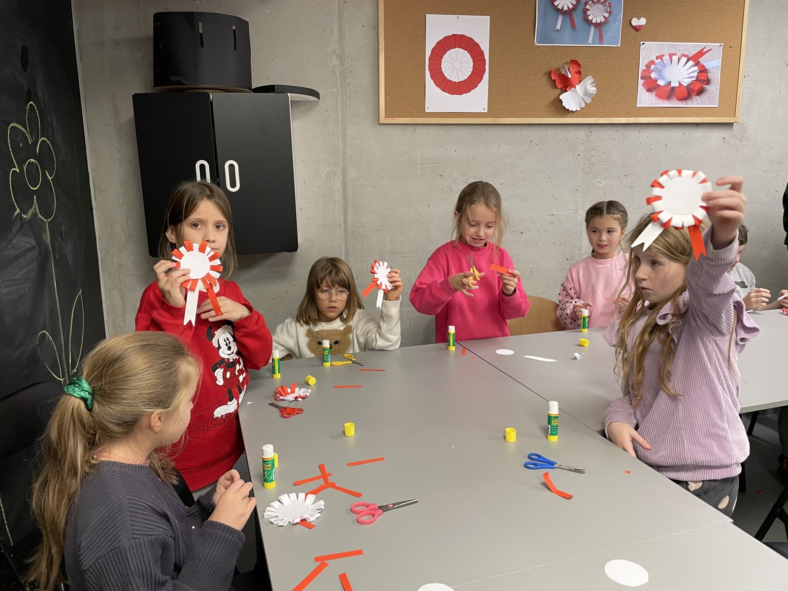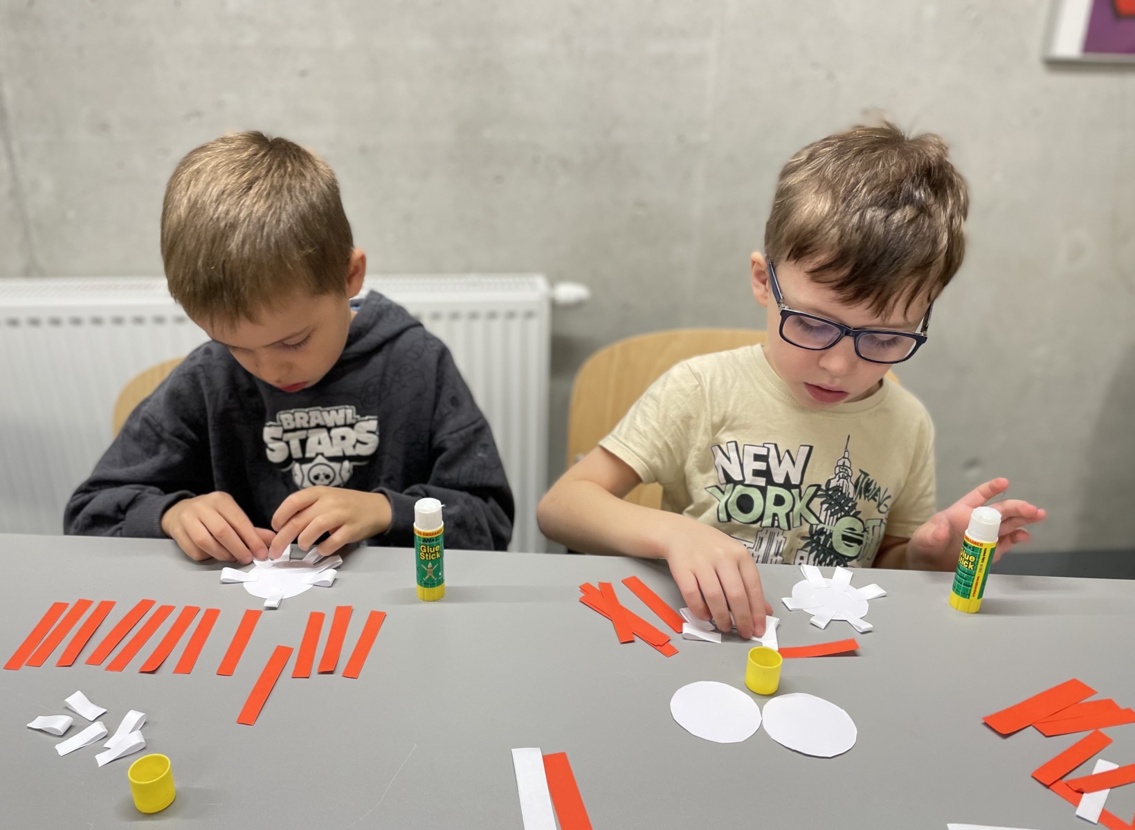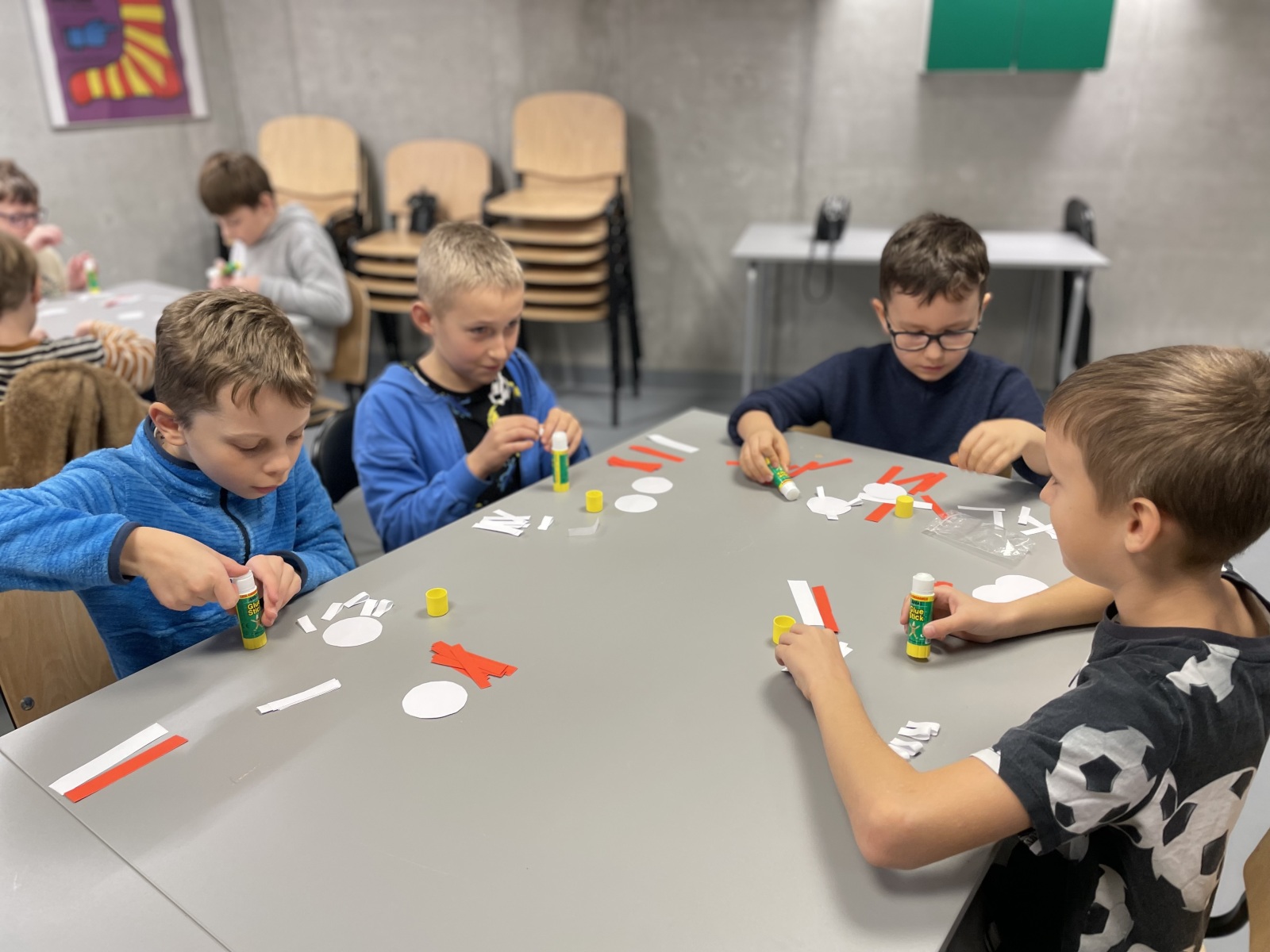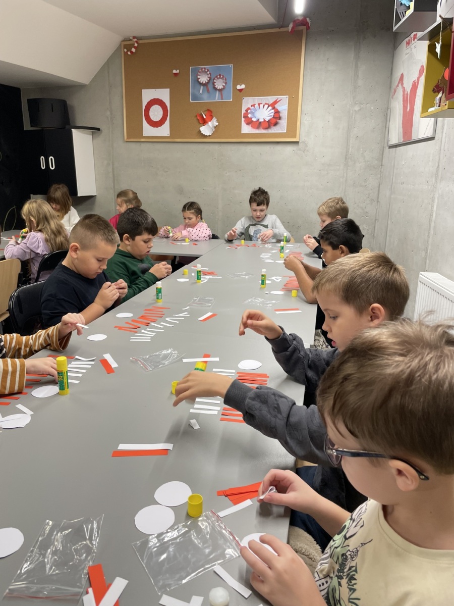 Zwieńczeniem zajęć były warsztaty plastyczne, podczas których uczniowie z dużym zaangażowaniem wykonywali biało-czerwone kokardy narodowe w oparciu o film instruktażowy. Każde dziecko starało się, by jego praca była jak najpiękniejsza.
