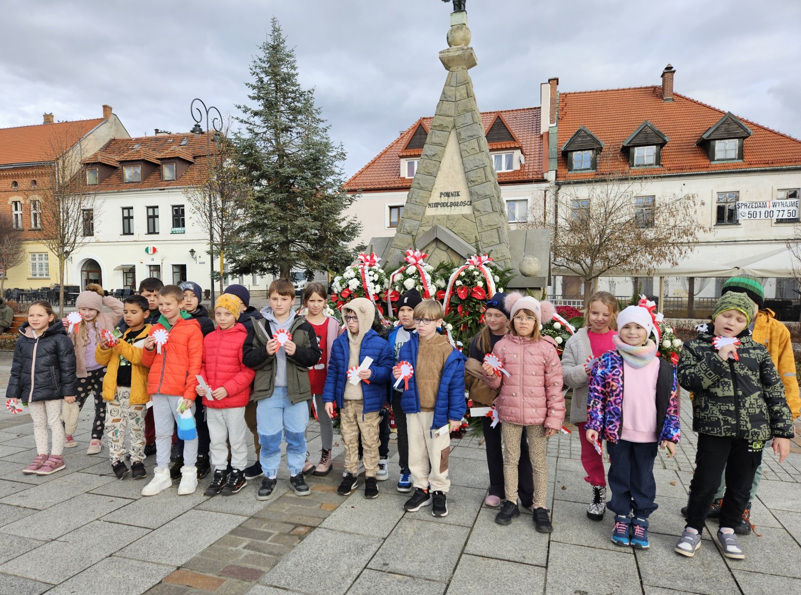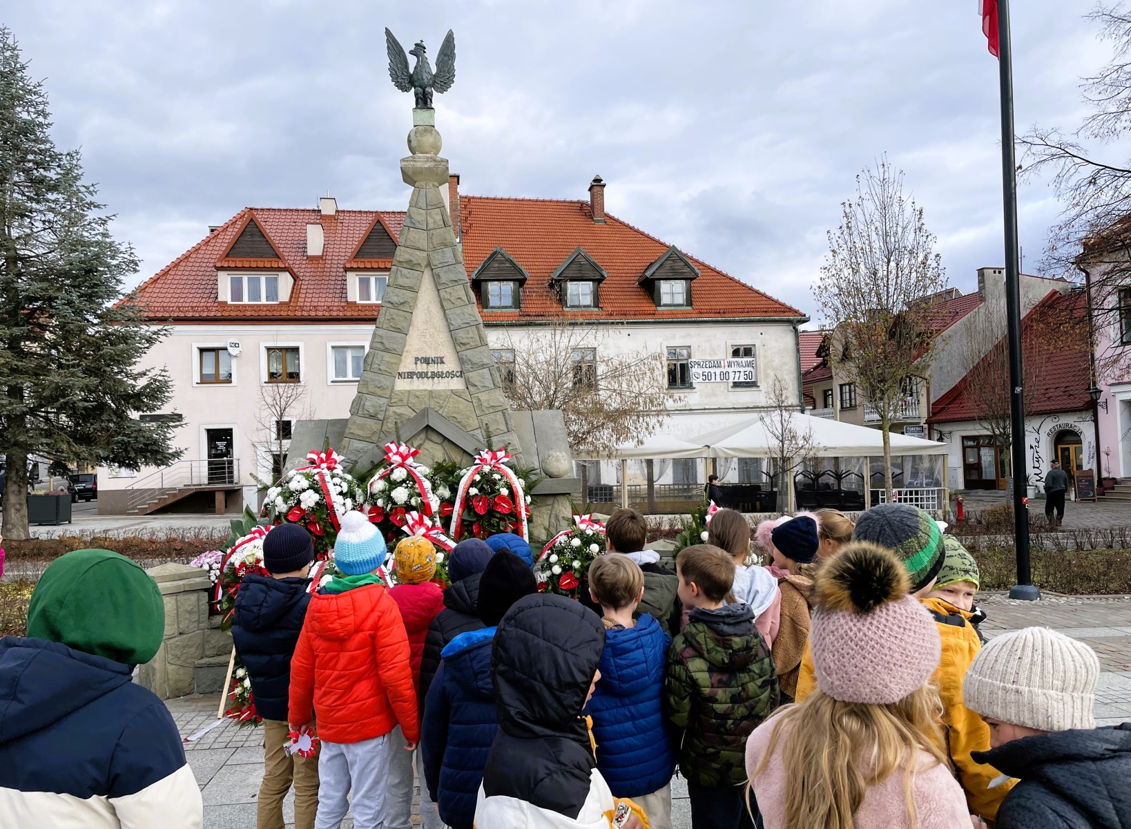 W drodze powrotnej do Dwójki uczniowie zatrzymali się przy Pomniku Niepodległości na myślenickim Rynku, gdzie zapalili znicze i w ciszy oddali hołd bohaterom, którzy walczyli o wolną Polskę. Dzielili się również wspomnieniami z obchodów 11 listopada – opowiadali o biało-czerwonych flagach, które wywiesili w swoich domach oraz o udziale w miejskich uroczystościach na rynku i we Mszy św. za Ojczyznę.