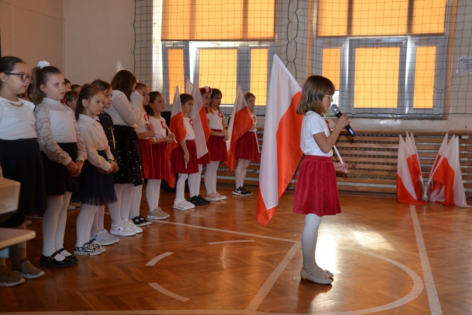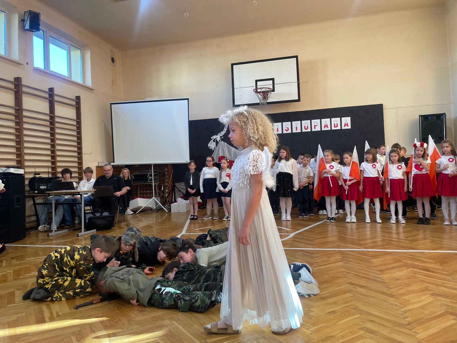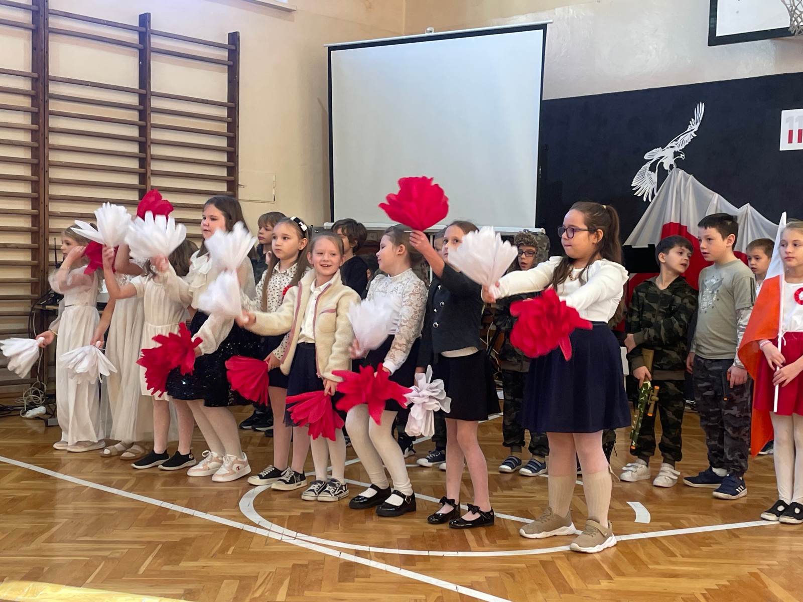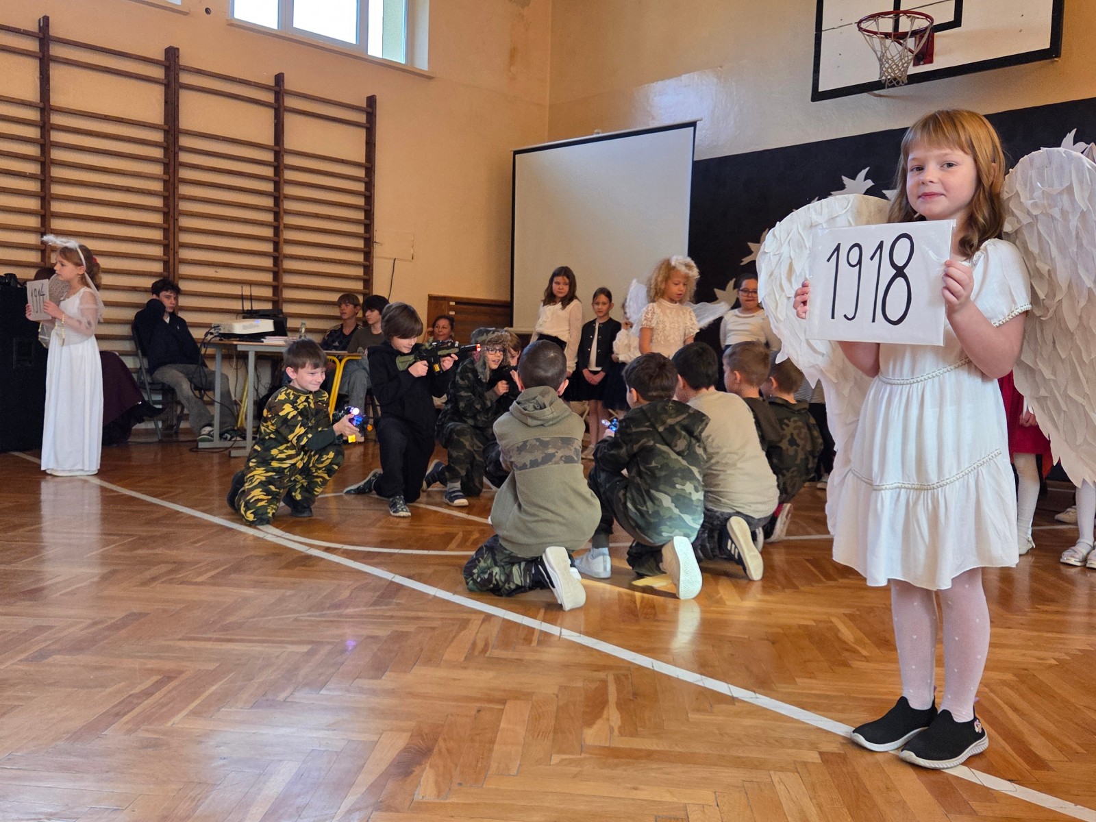 Młodzi artyści z klas 2c i 2d z ogromnym zaangażowaniem śpiewali pieśni i piosenki patriotyczne, recytowali wiersze oraz przedstawili dwie inscenizacje nawiązujące do wydarzeń z czasów walki o niepodległość. Towarzysząca im przejmująca muzyka oraz taniec z biało-czerwonymi flagami poruszyły serca zebranych.