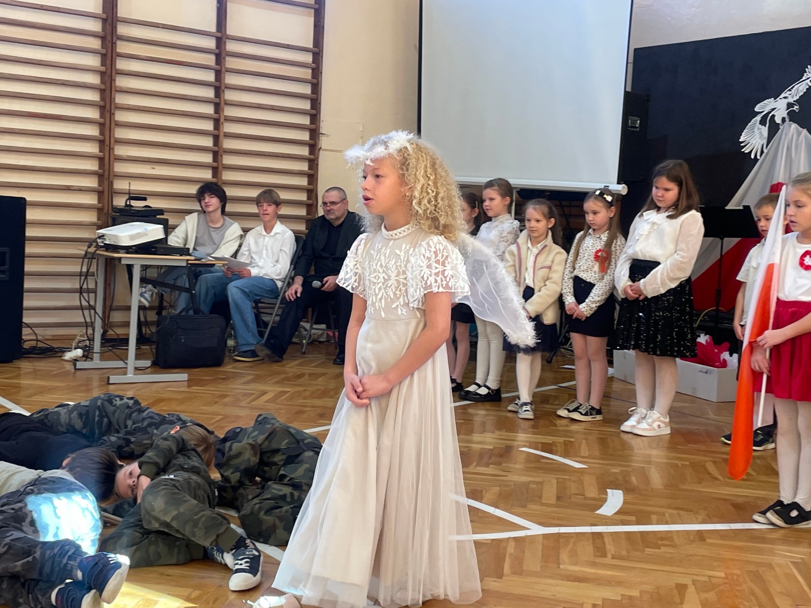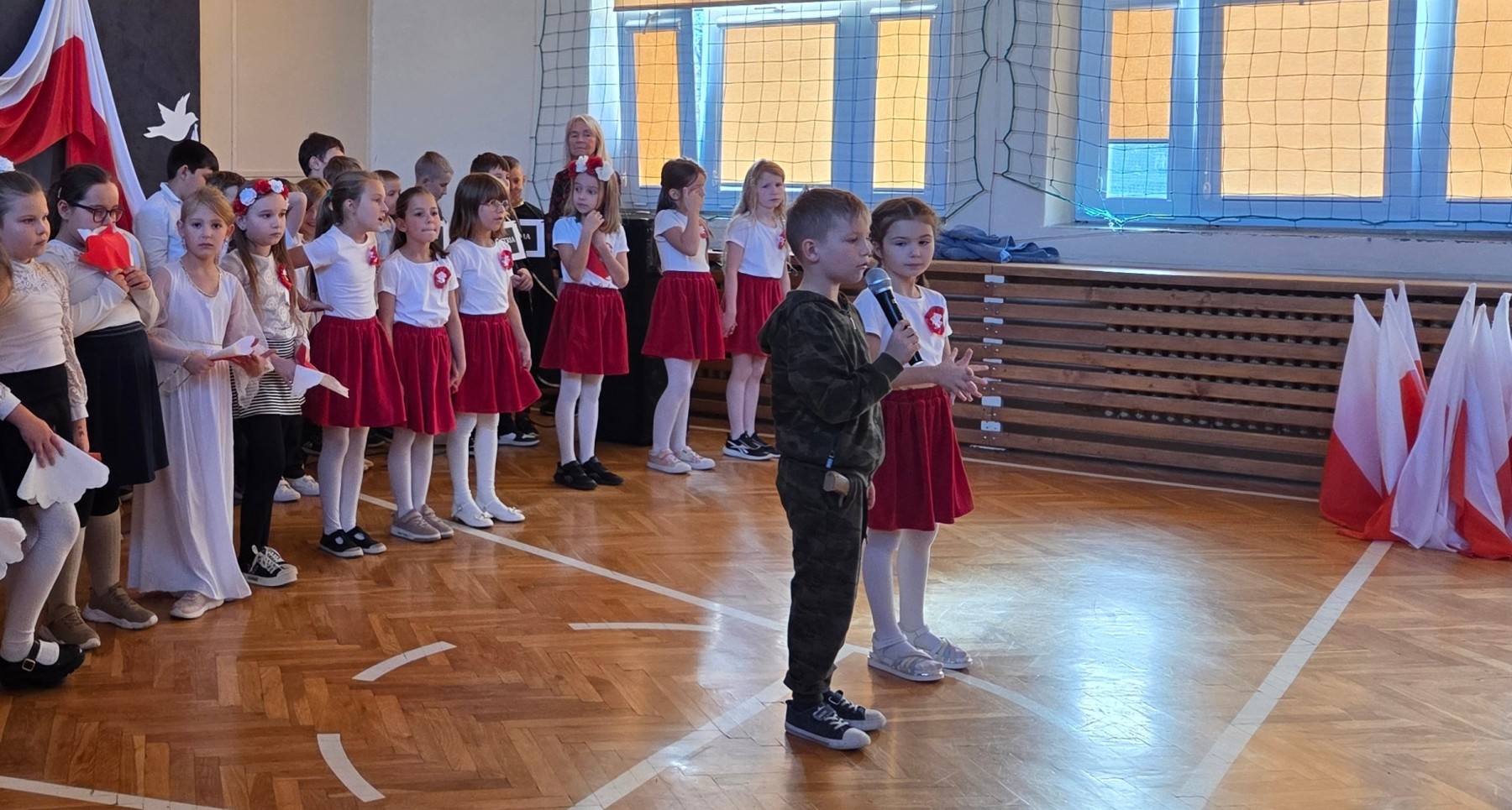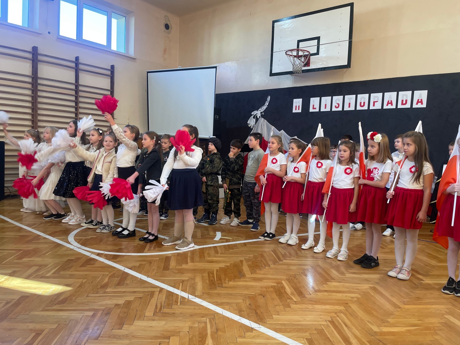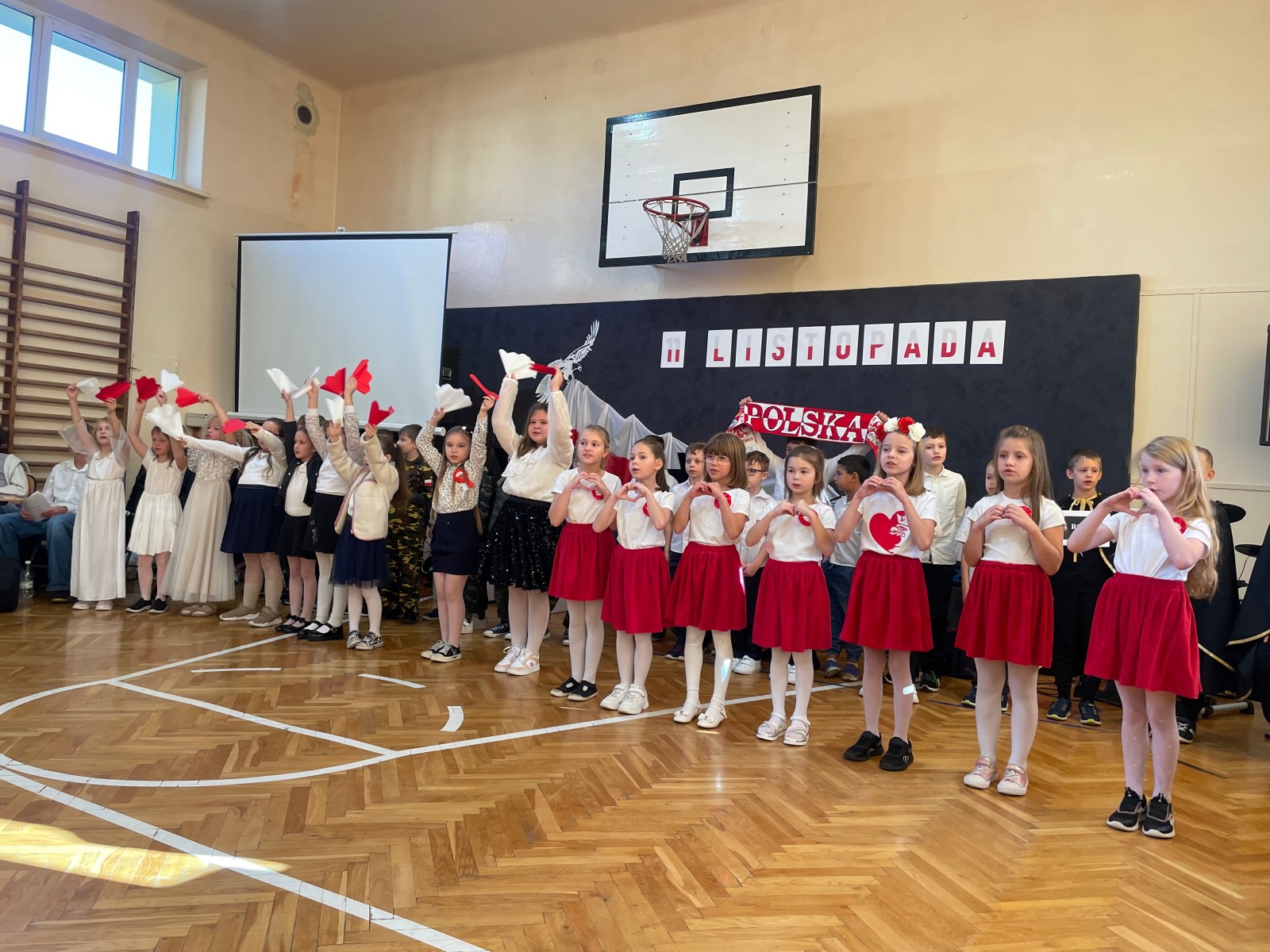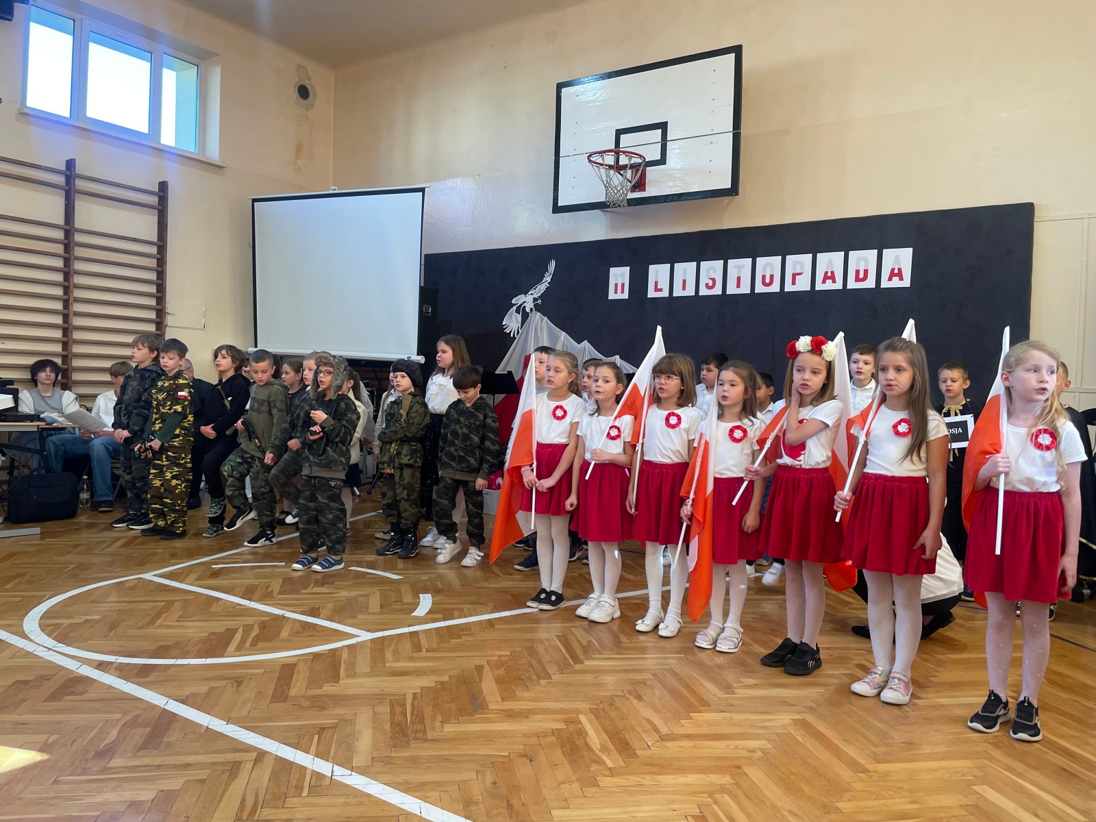 Młodzi artyści z klas 2c i 2d z ogromnym zaangażowaniem śpiewali pieśni i piosenki patriotyczne, recytowali wiersze oraz przedstawili dwie inscenizacje nawiązujące do wydarzeń z czasów walki o niepodległość. Towarzysząca im przejmująca muzyka oraz taniec z biało-czerwonymi flagami poruszyły serca zebranych.