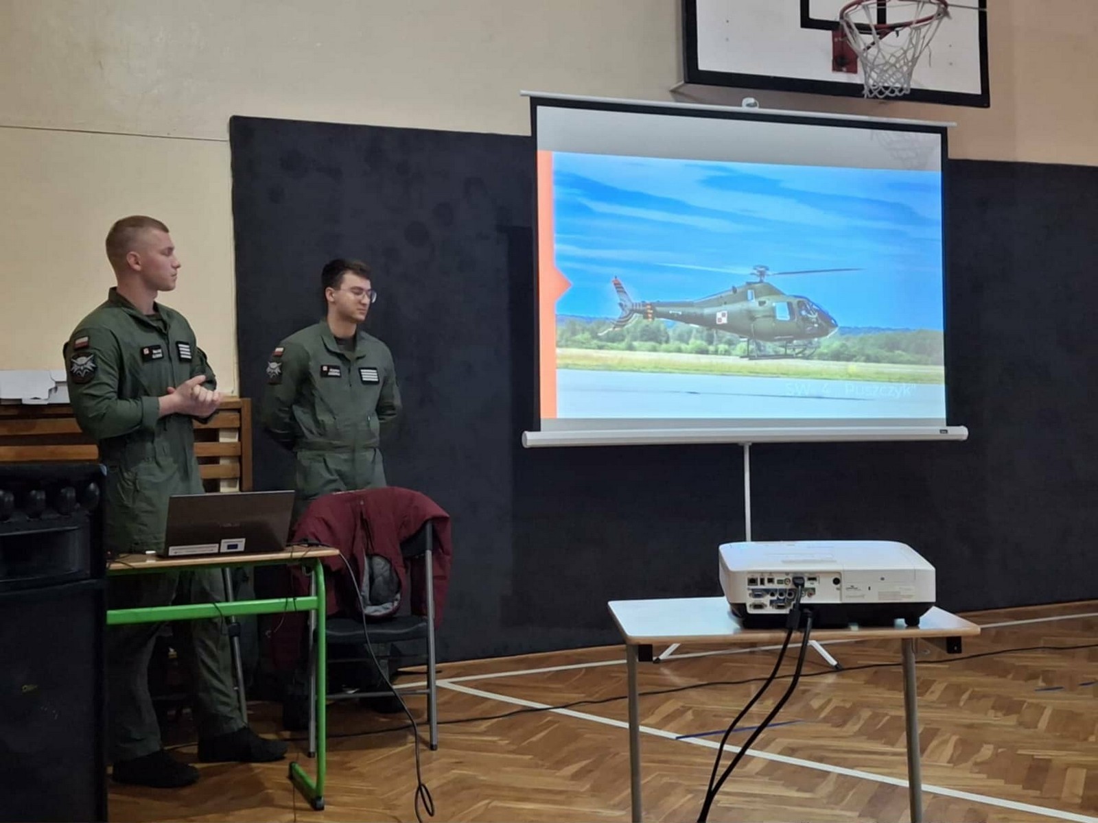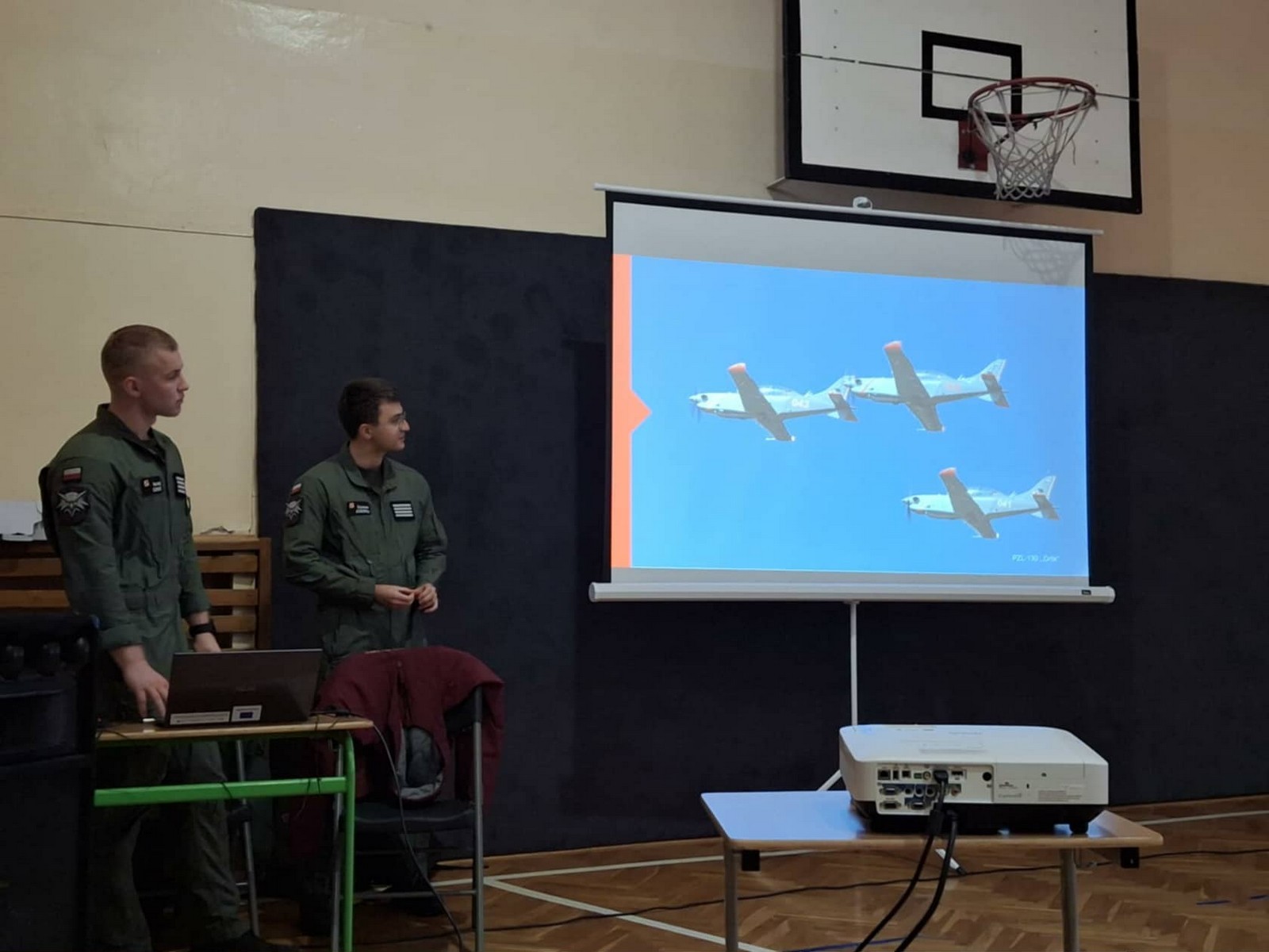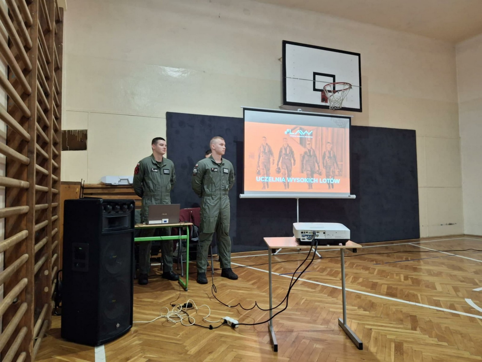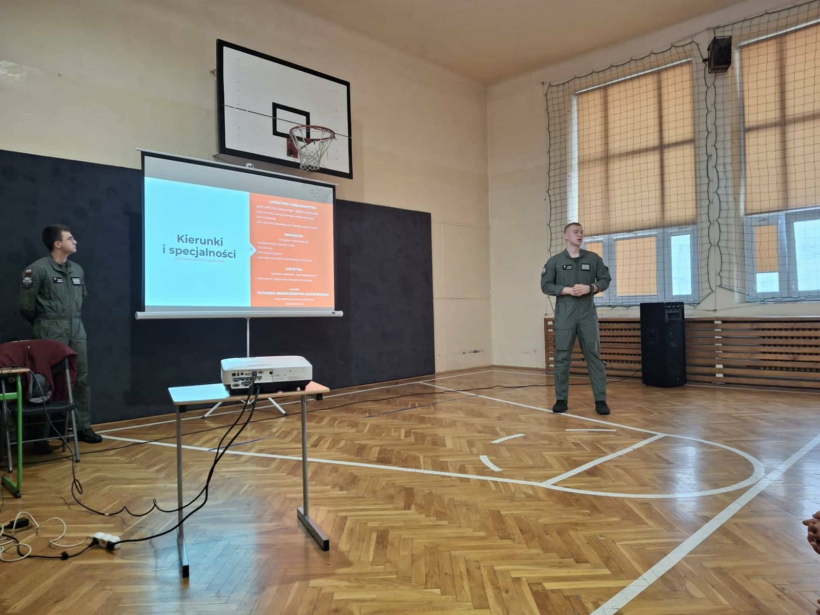 Trzech podchorążych przybliżyło uczniom tajniki swojej ścieżki edukacyjnej oraz realia służby w Siłach Powietrznych. Opowiedzieli o swojej codzienności, wymaganiach związanych z nauką w „Szkole Orląt” oraz o etapach przygotowania do zawodu pilota. Obalili wiele mitów dotyczących rekrutacji, treningu lotniczego oraz samej pracy w wojsku. Podkreślali, jak ważny jest świadomy wybór ścieżki zawodowej, odpowiedzialność i pasja do lotnictwa. Uczniowie mogli również poznać prestiż i rangę zawodu pilota wojskowego oraz możliwości rozwoju zawodowego, jakie daje służba w lotnictwie.