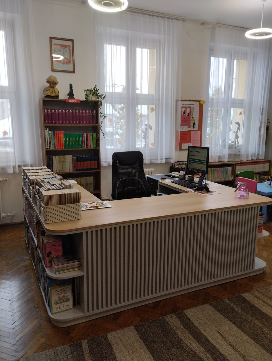 Uzupełnieniem zmian jest nowoczesna lada biblioteczna, która poprawia ergonomię pracy bibliotekarzy oraz estetykę całego pomieszczenia. Nowe stanowisko obsługi czytelnika jest bardziej funkcjonalne, wygodne i dostosowane do bieżących potrzeb użytkowników.