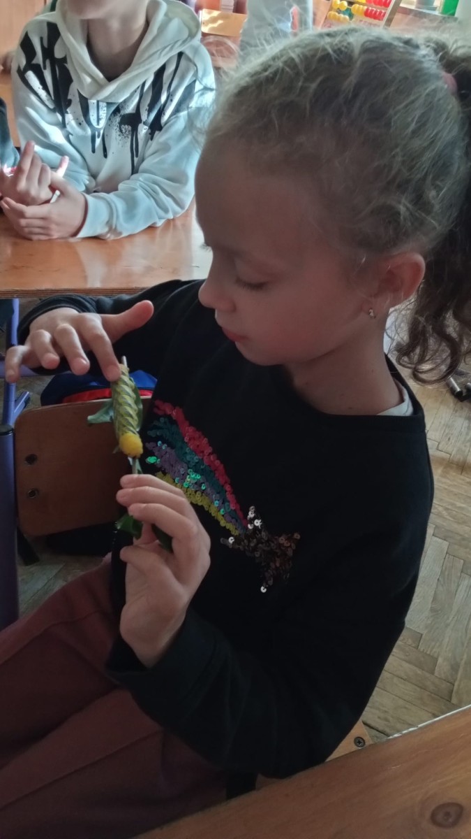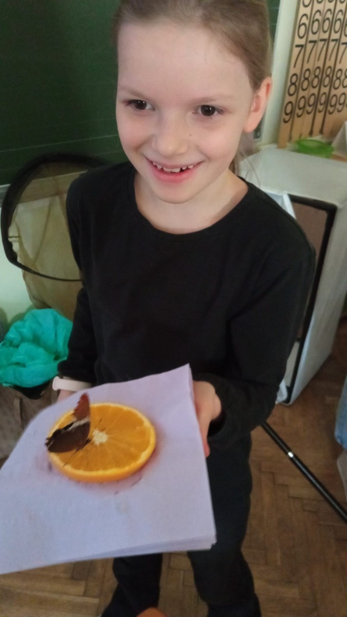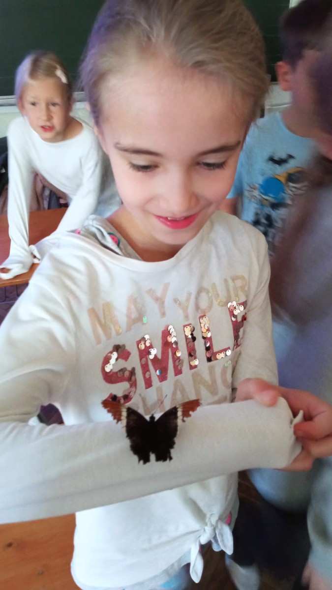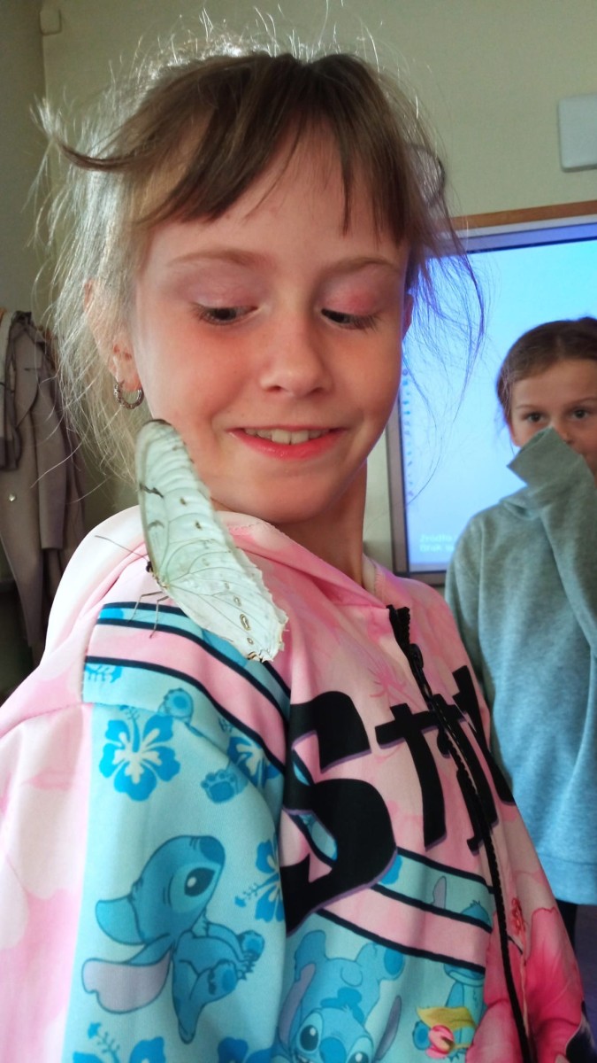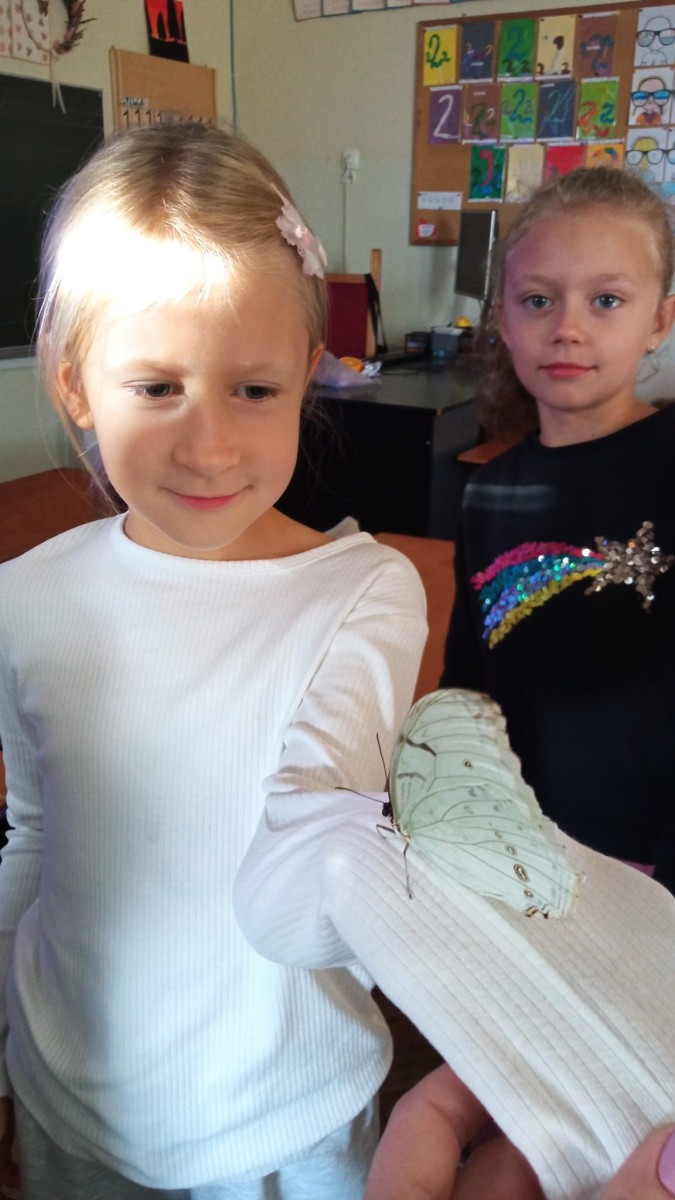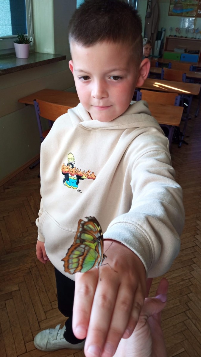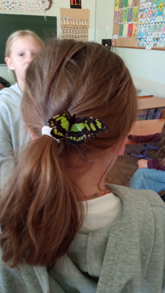 Nie była to jednak tylko lekcja multimedialna, ale również pokazu żywych stworzeń. Sala lekcyjna zamieniła się w motylarnię, gdzie każdy mógł aktywnie poznać motyle poprzez dotyk, nakarmienie ich oraz obserwację z bliska ich wyglądu. Dowiedzieliśmy się w jaki sposób hoduje się motyle, aby imitując ich naturalne środowisko, poznaliśmy różnorodność ich gatunku oraz proces przemiany z gąsienicy w poczwarkę, a następnie w pięknego motyla.