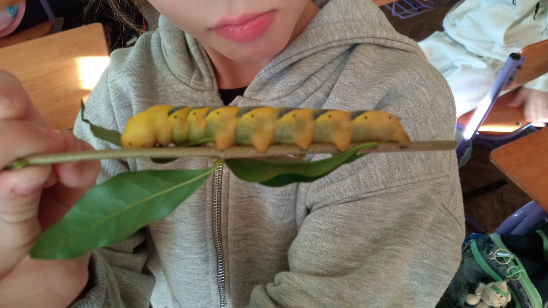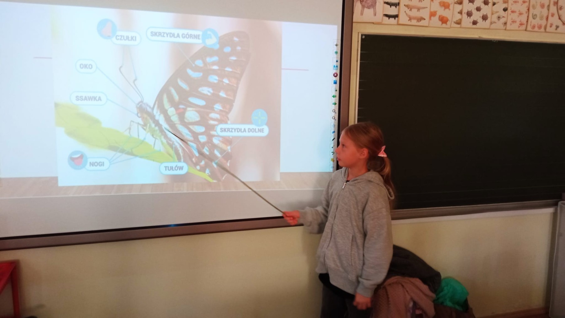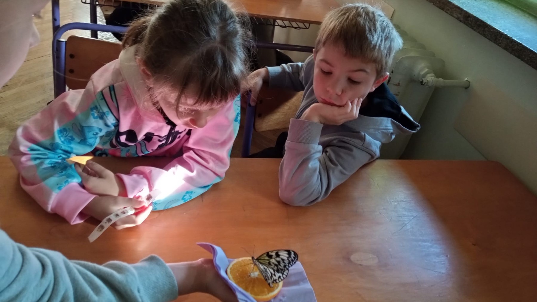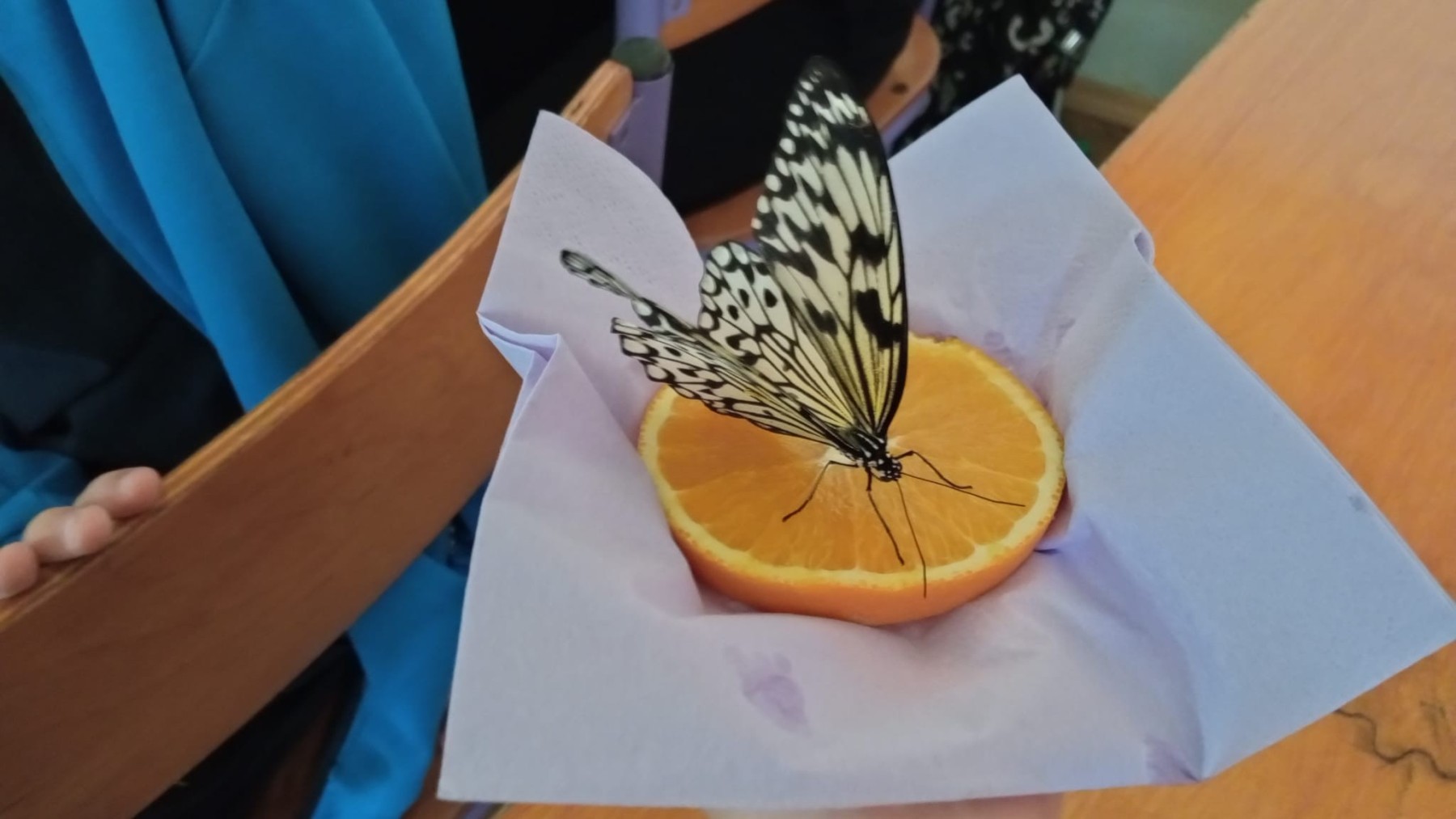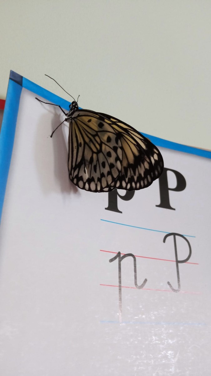 Nie była to jednak tylko lekcja multimedialna, ale również pokazu żywych stworzeń. Sala lekcyjna zamieniła się w motylarnię, gdzie każdy mógł aktywnie poznać motyle poprzez dotyk, nakarmienie ich oraz obserwację z bliska ich wyglądu. Dowiedzieliśmy się w jaki sposób hoduje się motyle, aby imitując ich naturalne środowisko, poznaliśmy różnorodność ich gatunku oraz proces przemiany z gąsienicy w poczwarkę, a następnie w pięknego motyla.