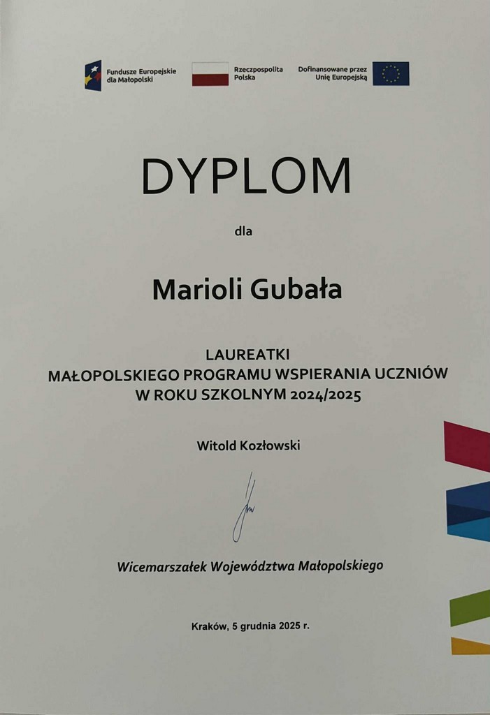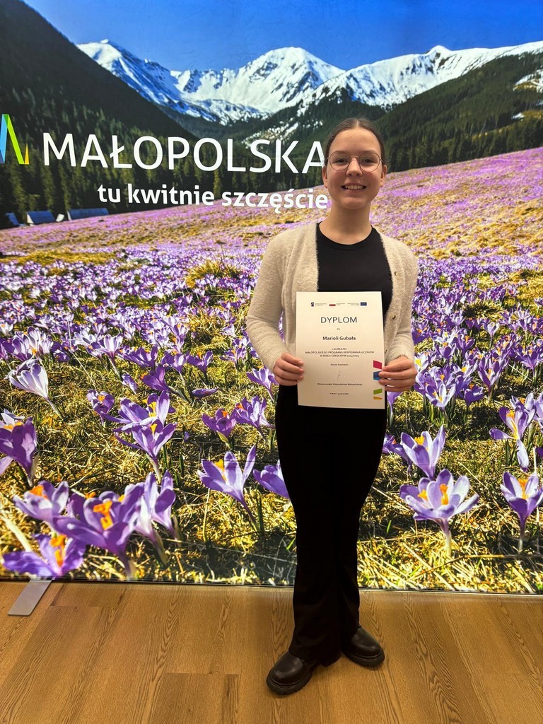 Z ogromną dumą informujemy, że w gronie najlepszych znalazła się nasza uczennica Mariola Gubała (kl. 7a), która w kategorii klas 5–8 zajęła 7. miejsce. To kolejny sukces – w poprzedniej edycji stypendium (2023/2024) zdobyła 1. miejsce.
