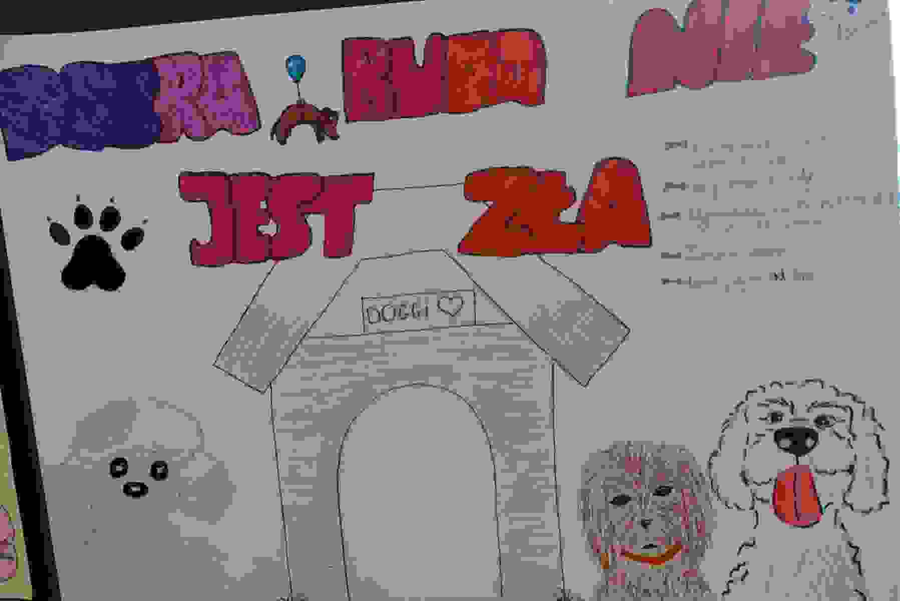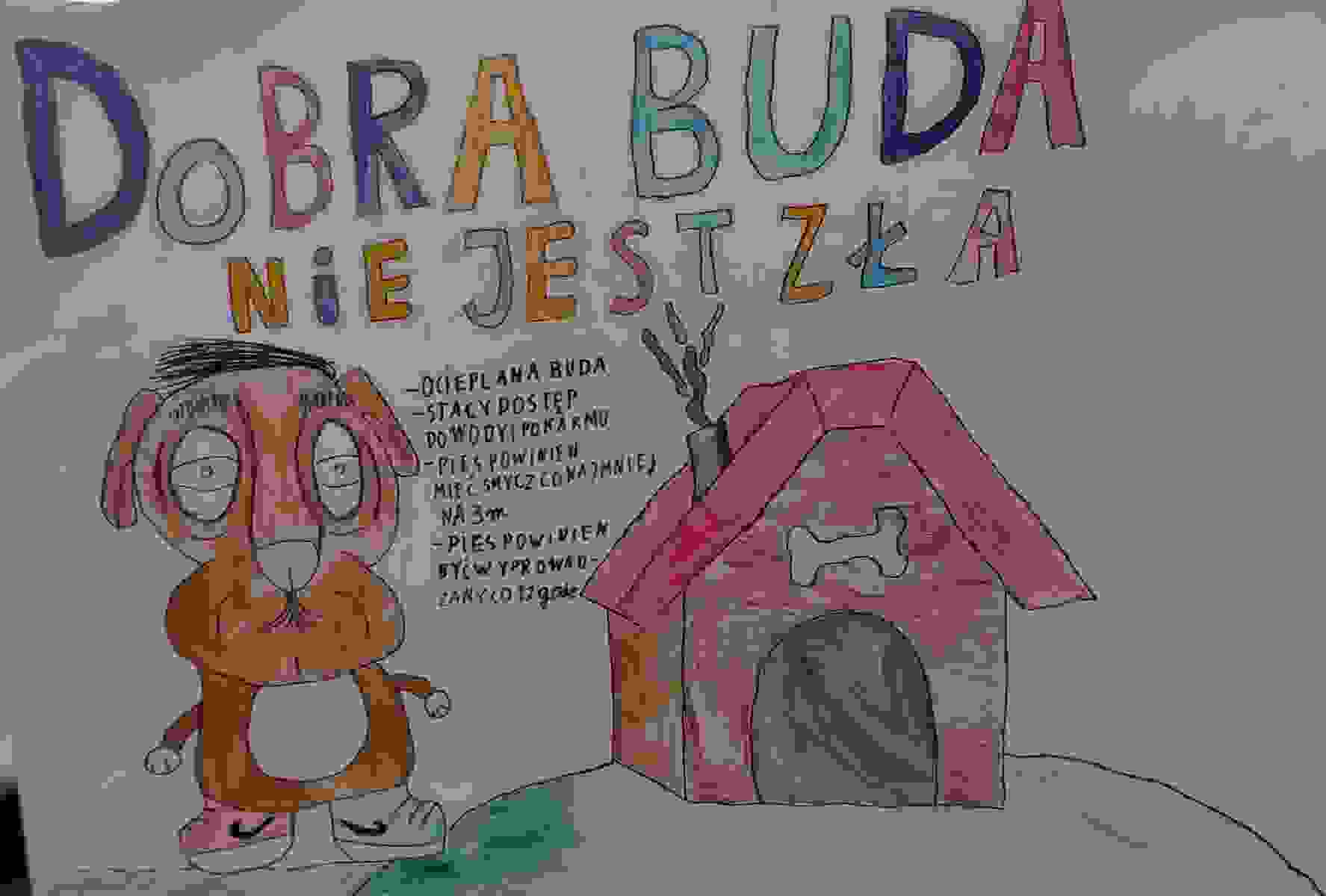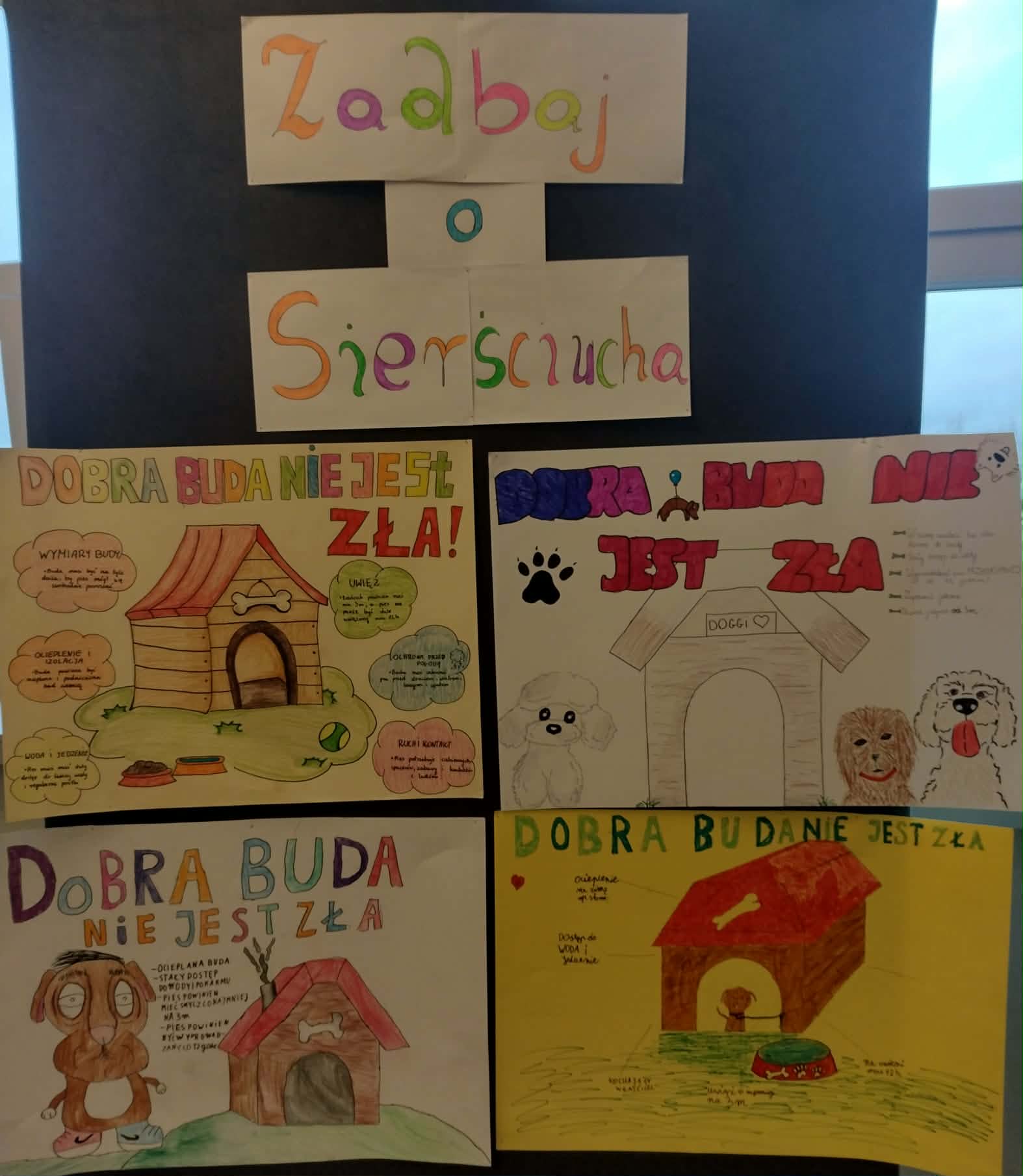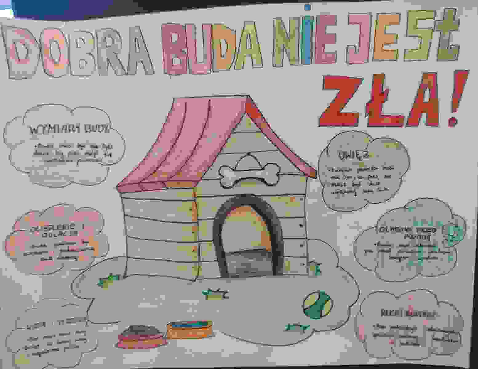 W ramach prowadzonej w tym roku szkolnym innowacji pedagogicznej „Zadbaj o Sierściucha”, klasa 8e prowadzi akcję „Dobra buda nie jest zła”, mającą za zadanie uświadomić wszystkim, jak powinna wyglądać buda, w której mieszka pies. Uczennice i uczniowie wykonali plakaty informujące o zadaniach, jakie stoją przed każdym właścicielem czworonoga mieszkającego w takiej właśnie budzie (na podstawie Ustawy o ochronie zwierząt).