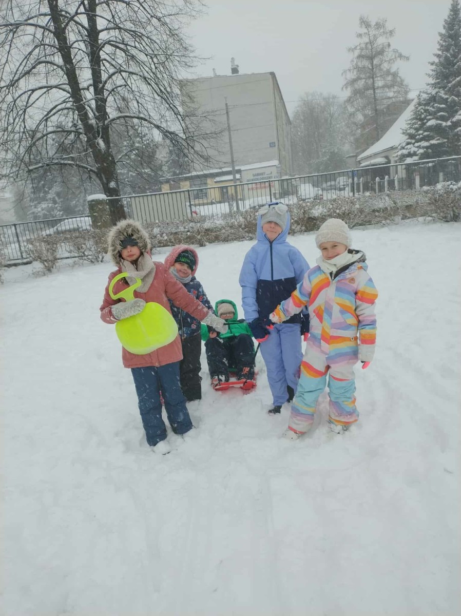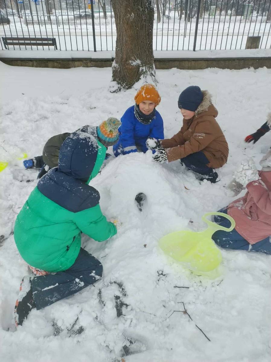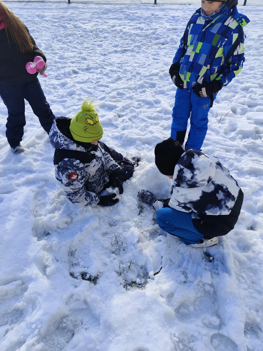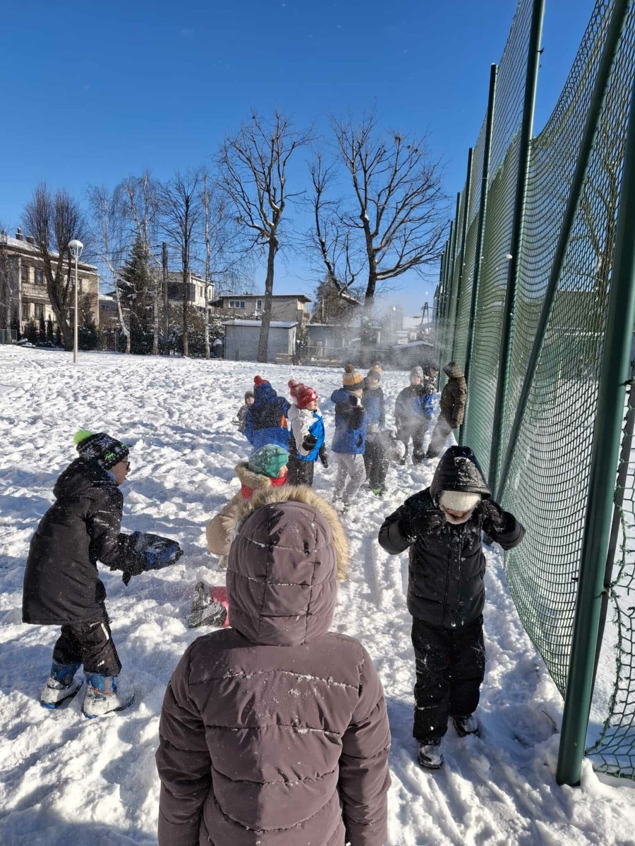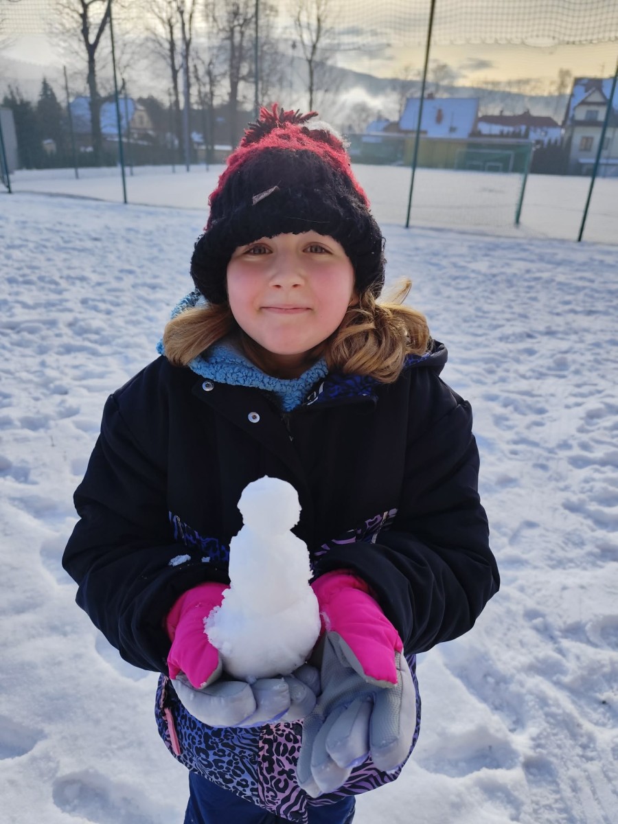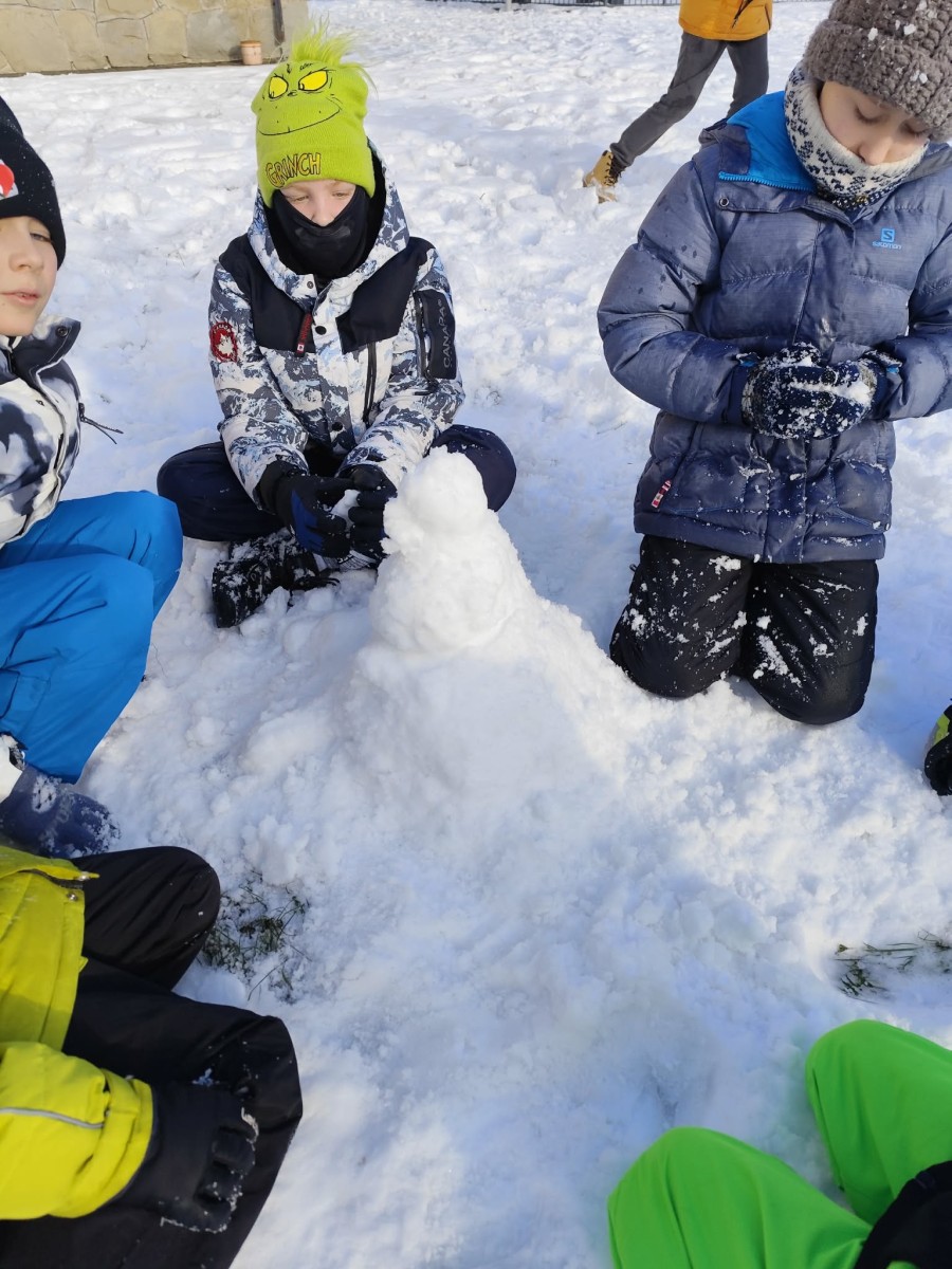 Wyjście w teren było nie tylko okazją do nauki, ale również do radosnej zabawy na świeżym powietrzu. Dzieci z entuzjazmem robiły anioły na śniegu, lepiły bałwana, brały udział w zimowych tańcach i wspólnych zabawach ruchowych. Takie aktywności dostarczyły uczniom wiele radości i pozytywnej energii.