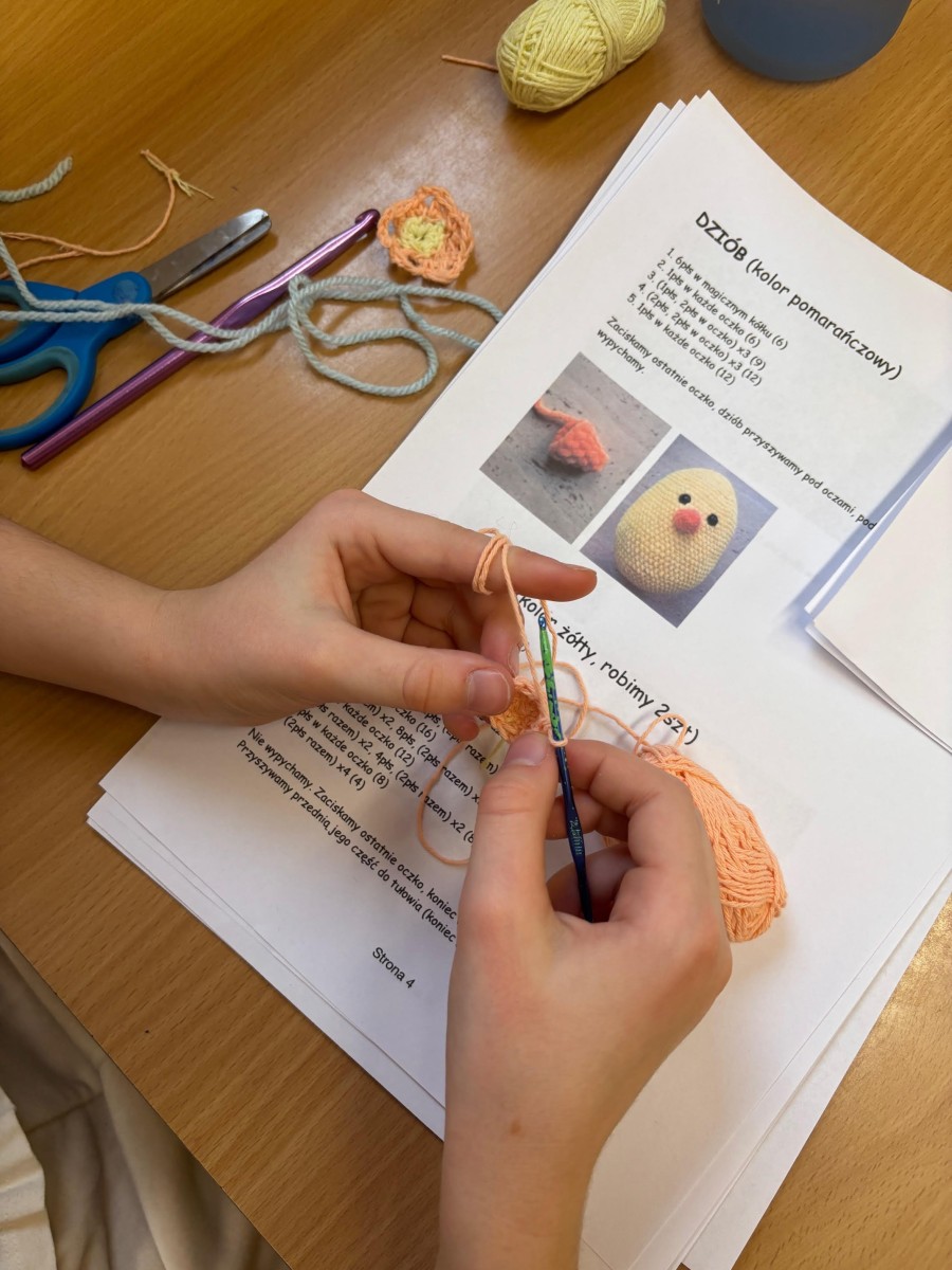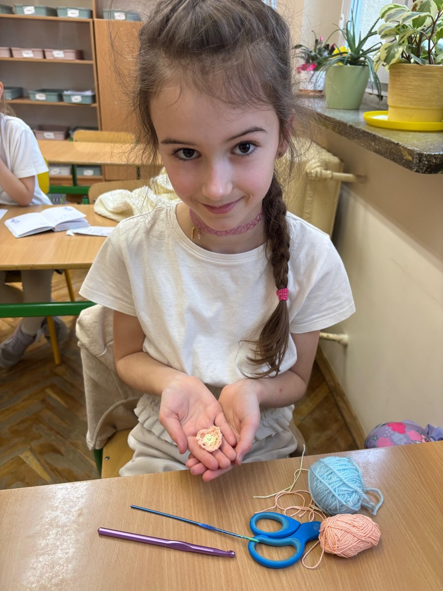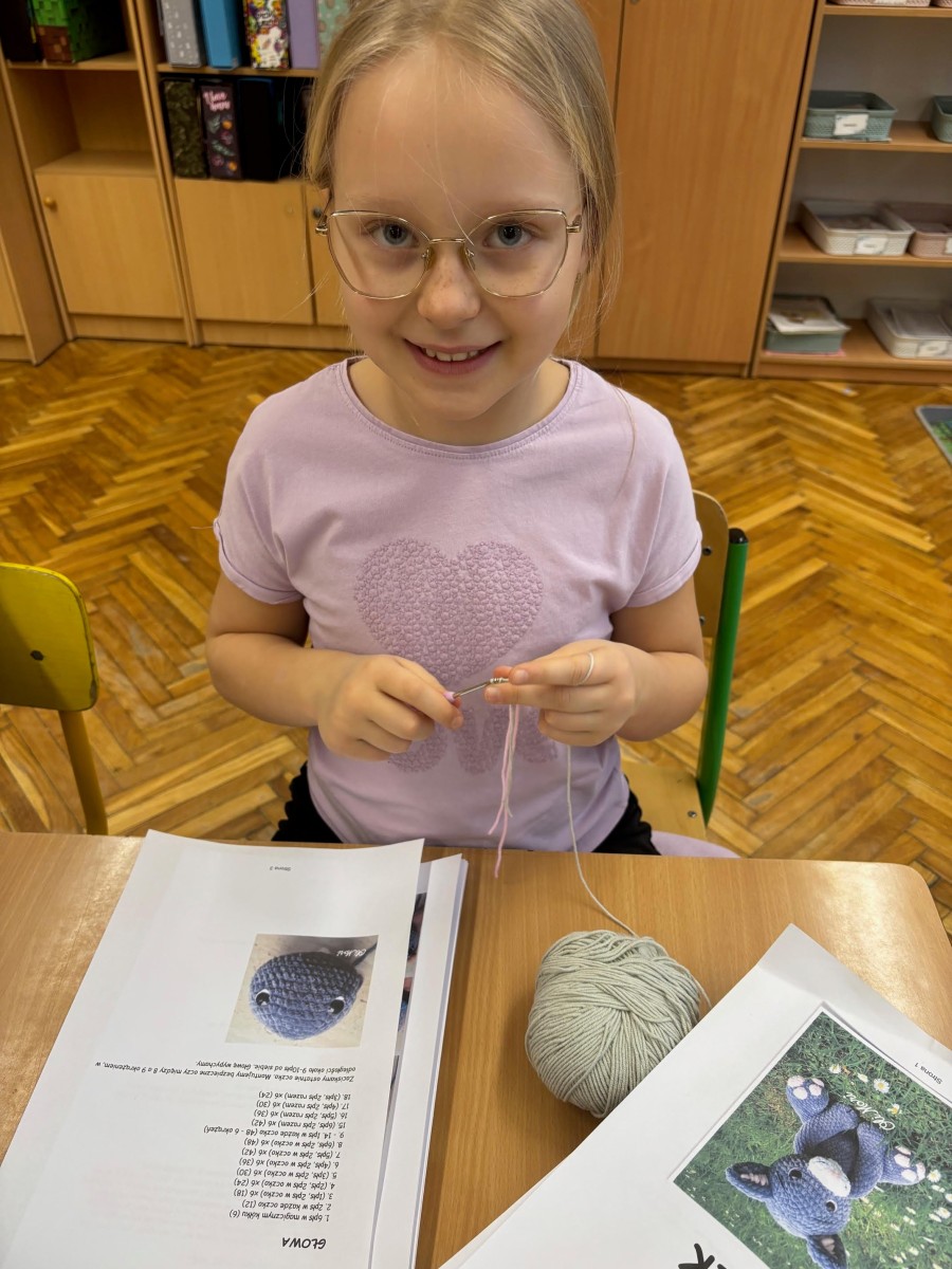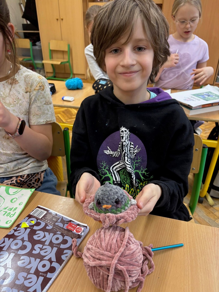 W ramach innowacji pedagogicznej „Szydełko w dłoni mam” uczniowie klasy 3b od pierwszej klasy systematycznie zdobywają i rozwijają umiejętność szydełkowania. Dzięki regularnej pracy dzieci opanowały już podstawowe zapisy i oznaczenia szydełkowe, które z powodzeniem wykorzystują w kolejnych etapach nauki. W klasie trzeciej uczniowie podjęli nowe, ambitne wyzwanie – tworzenie szydełkowych maskotek na podstawie różnych wzorów i schematów. Praca nad nimi wymaga skupienia, dokładności oraz umiejętności czytania schematów, co dodatkowo rozwija logiczne myślenie i samodzielność.
