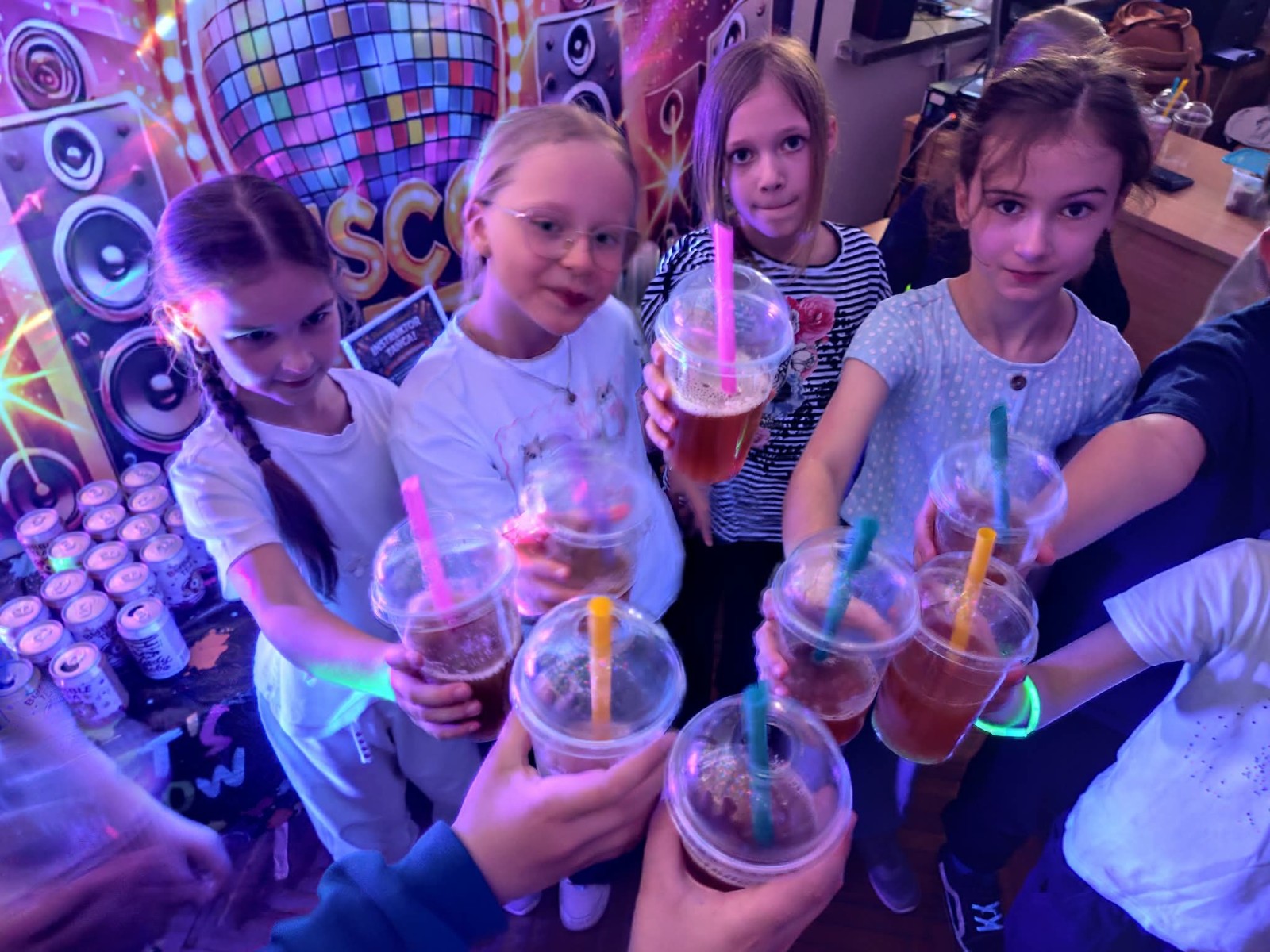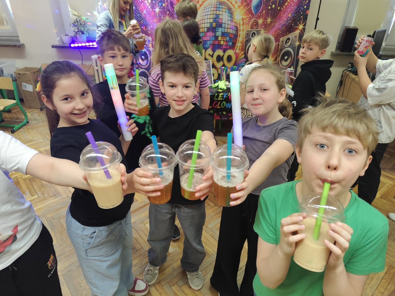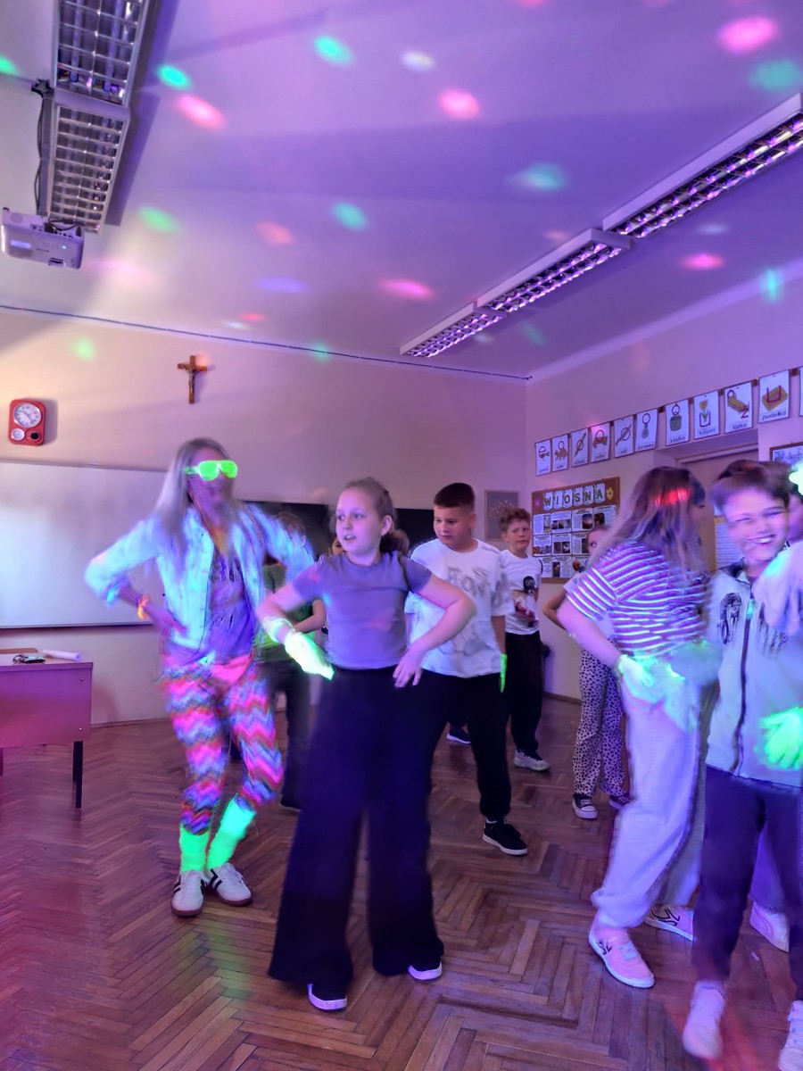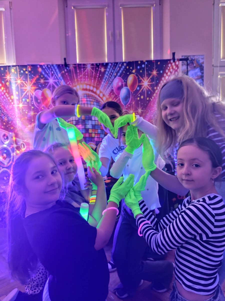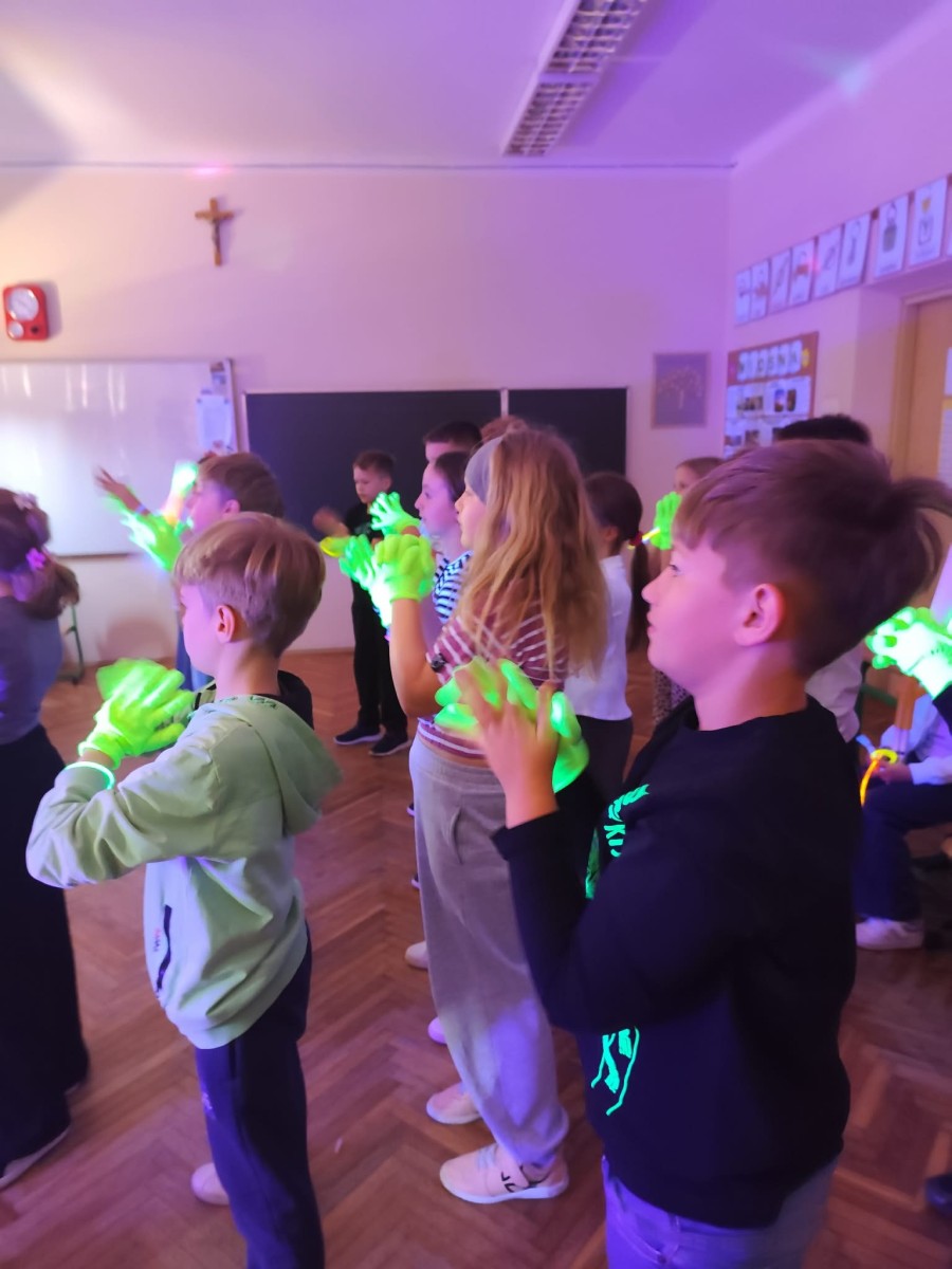 Najwięcej radości sprawiła nam jednak część praktyczna! Wspólnie uczyliśmy się układu tanecznego, a sala zamieniła się w prawdziwy parkiet taneczny. Towarzyszyły nam kolorowe światła, chusta Klanza, świecące rękawiczki i tuby UV, które stworzyły niesamowity klimat. Nie zabrakło również konfetti, które dodało całemu wydarzeniu wyjątkowego charakteru. Na zakończenie czekała na wszystkich miła niespodzianka – wspólnie delektowaliśmy się pyszną bubble tea. To było pełne energii, radości i inspiracji spotkanie, które na długo pozostanie w naszej pamięci!