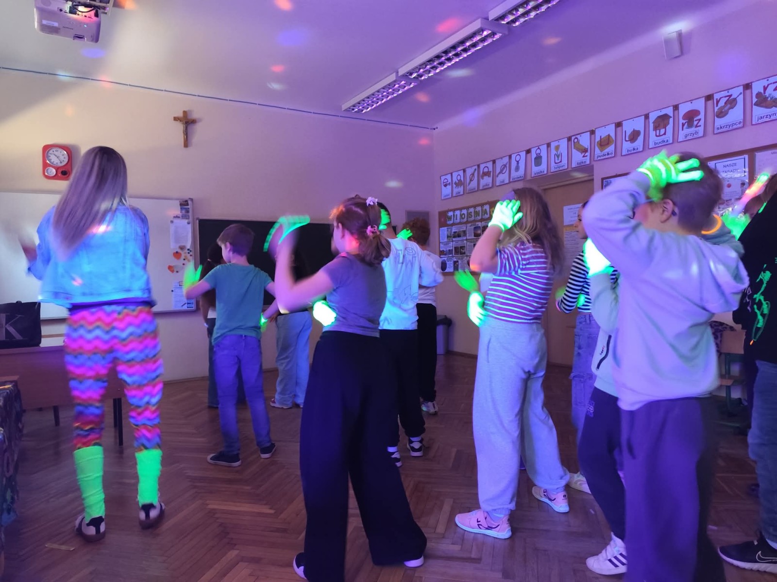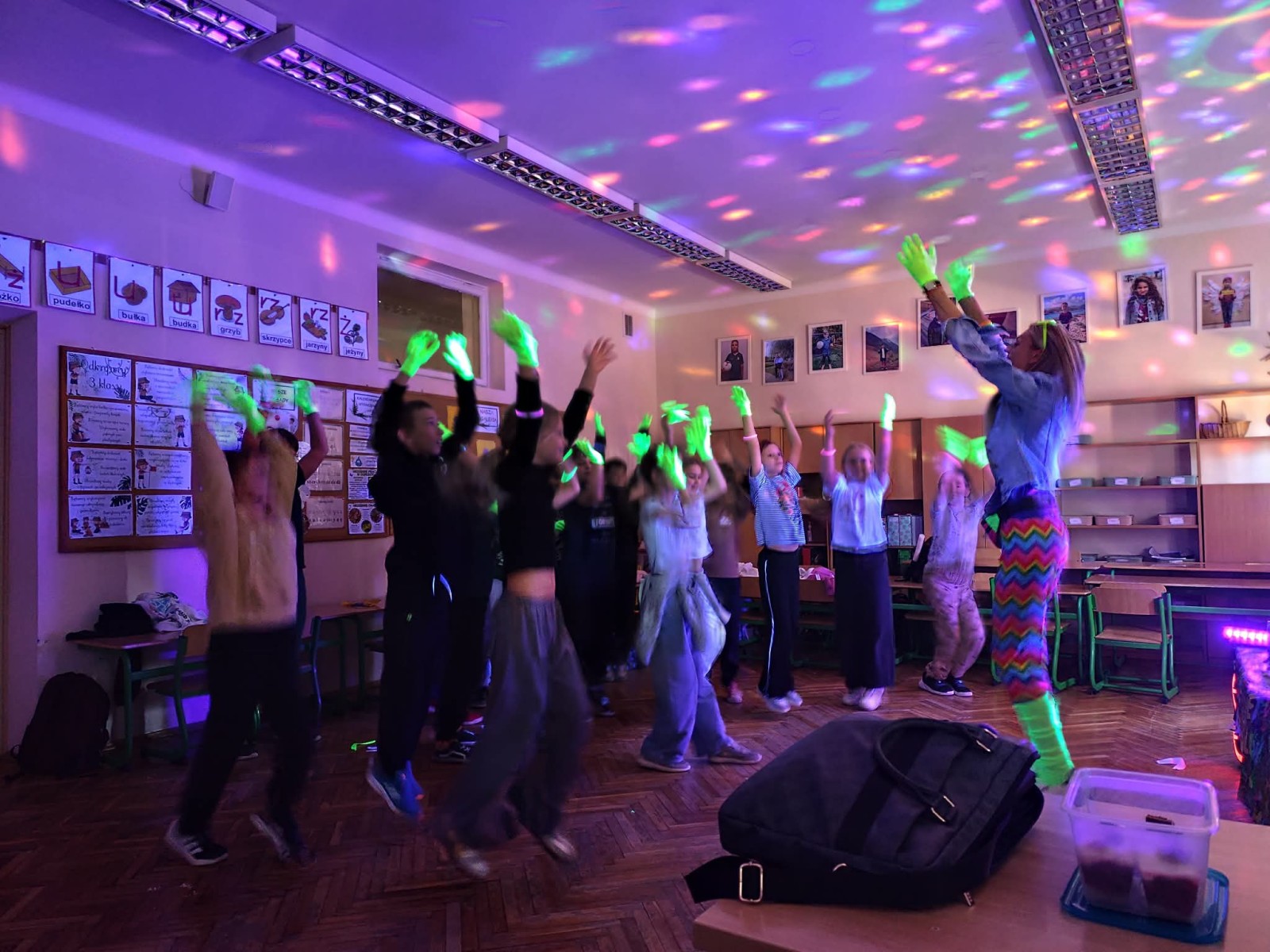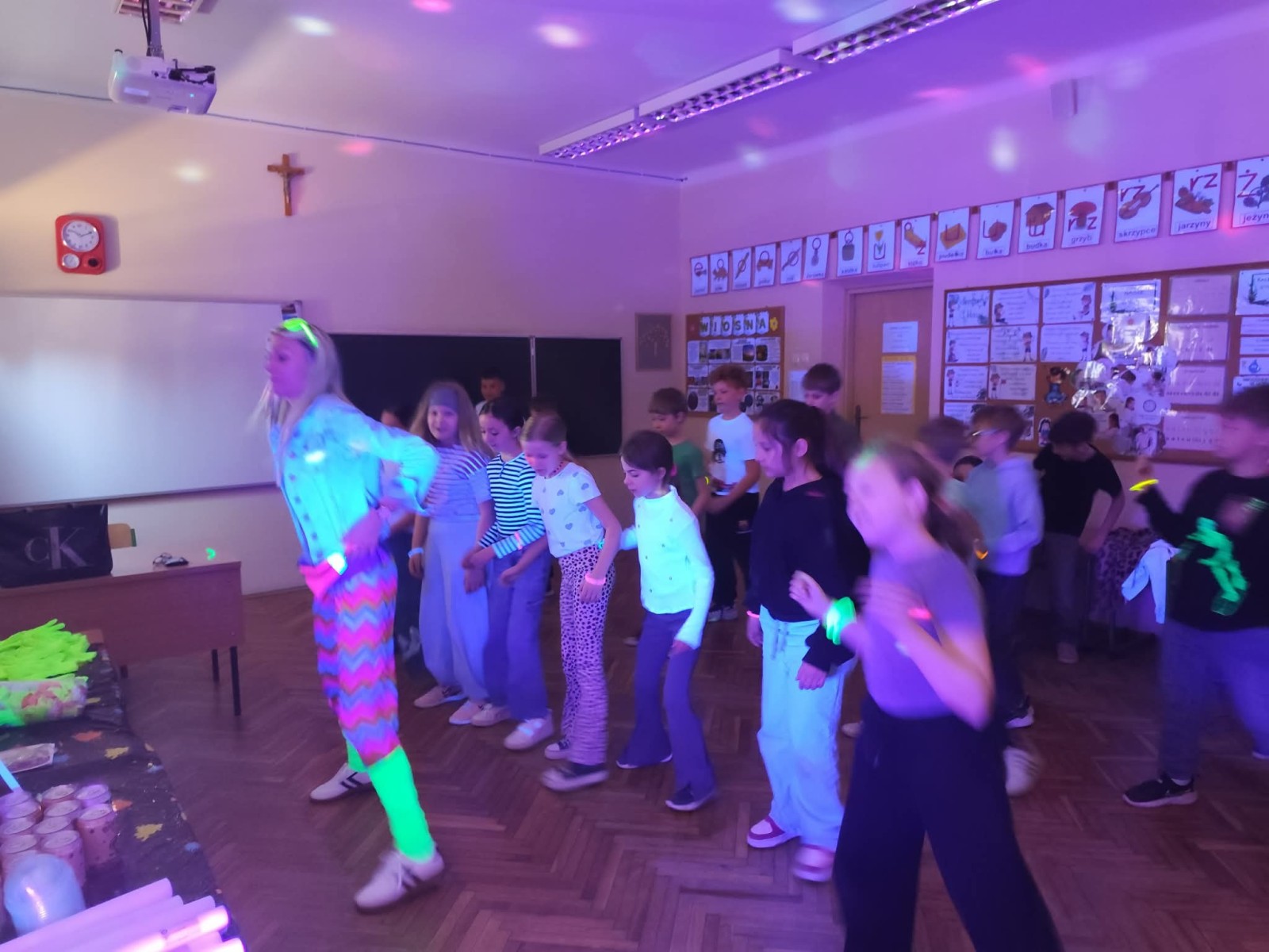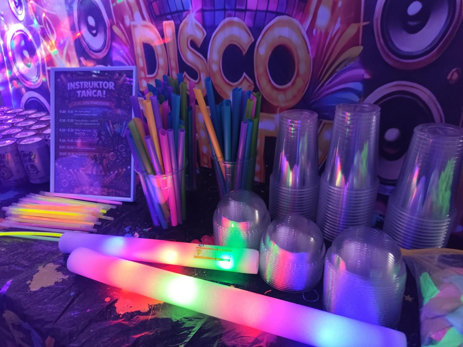 Najwięcej radości sprawiła nam jednak część praktyczna! Wspólnie uczyliśmy się układu tanecznego, a sala zamieniła się w prawdziwy parkiet taneczny. Towarzyszyły nam kolorowe światła, chusta Klanza, świecące rękawiczki i tuby UV, które stworzyły niesamowity klimat. Nie zabrakło również konfetti, które dodało całemu wydarzeniu wyjątkowego charakteru. Na zakończenie czekała na wszystkich miła niespodzianka – wspólnie delektowaliśmy się pyszną bubble tea. To było pełne energii, radości i inspiracji spotkanie, które na długo pozostanie w naszej pamięci!