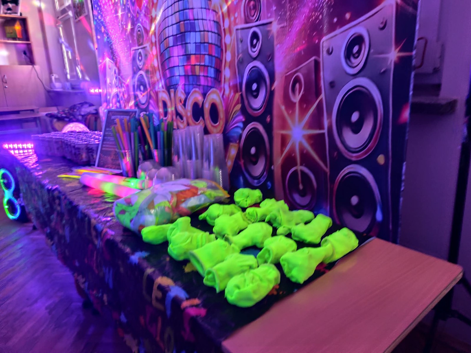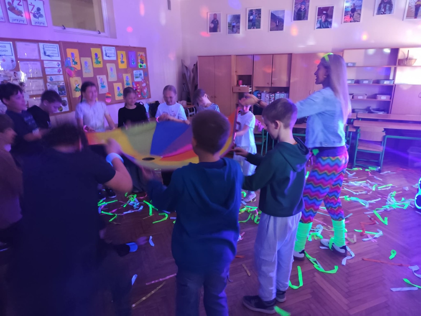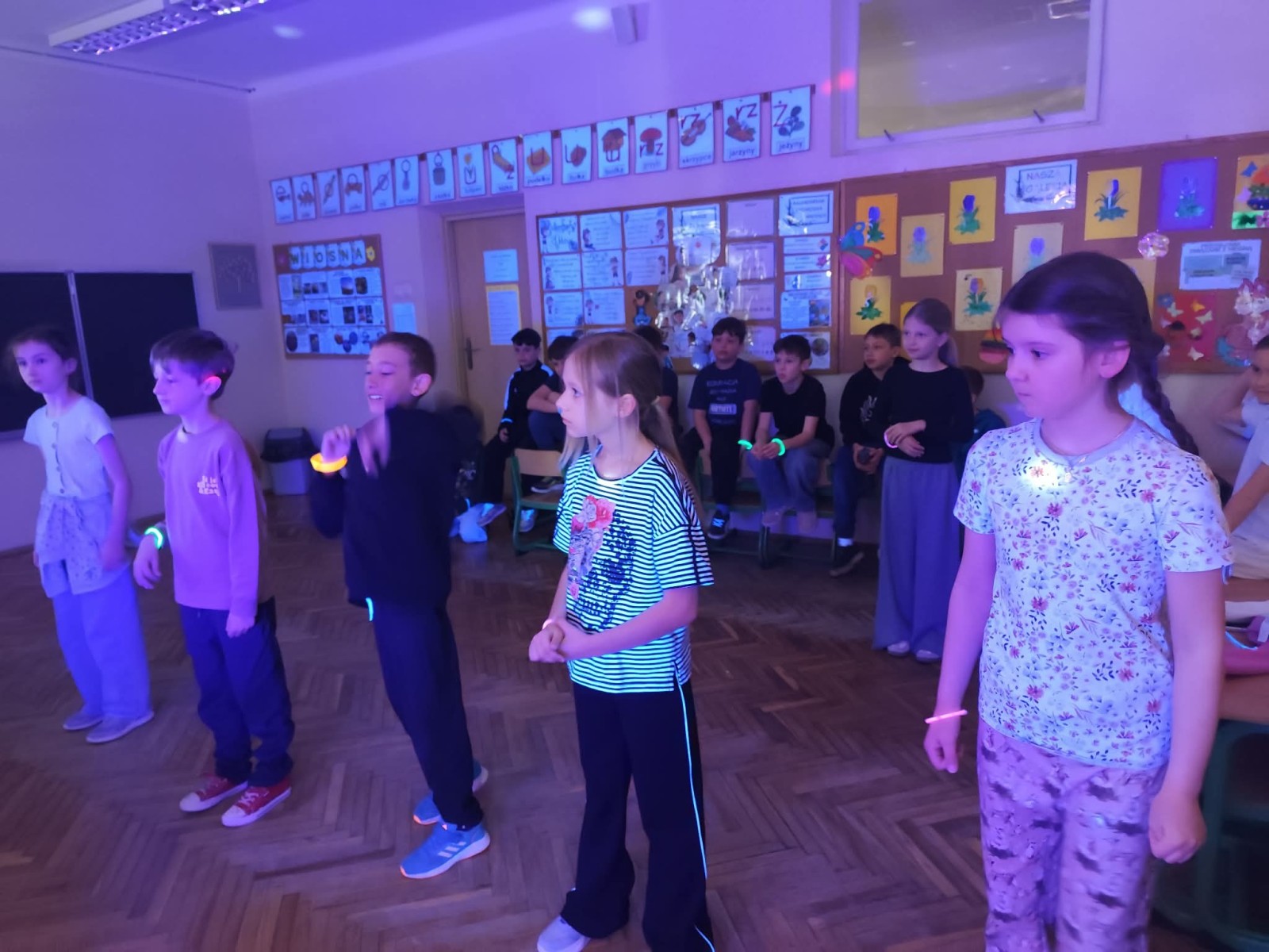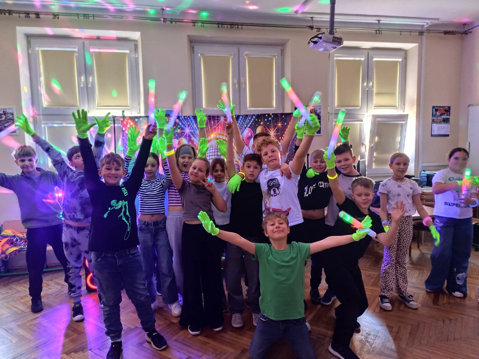 Najwięcej radości sprawiła nam jednak część praktyczna! Wspólnie uczyliśmy się układu tanecznego, a sala zamieniła się w prawdziwy parkiet taneczny. Towarzyszyły nam kolorowe światła, chusta Klanza, świecące rękawiczki i tuby UV, które stworzyły niesamowity klimat. Nie zabrakło również konfetti, które dodało całemu wydarzeniu wyjątkowego charakteru. Na zakończenie czekała na wszystkich miła niespodzianka – wspólnie delektowaliśmy się pyszną bubble tea. To było pełne energii, radości i inspiracji spotkanie, które na długo pozostanie w naszej pamięci!