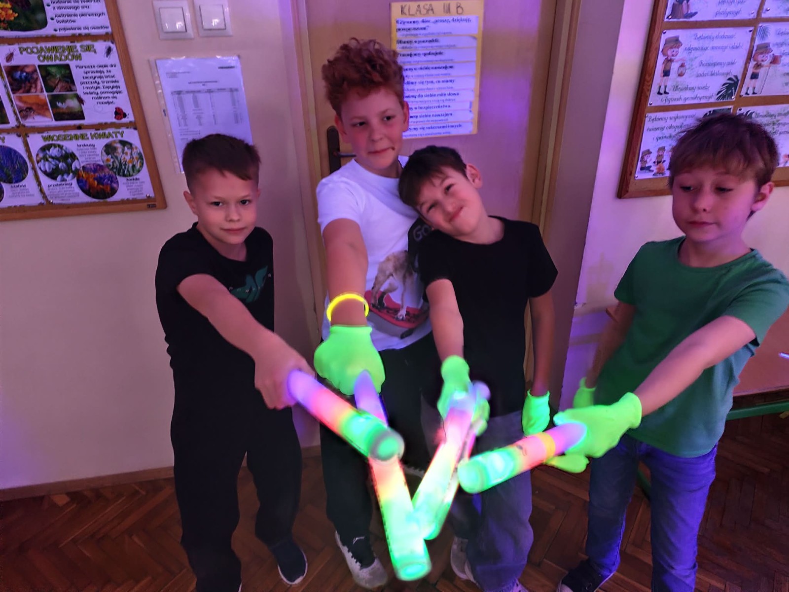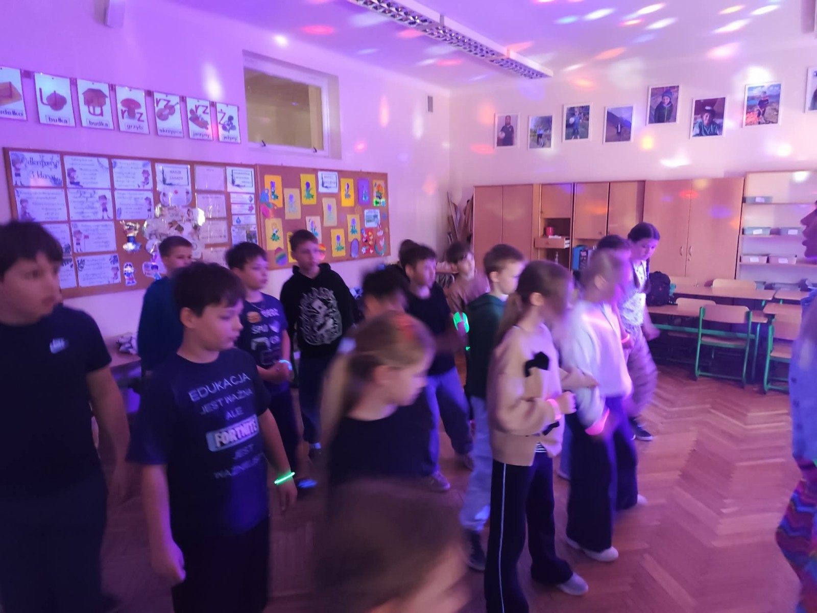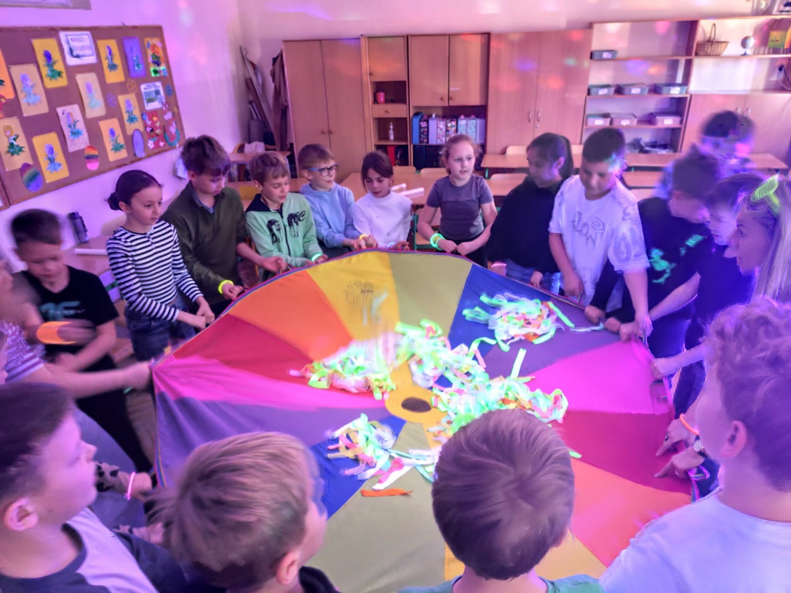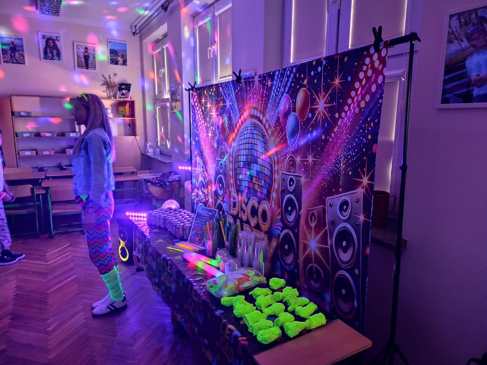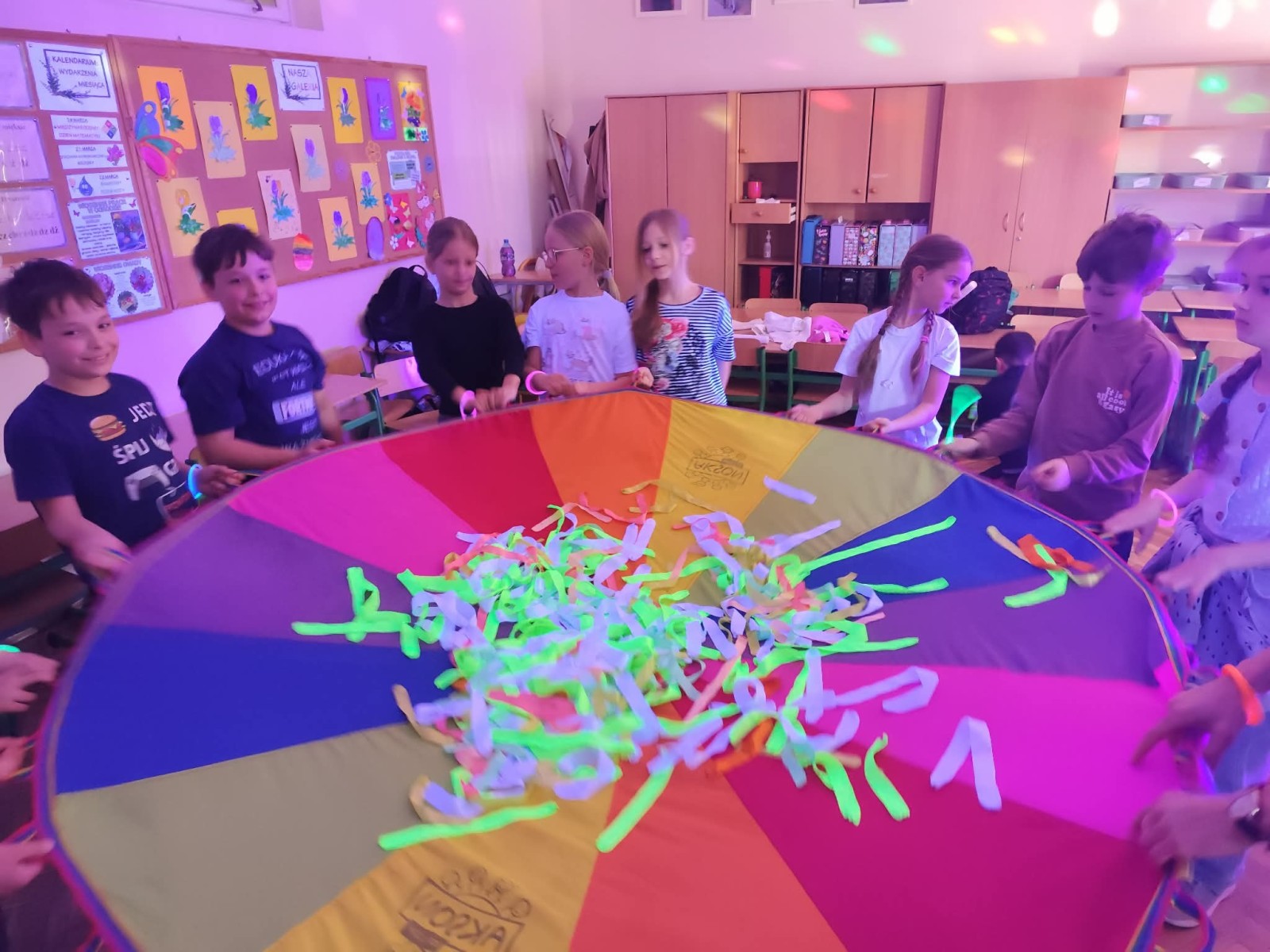 Najwięcej radości sprawiła nam jednak część praktyczna! Wspólnie uczyliśmy się układu tanecznego, a sala zamieniła się w prawdziwy parkiet taneczny. Towarzyszyły nam kolorowe światła, chusta Klanza, świecące rękawiczki i tuby UV, które stworzyły niesamowity klimat. Nie zabrakło również konfetti, które dodało całemu wydarzeniu wyjątkowego charakteru. Na zakończenie czekała na wszystkich miła niespodzianka – wspólnie delektowaliśmy się pyszną bubble tea. To było pełne energii, radości i inspiracji spotkanie, które na długo pozostanie w naszej pamięci!
