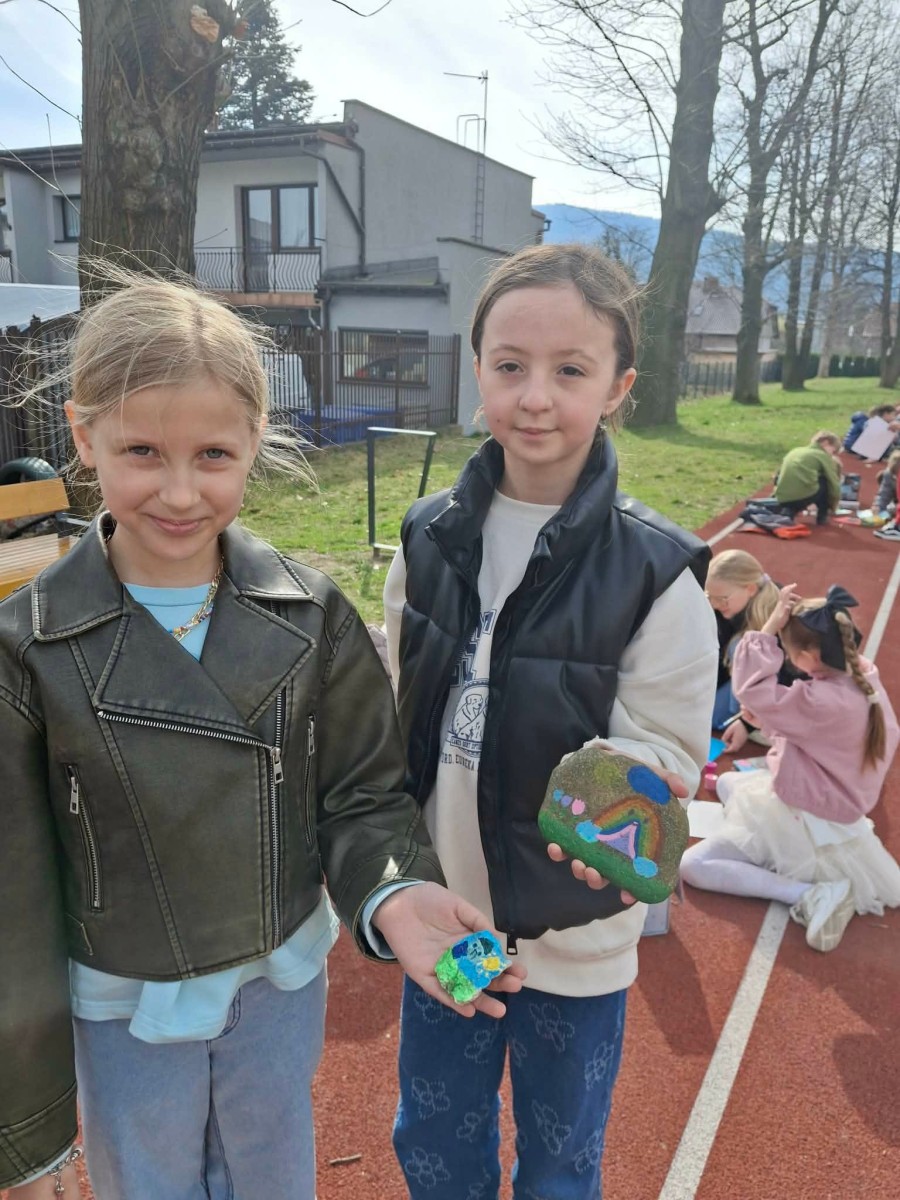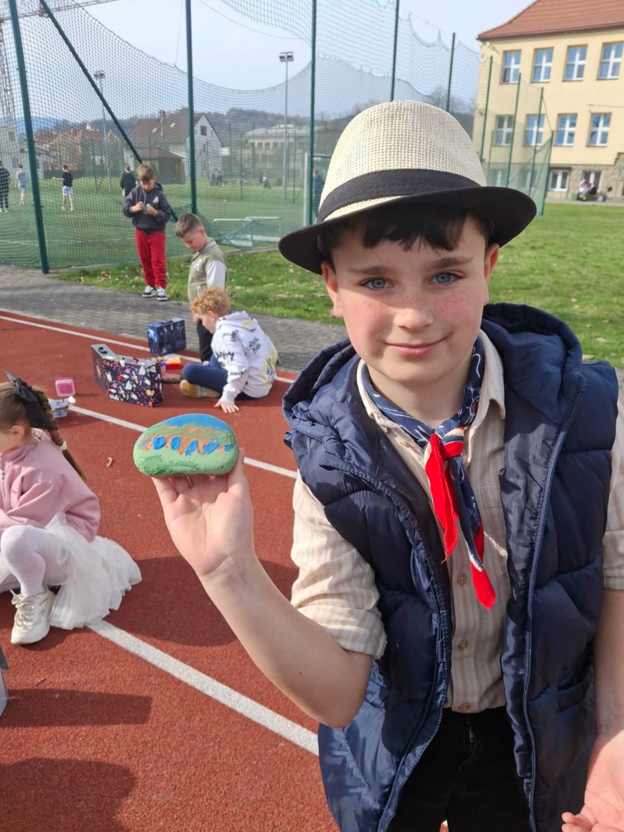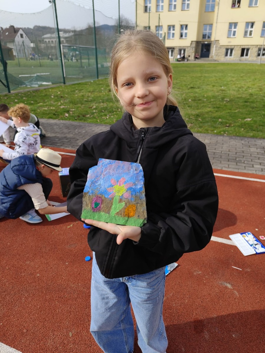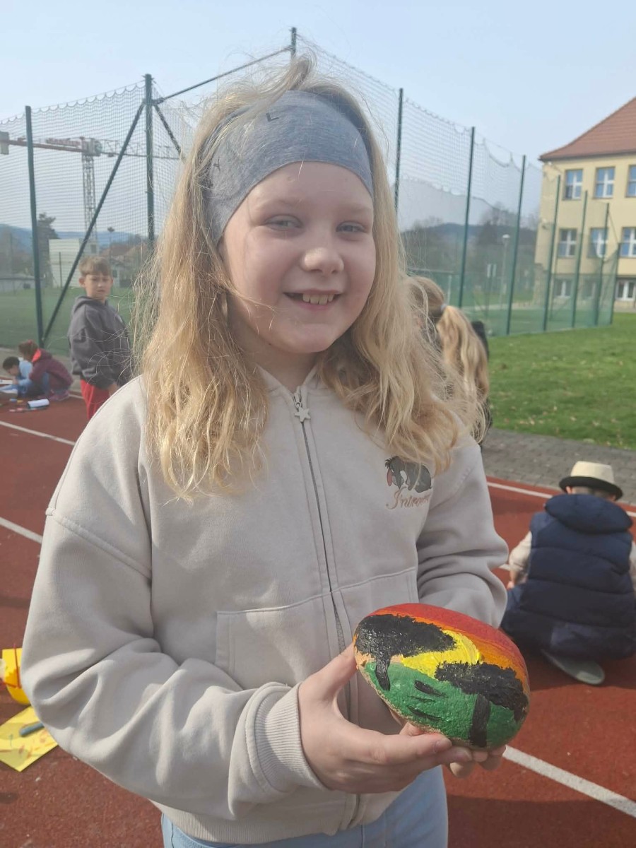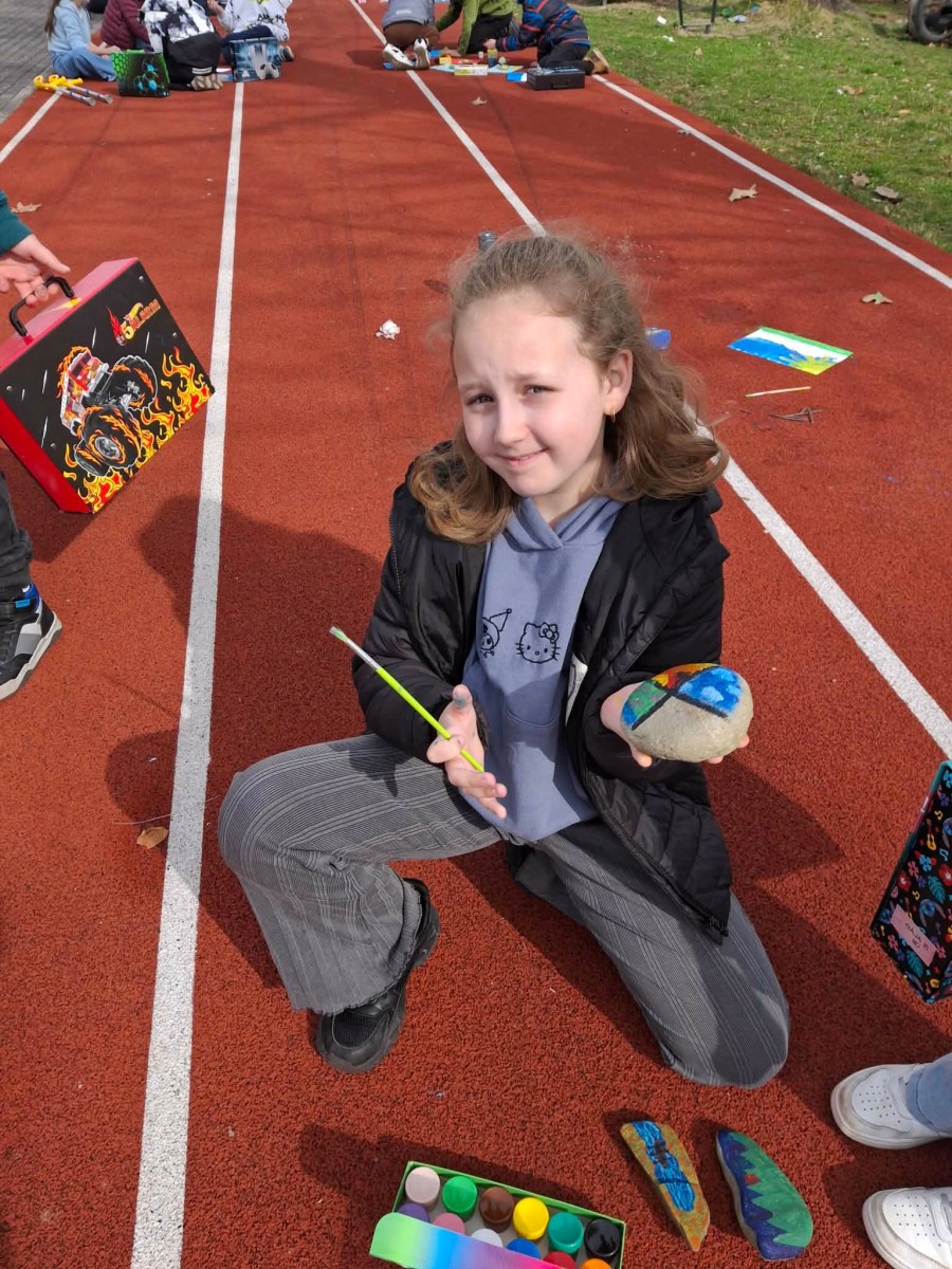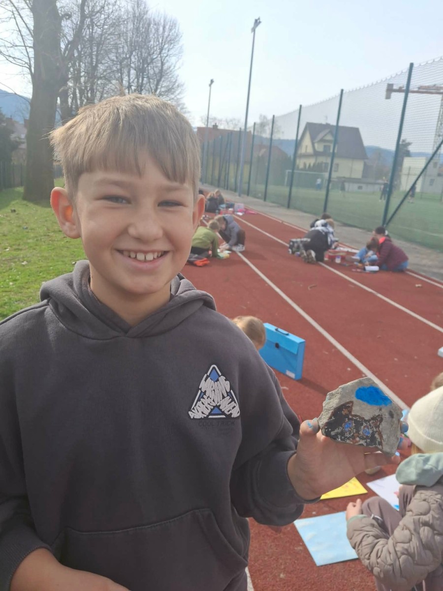 Drugim zadaniem były „Opowieści z kamienia”. Uczniowie ozdabiali kamienie farbami i pisakami według własnych pomysłów. Powstały niezwykle ciekawe i kreatywne prace – od kolorowych wzorów, przez postacie, aż po całe sceny inspirowane literaturą. Szczególną uwagę zwróciły kamienie przedstawiające krajobraz afrykański, będące efektem inspiracji lekturą „Afryka Kazika”. To doskonały przykład na to, jak można połączyć czytelnictwo z działaniami artystycznymi.