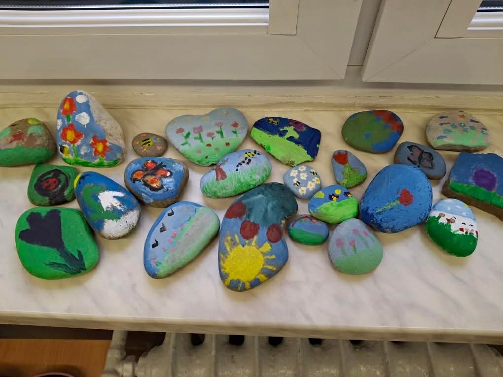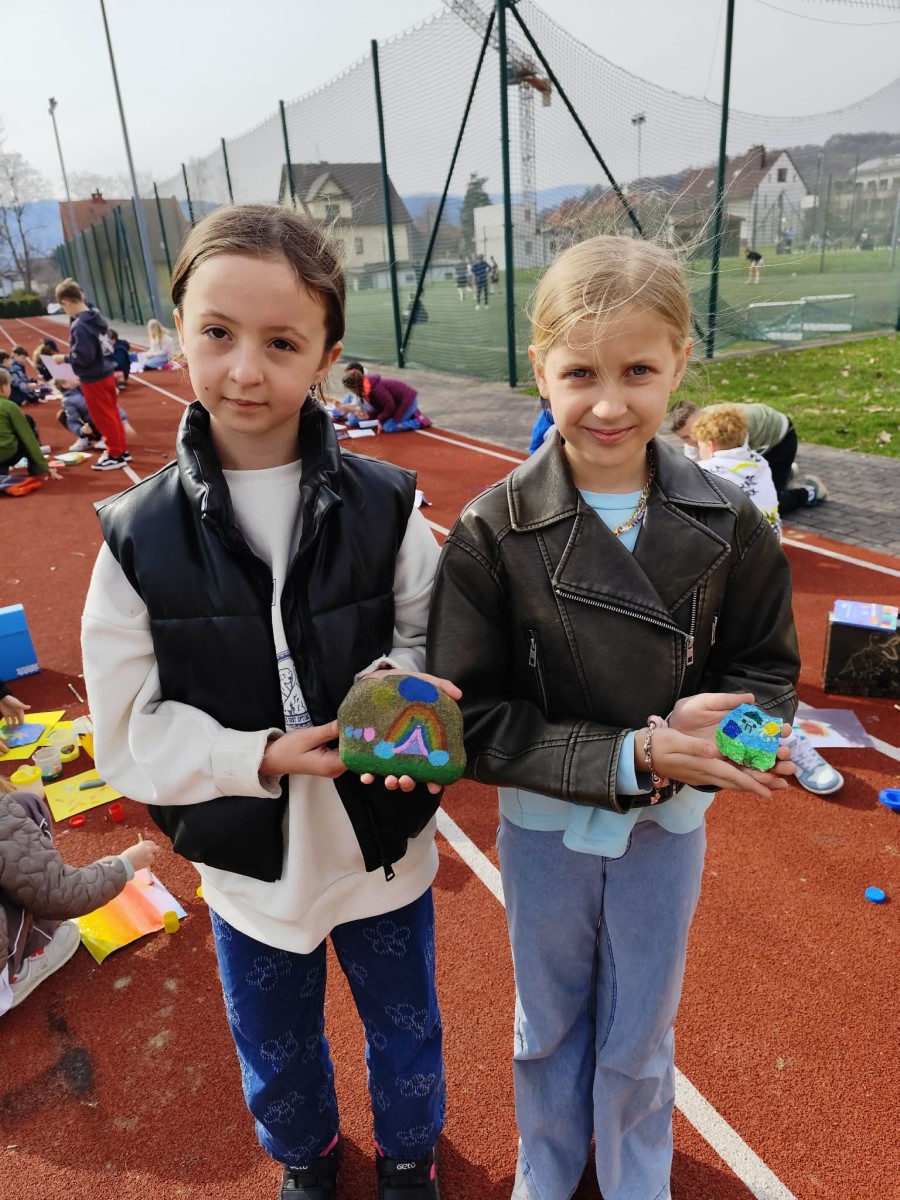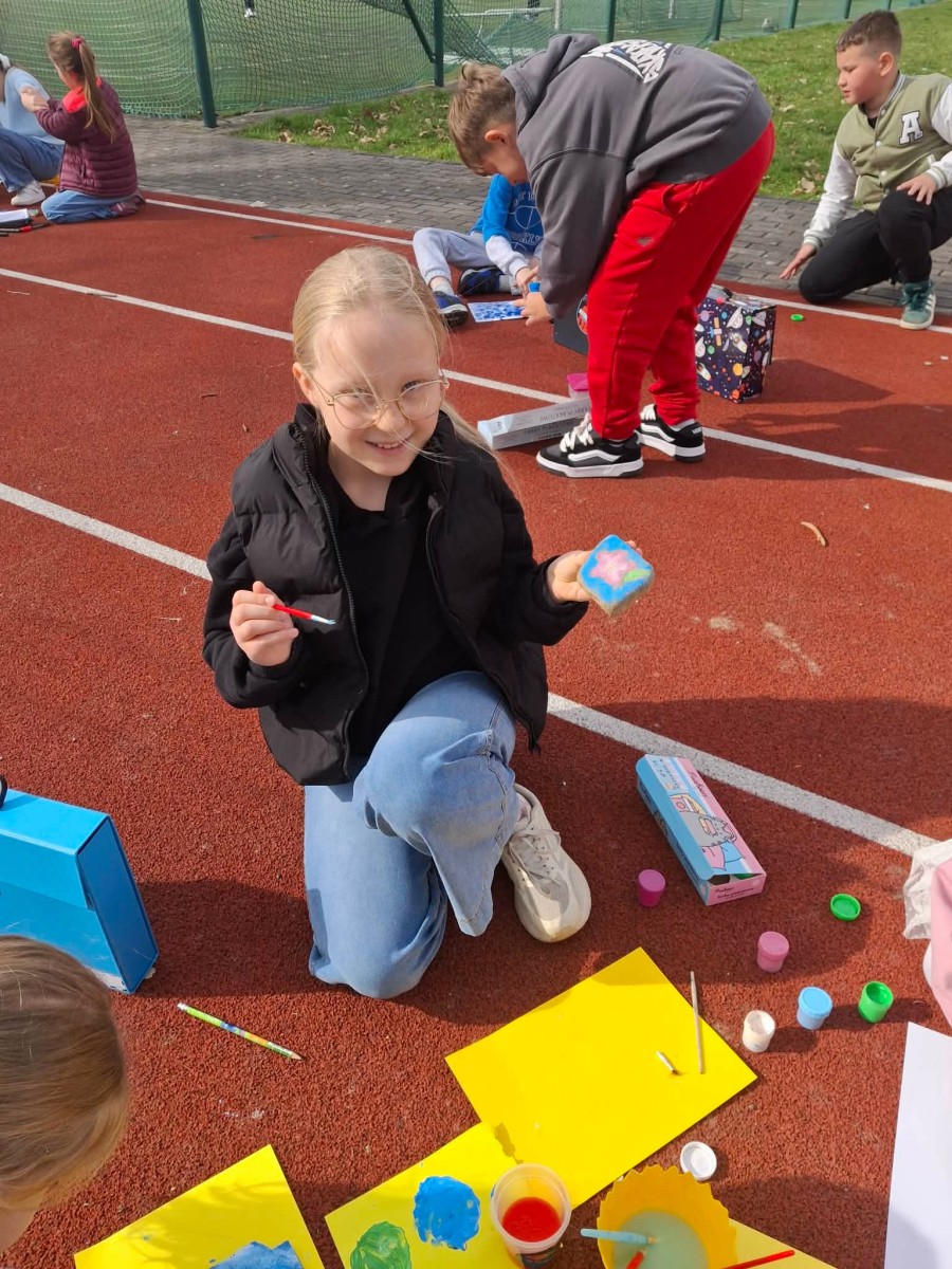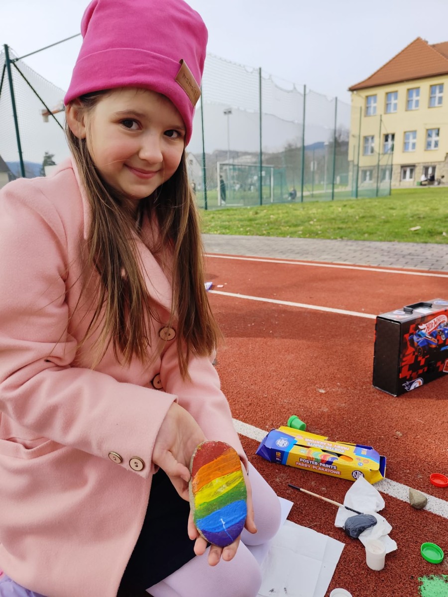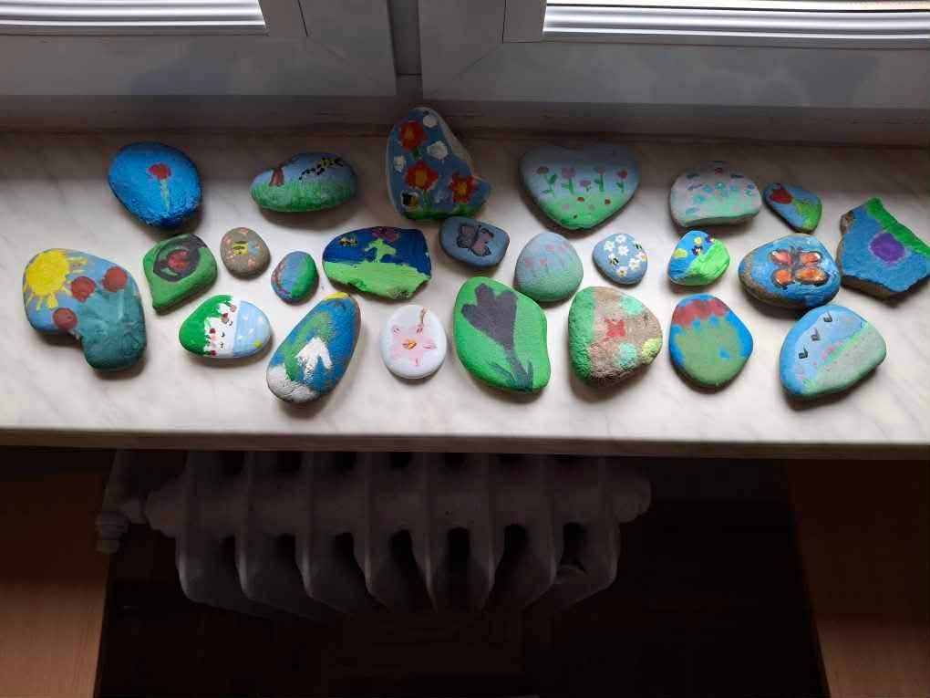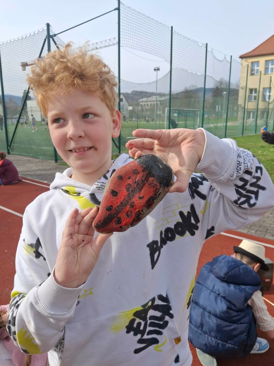 Drugim zadaniem były „Opowieści z kamienia”. Uczniowie ozdabiali kamienie farbami i pisakami według własnych pomysłów. Powstały niezwykle ciekawe i kreatywne prace – od kolorowych wzorów, przez postacie, aż po całe sceny inspirowane literaturą. Szczególną uwagę zwróciły kamienie przedstawiające krajobraz afrykański, będące efektem inspiracji lekturą „Afryka Kazika”. To doskonały przykład na to, jak można połączyć czytelnictwo z działaniami artystycznymi.