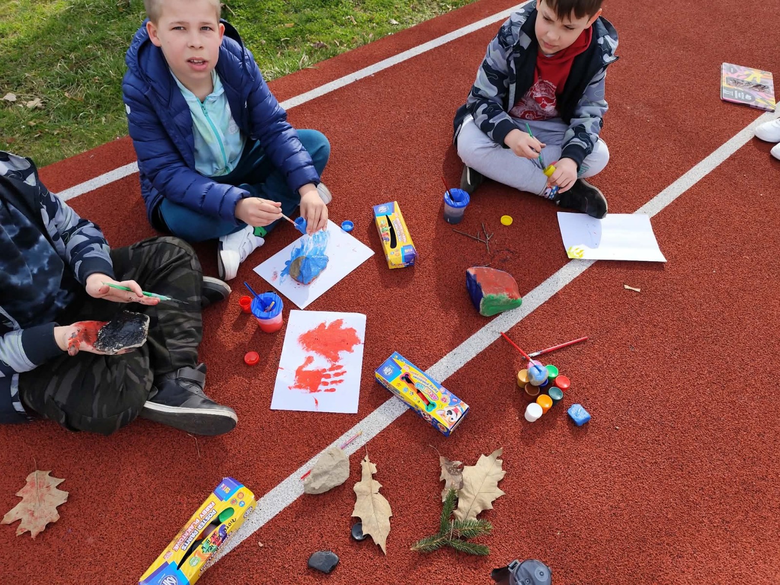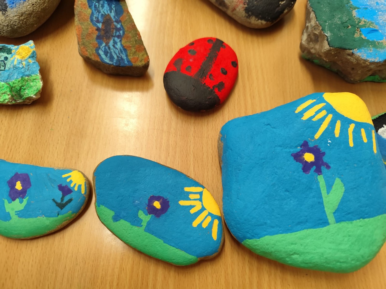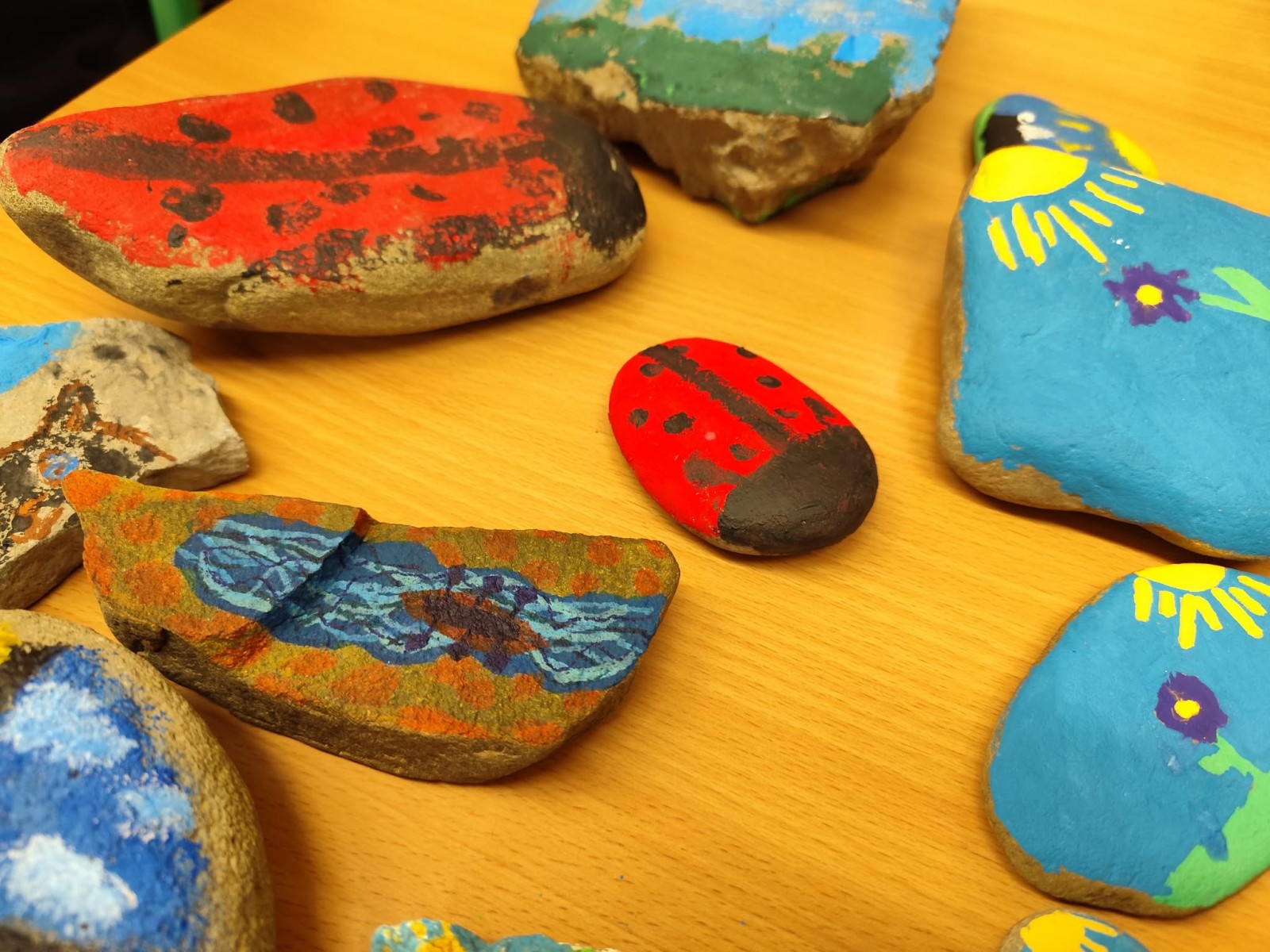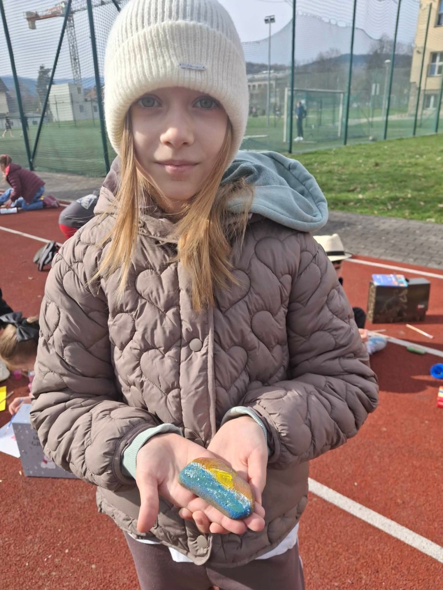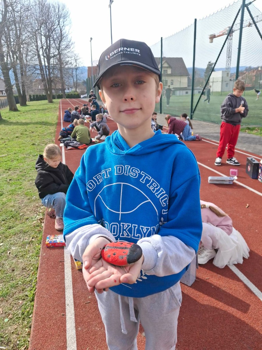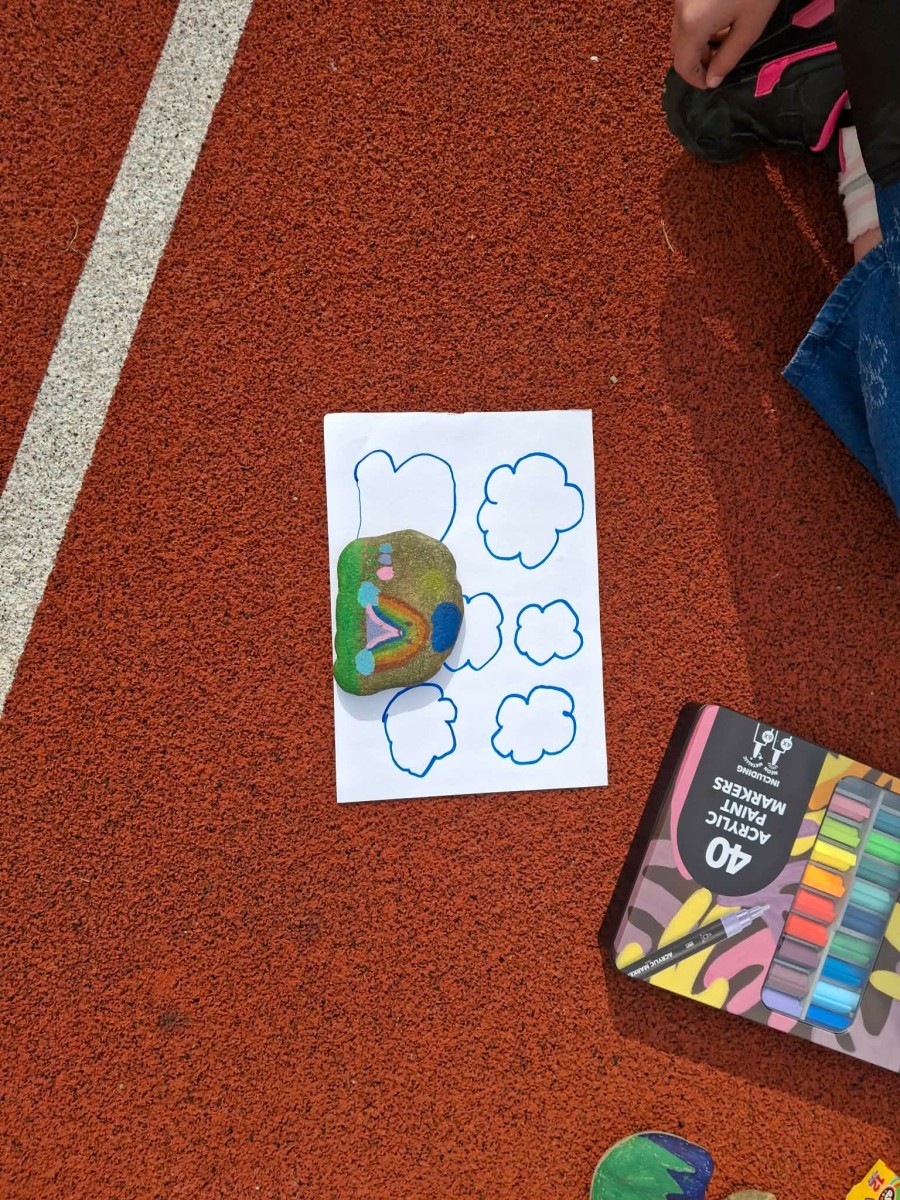 Drugim zadaniem były „Opowieści z kamienia”. Uczniowie ozdabiali kamienie farbami i pisakami według własnych pomysłów. Powstały niezwykle ciekawe i kreatywne prace – od kolorowych wzorów, przez postacie, aż po całe sceny inspirowane literaturą. Szczególną uwagę zwróciły kamienie przedstawiające krajobraz afrykański, będące efektem inspiracji lekturą „Afryka Kazika”. To doskonały przykład na to, jak można połączyć czytelnictwo z działaniami artystycznymi.