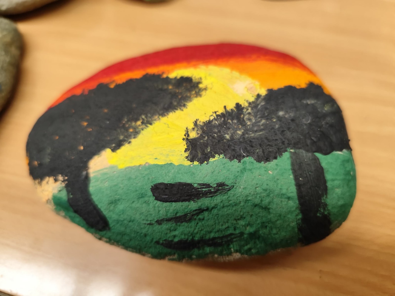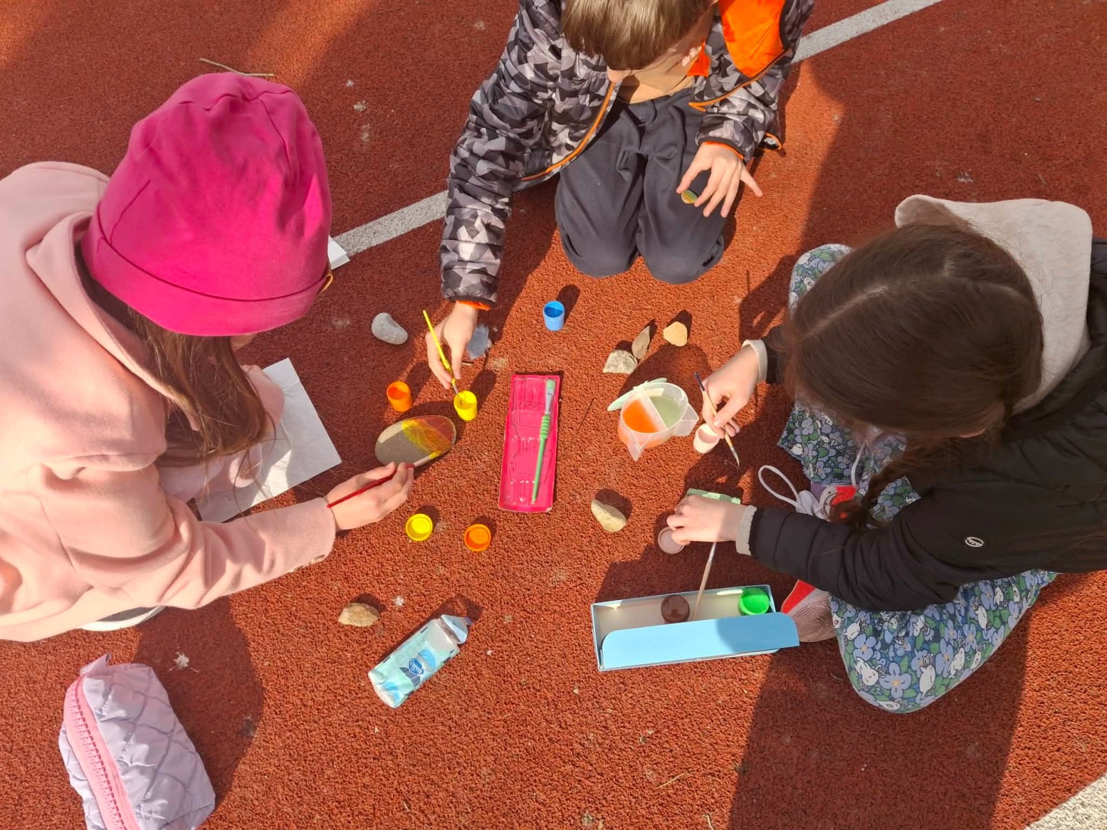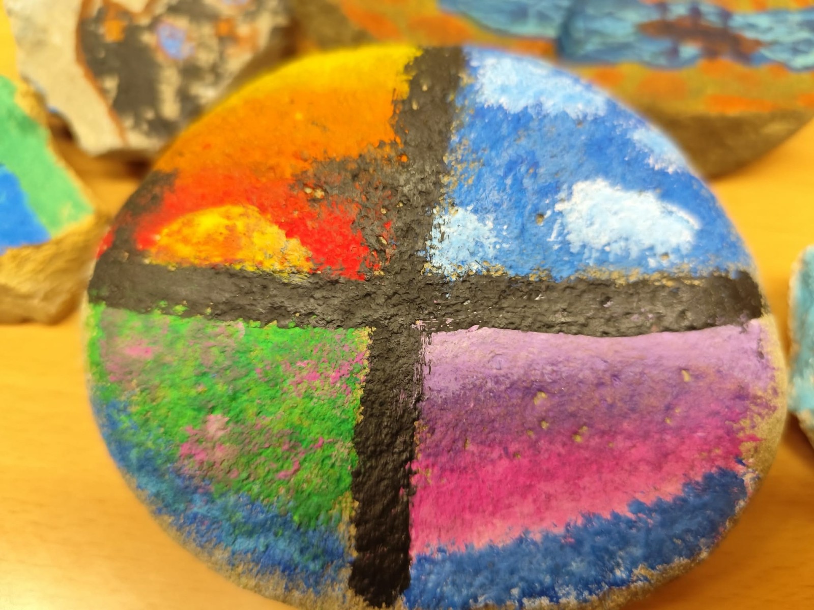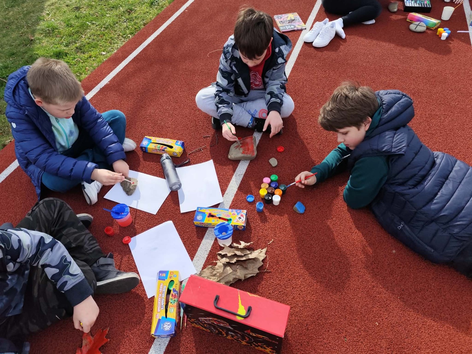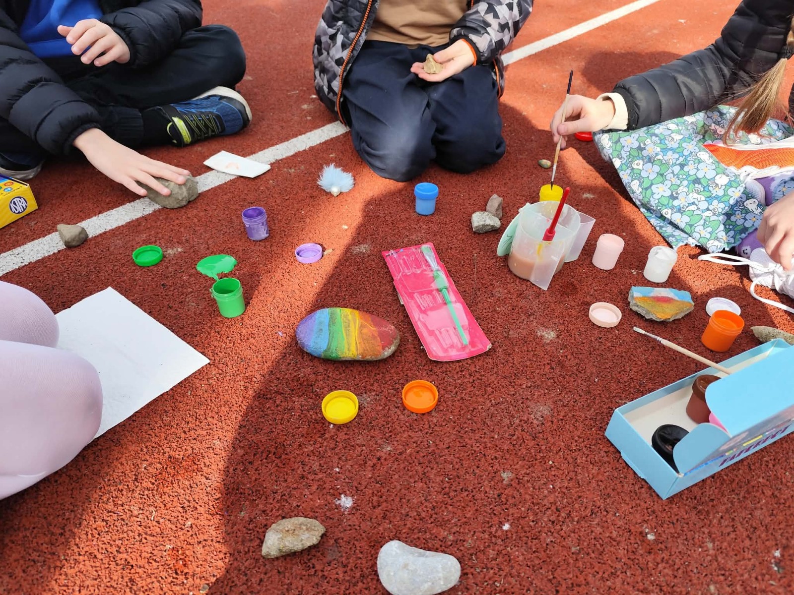 Drugim zadaniem były „Opowieści z kamienia”. Uczniowie ozdabiali kamienie farbami i pisakami według własnych pomysłów. Powstały niezwykle ciekawe i kreatywne prace – od kolorowych wzorów, przez postacie, aż po całe sceny inspirowane literaturą. Szczególną uwagę zwróciły kamienie przedstawiające krajobraz afrykański, będące efektem inspiracji lekturą „Afryka Kazika”. To doskonały przykład na to, jak można połączyć czytelnictwo z działaniami artystycznymi.