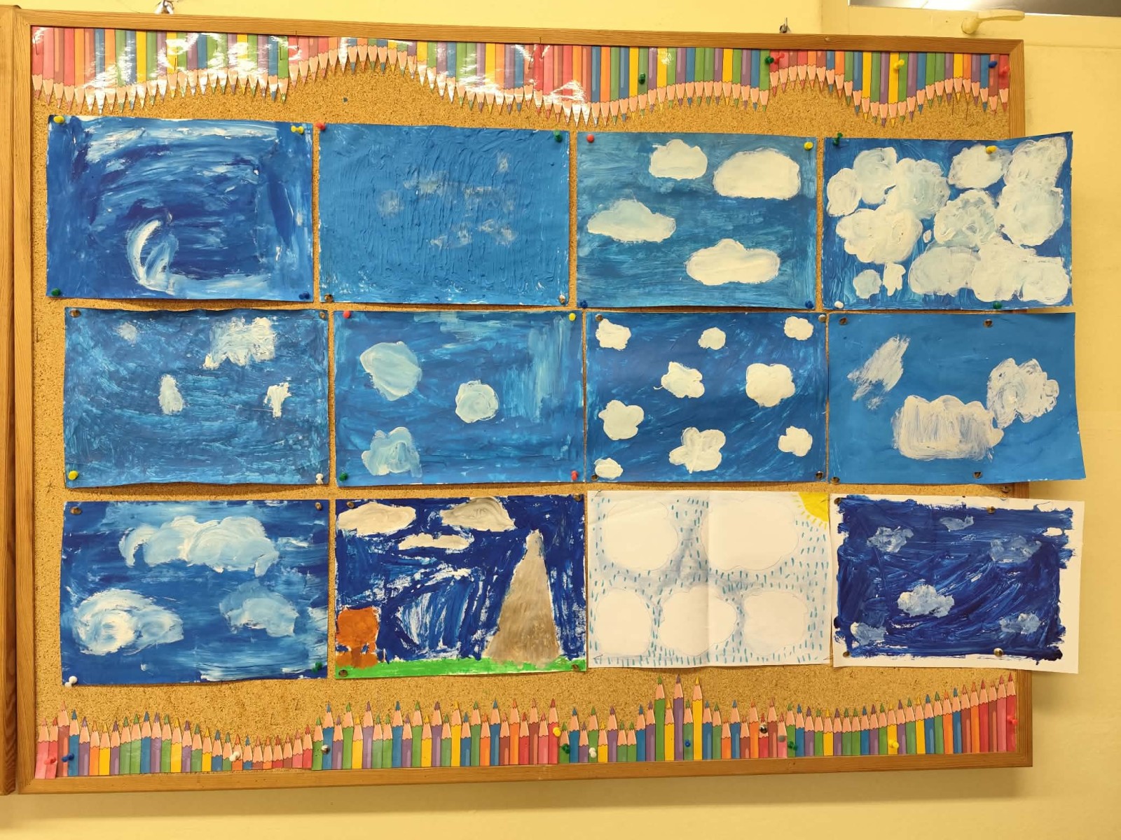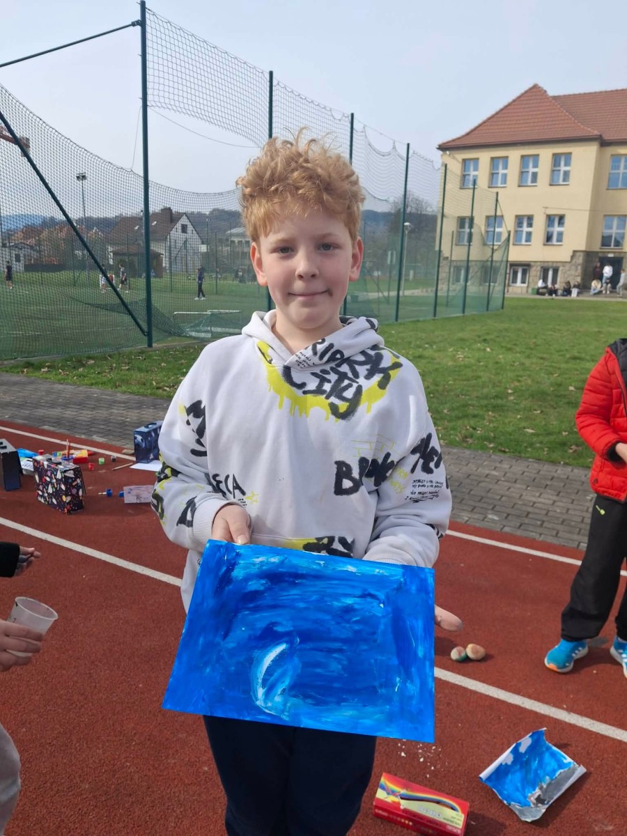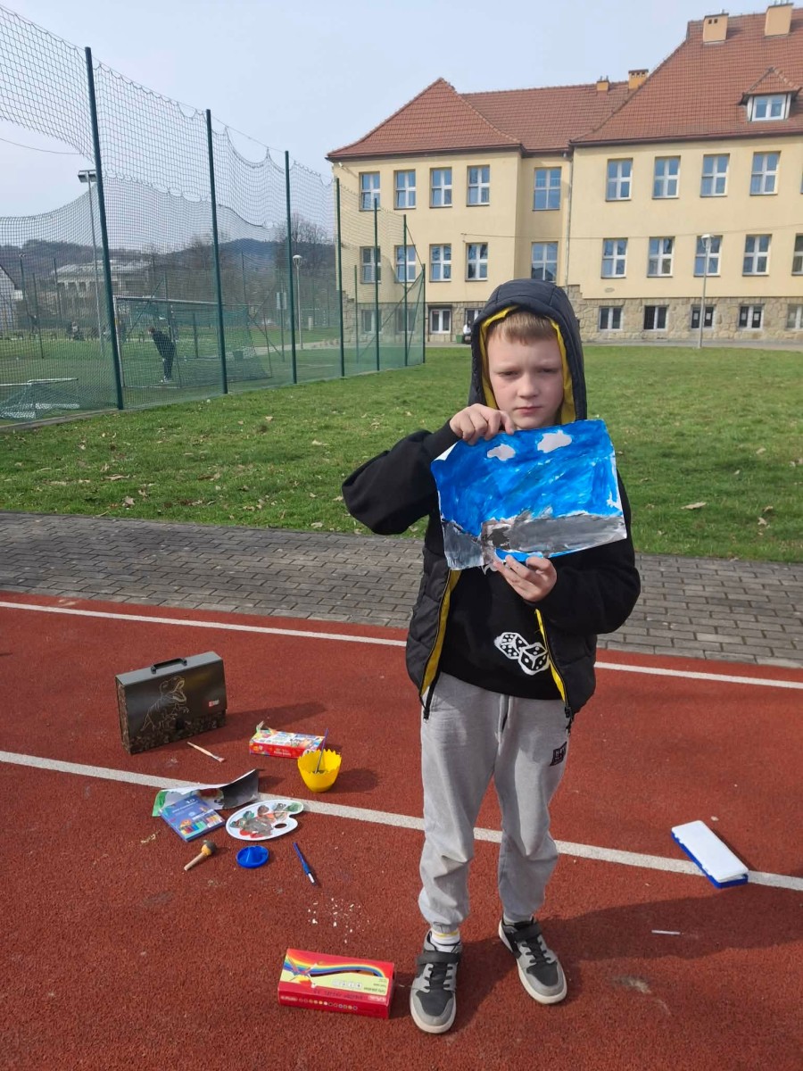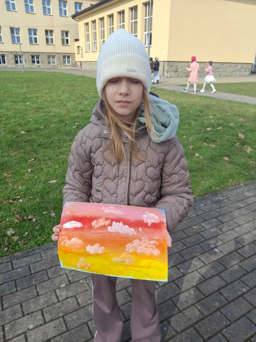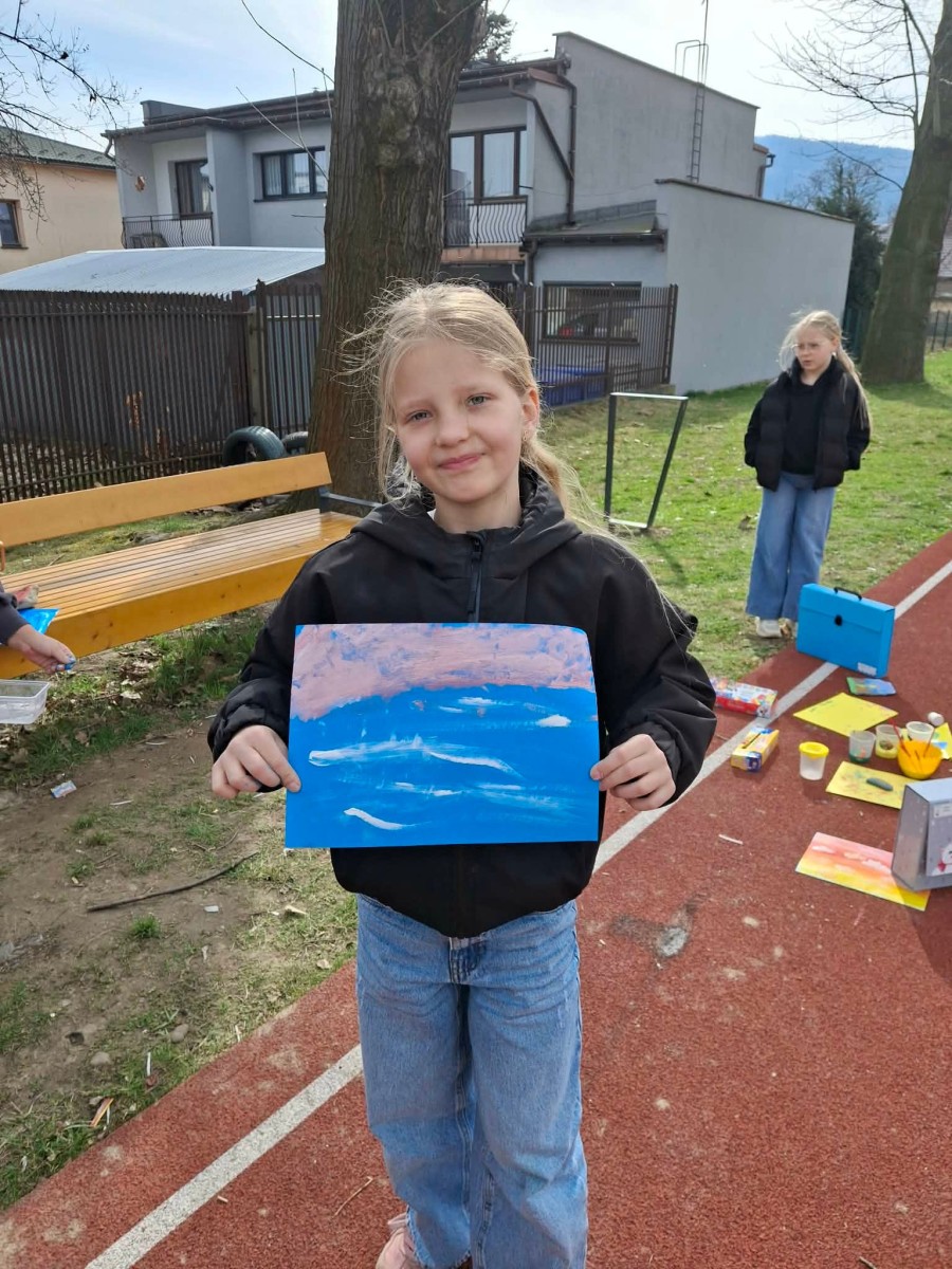 W pierwszych dniach wiosny uczniowie klas trzecich z radością zrealizowali kolejne dwa zadania w ramach ogólnopolskiego projektu edukacyjnego „Klasa w terenie”. Był to czas twórczej aktywności, inspiracji oraz nauki poprzez doświadczenie – oczywiście na świeżym powietrzu! Korzystając z pięknej pogody i pierwszych ciepłych promieni słońca, dzieci przeniosły swoje działania poza mury szkoły. Jednym z zadań było malowanie chmur farbami. Uczniowie z ogromnym zaangażowaniem tworzyli własne wizje nieba – pełne barw, lekkości i dziecięcej wyobraźni. Każda praca była wyjątkowa i pokazywała, jak różnorodnie można spojrzeć na otaczający nas świat.