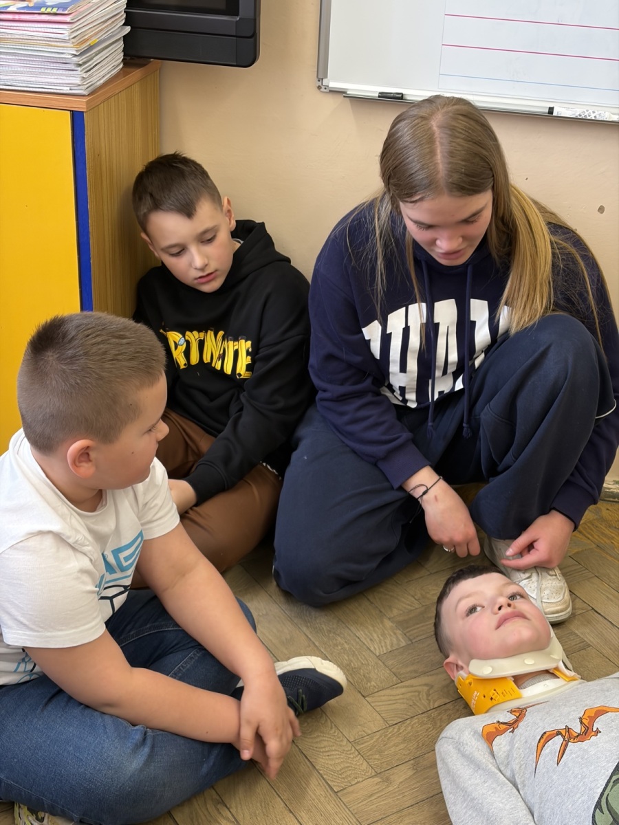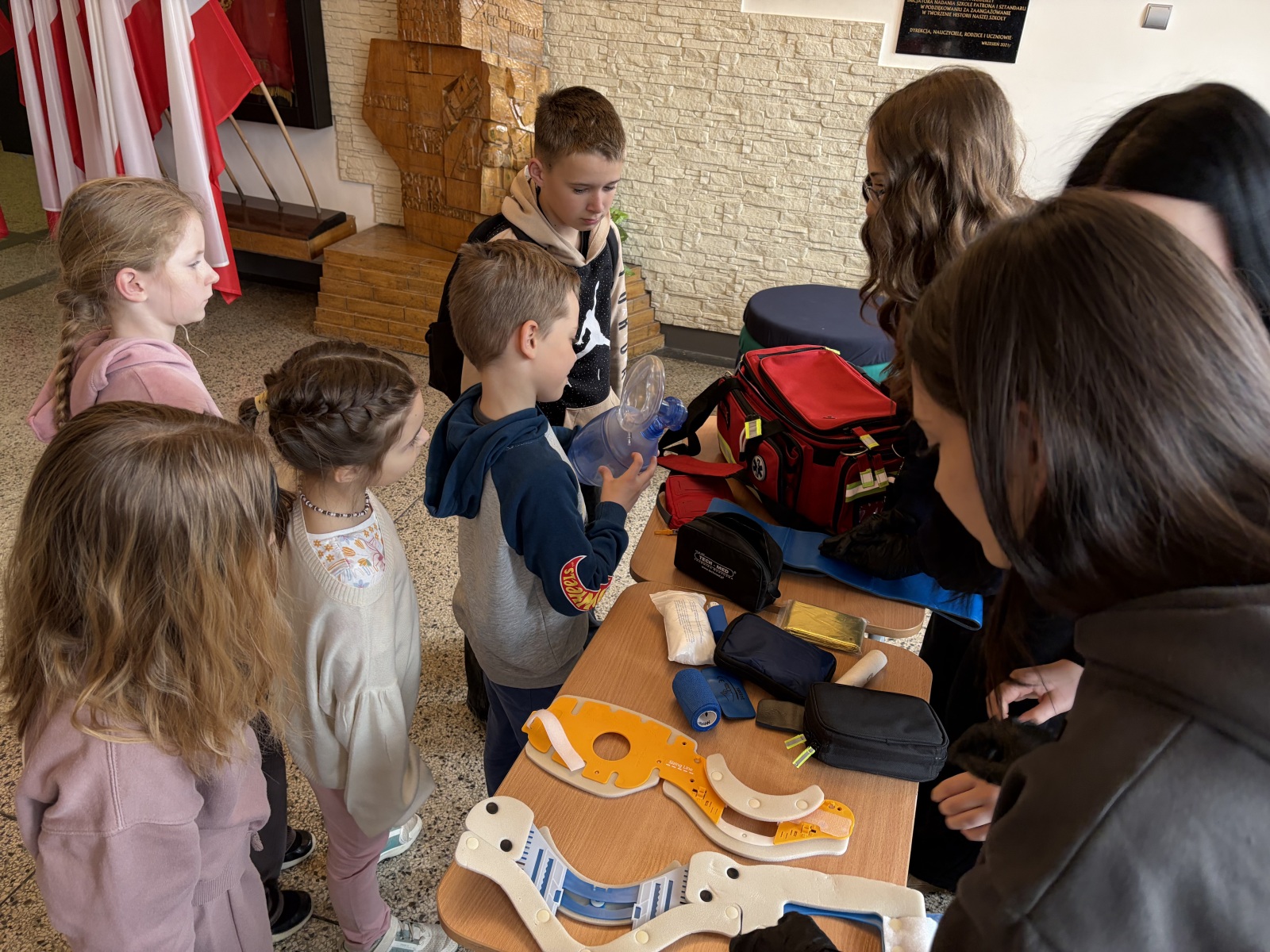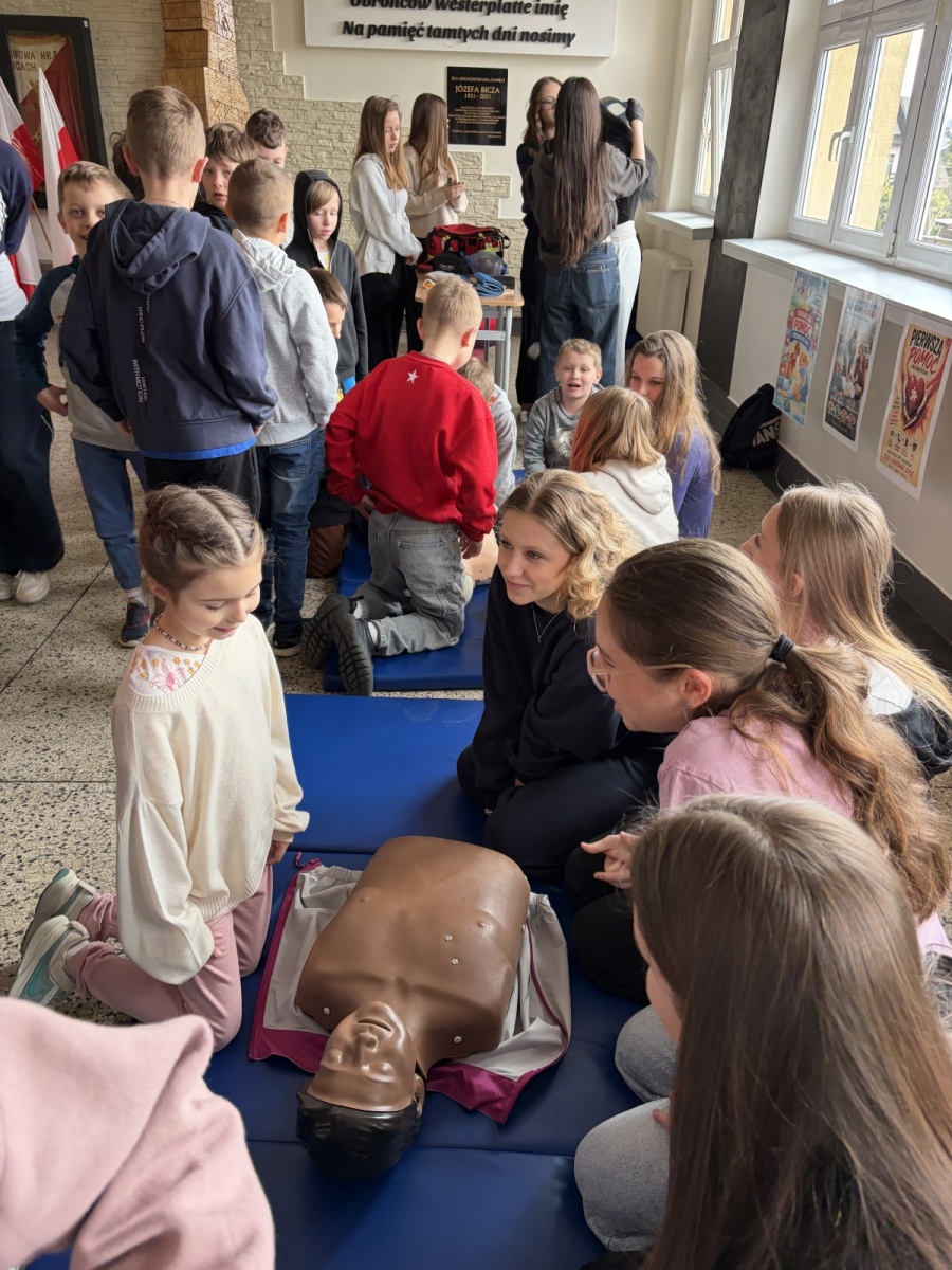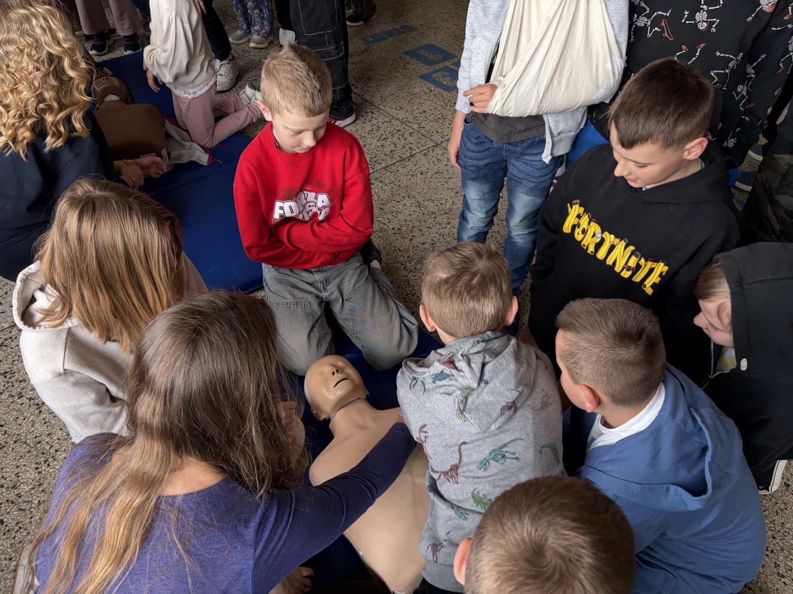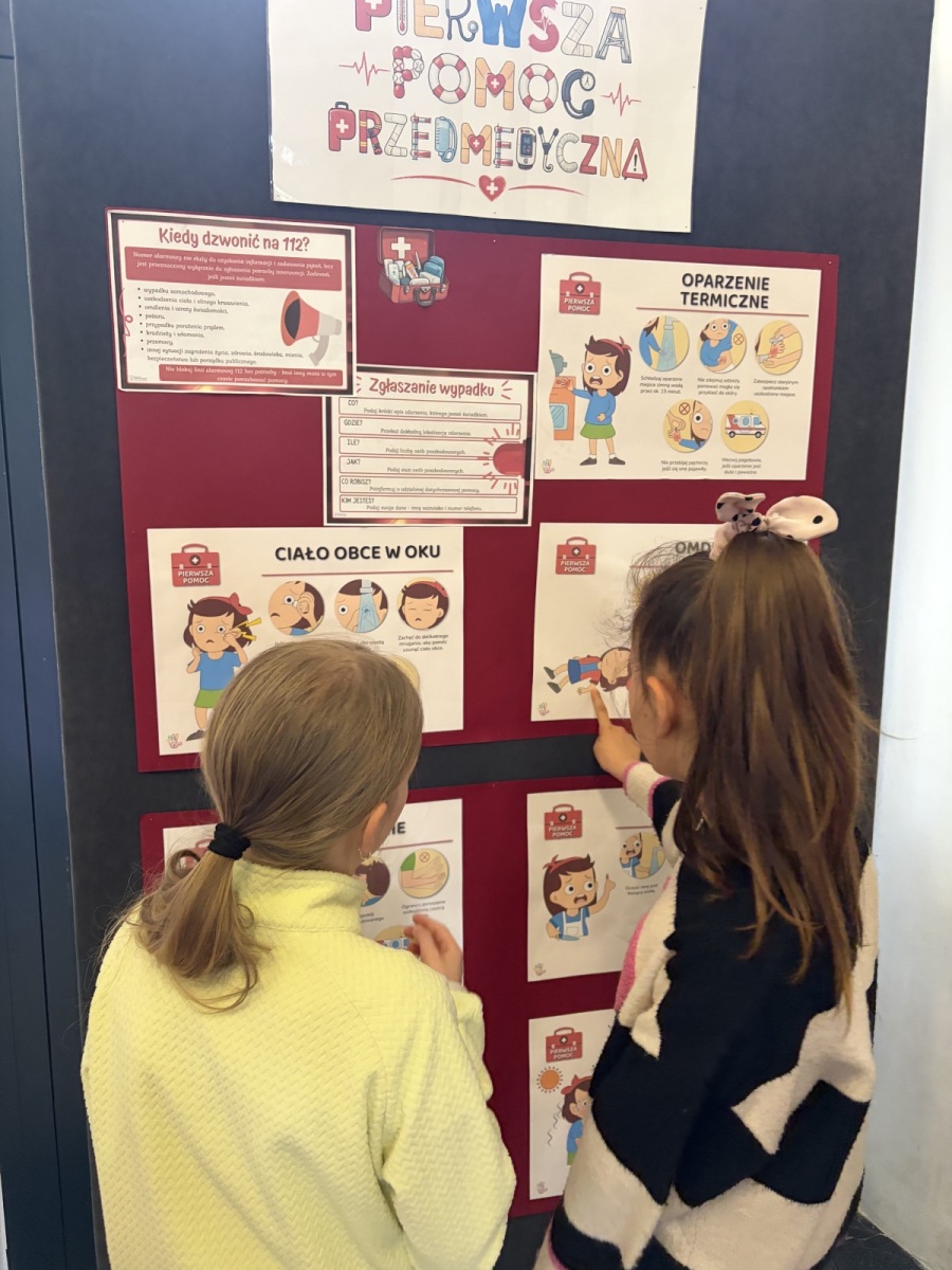 Dodatkowo w tym dniu w holu szkoły pojawiły się gazetki tematyczne poświęcone ratowaniu życia i zdrowia, a podczas zajęć z wychowawcą w klasach 1–7 omawiano zagadnienia związane z udzielaniem pierwszej pomocy w oparciu o otrzymane materiały edukacyjne.