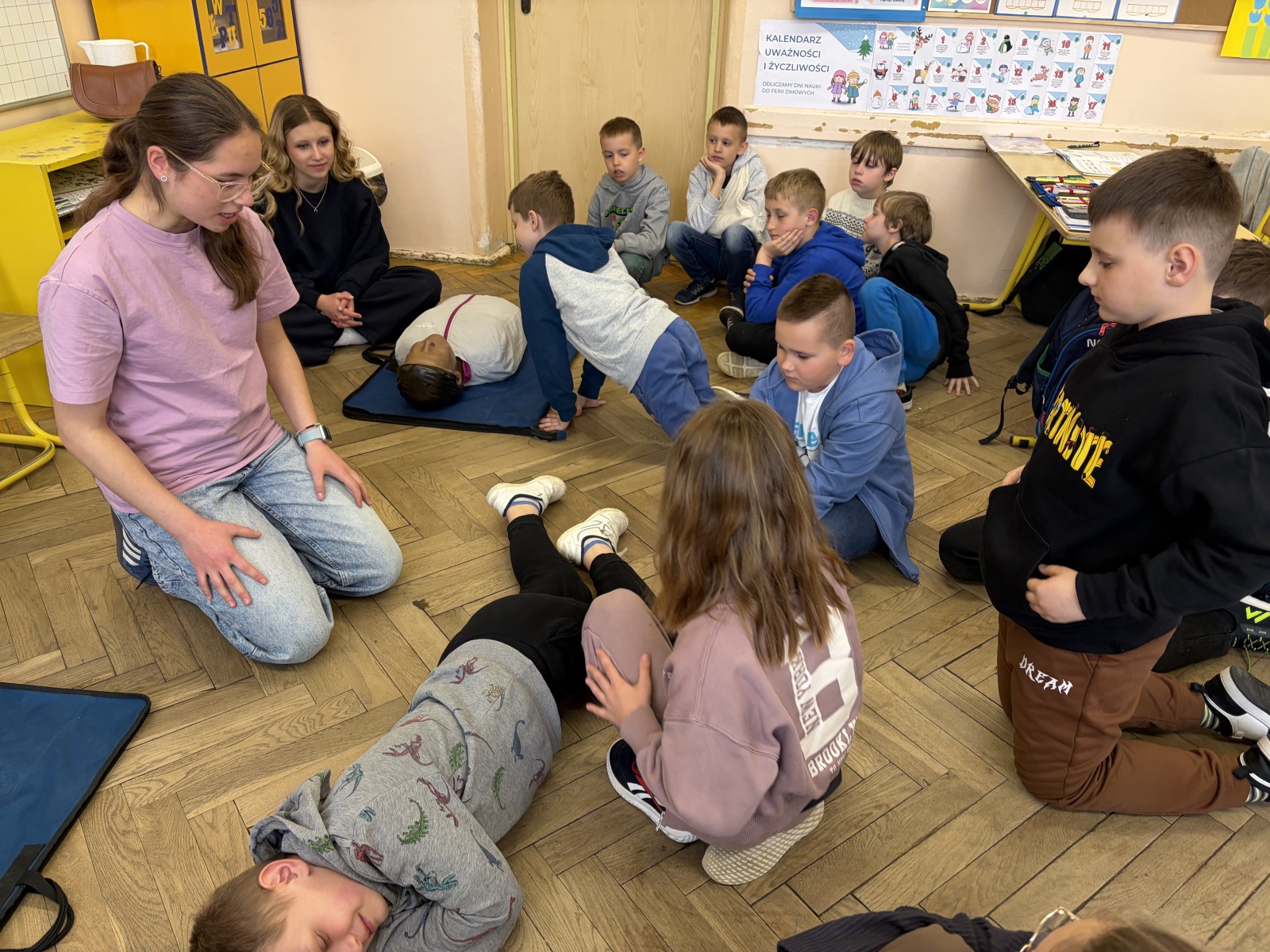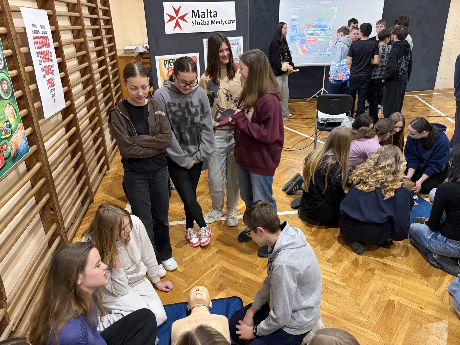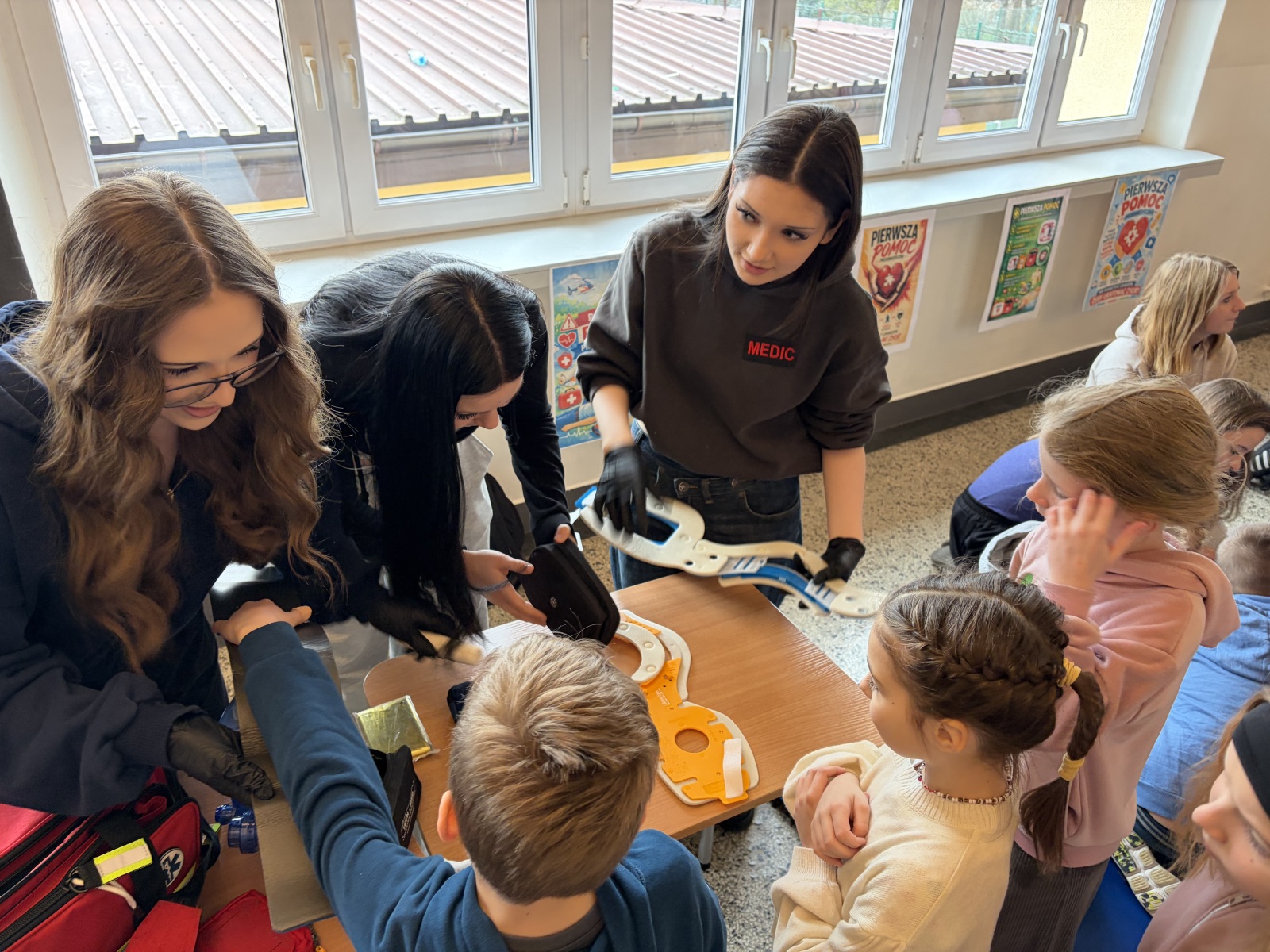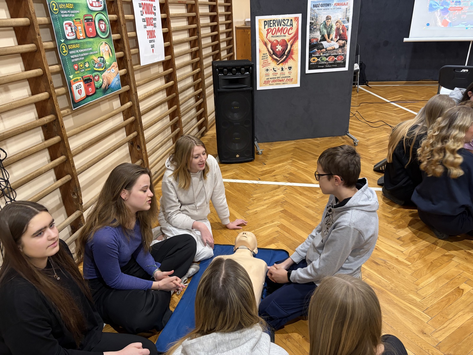 Dodatkowo w tym dniu w holu szkoły pojawiły się gazetki tematyczne poświęcone ratowaniu życia i zdrowia, a podczas zajęć z wychowawcą w klasach 1–7 omawiano zagadnienia związane z udzielaniem pierwszej pomocy w oparciu o otrzymane materiały edukacyjne.