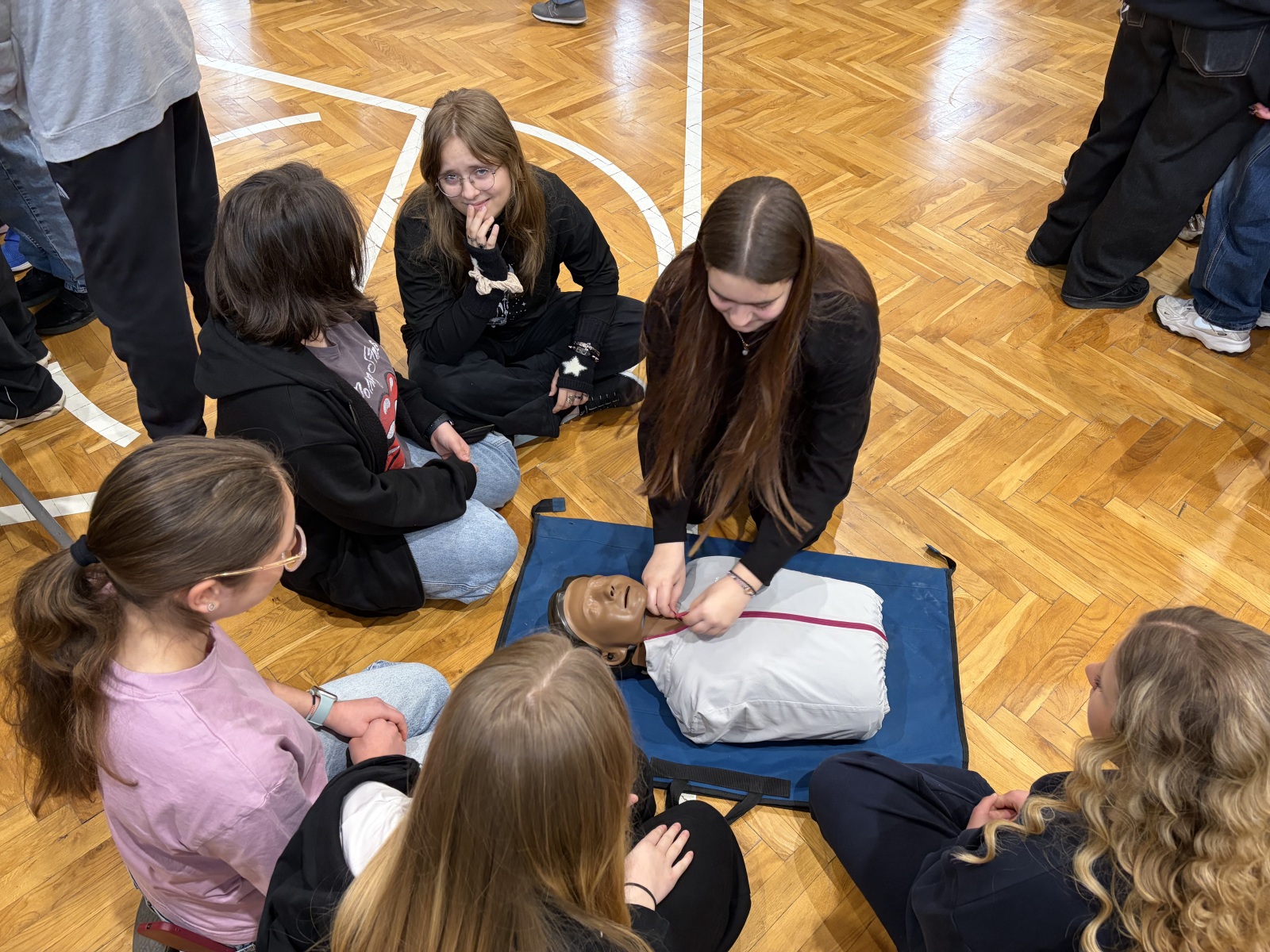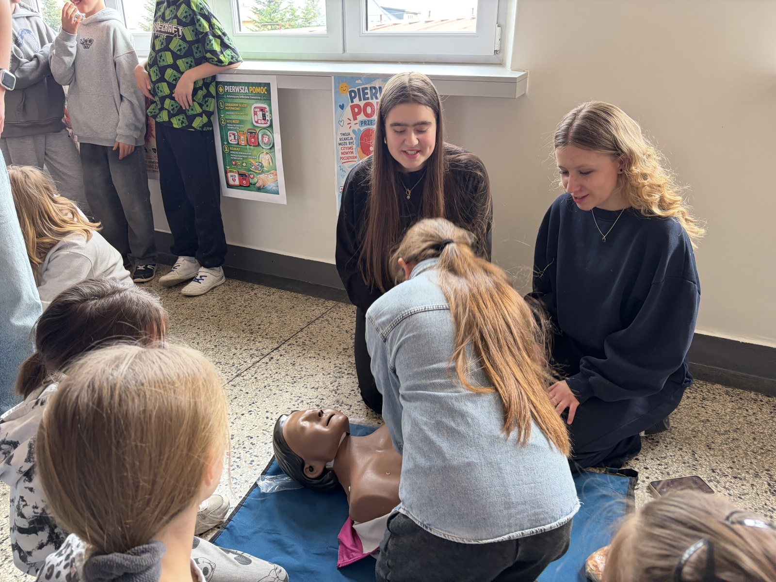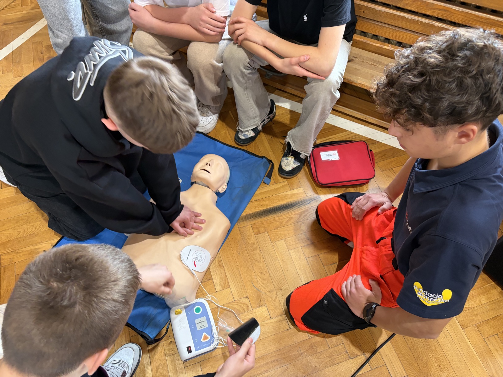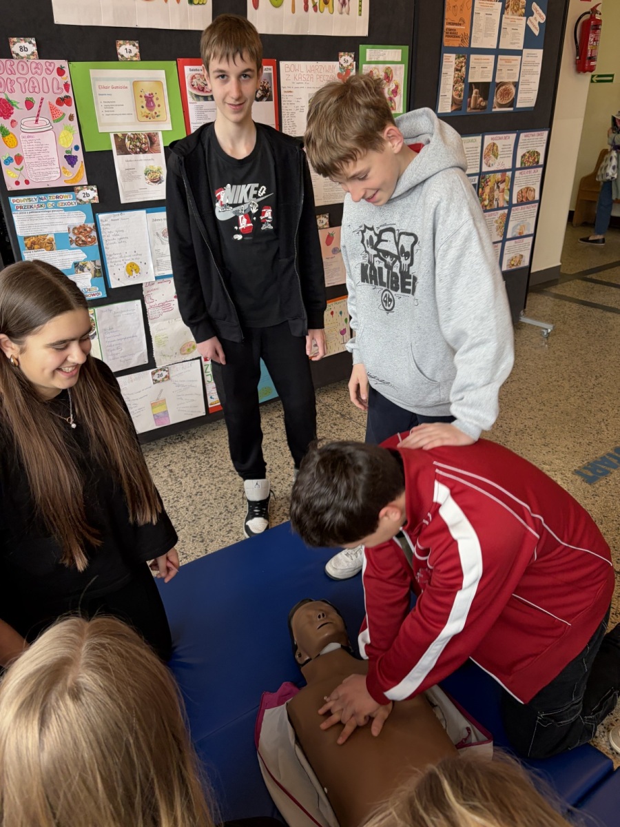 -przygotowania i przeprowadzenia pokazu pierwszej pomocy w holu szkoły dla całej społeczności,