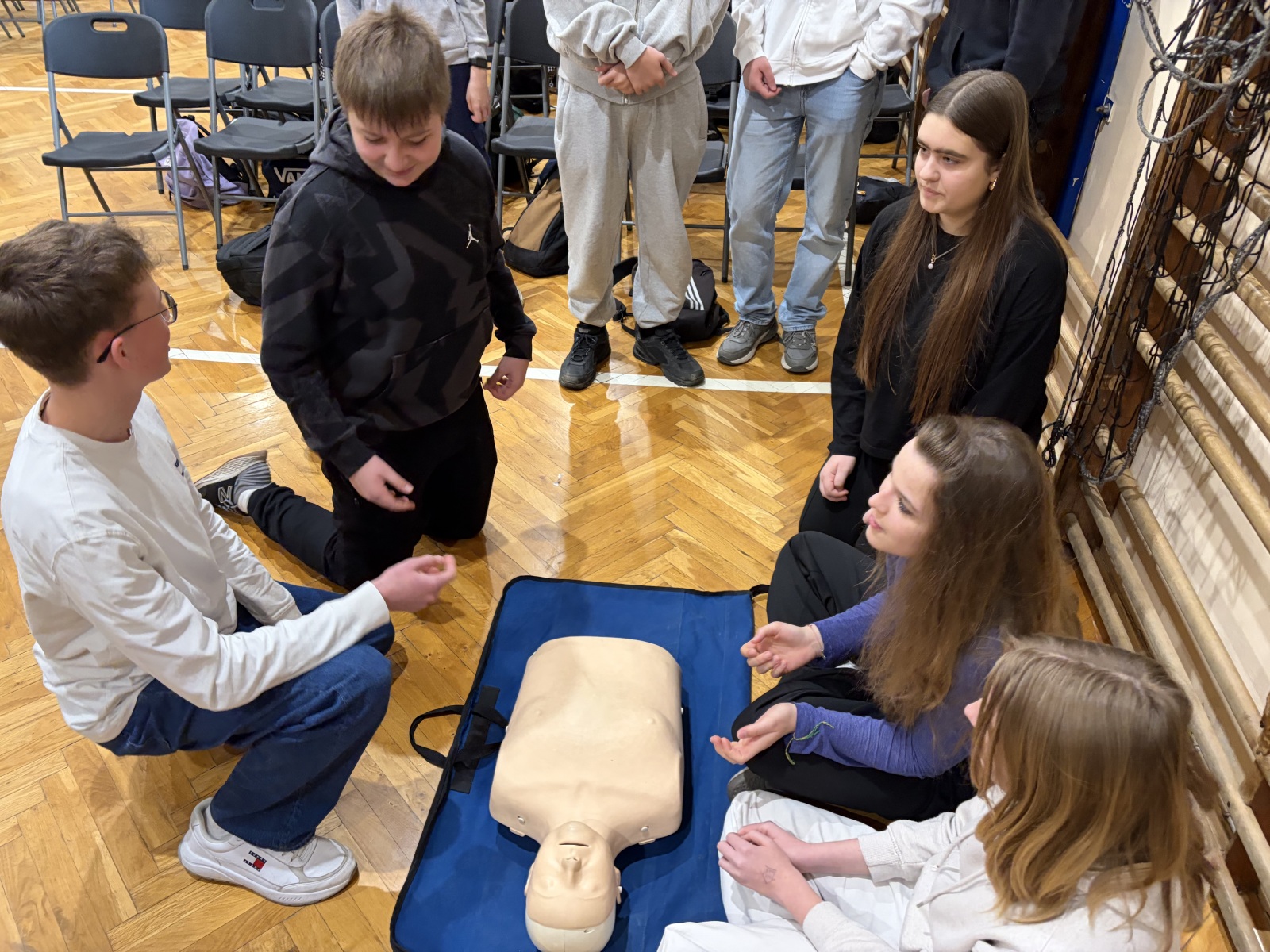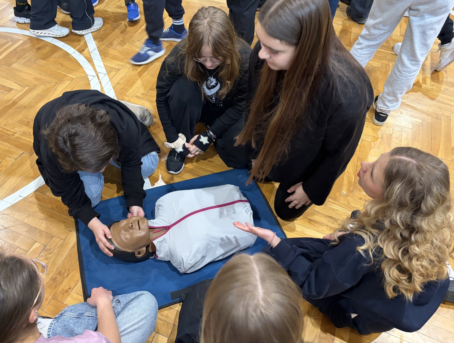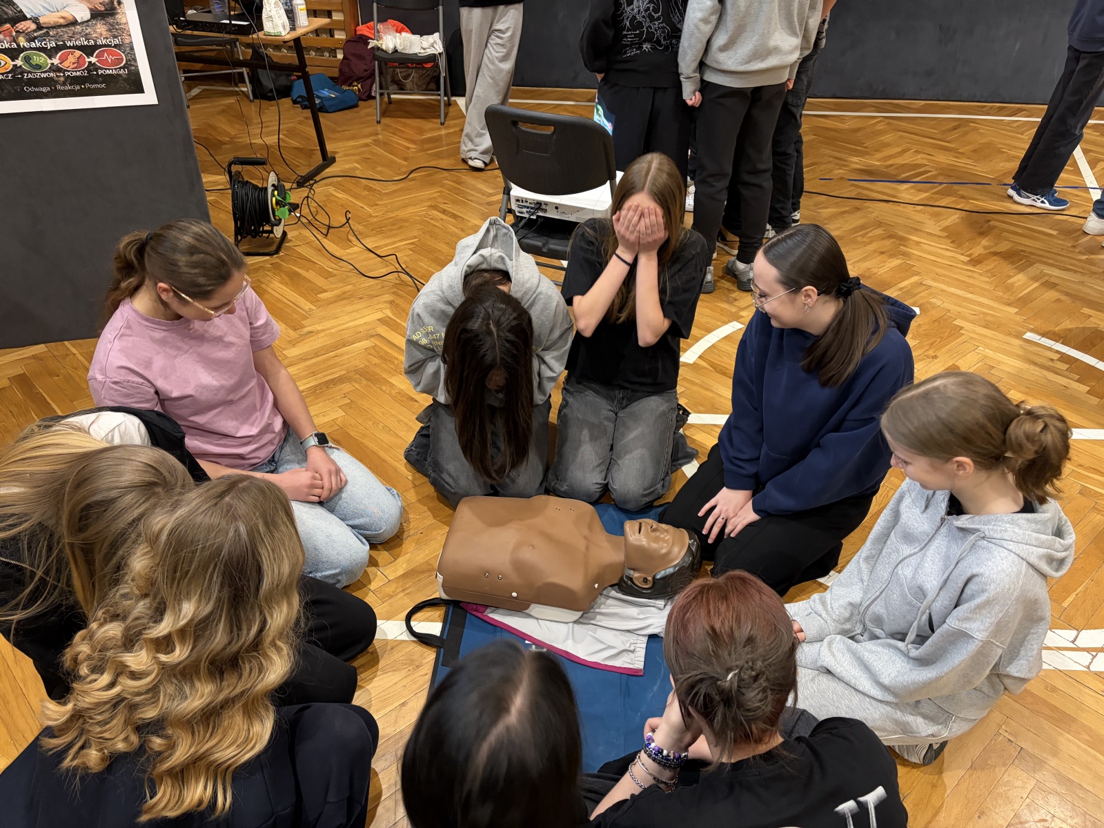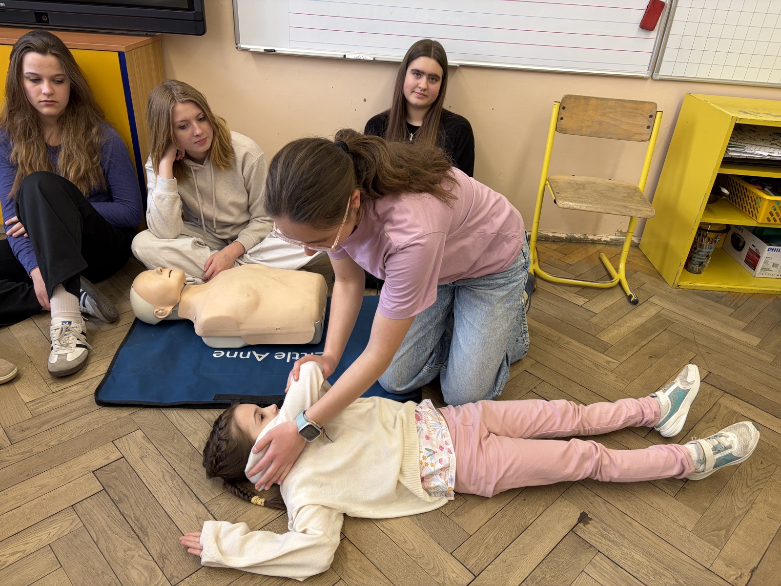 -przygotowania i przeprowadzenia pokazu pierwszej pomocy w holu szkoły dla całej społeczności,