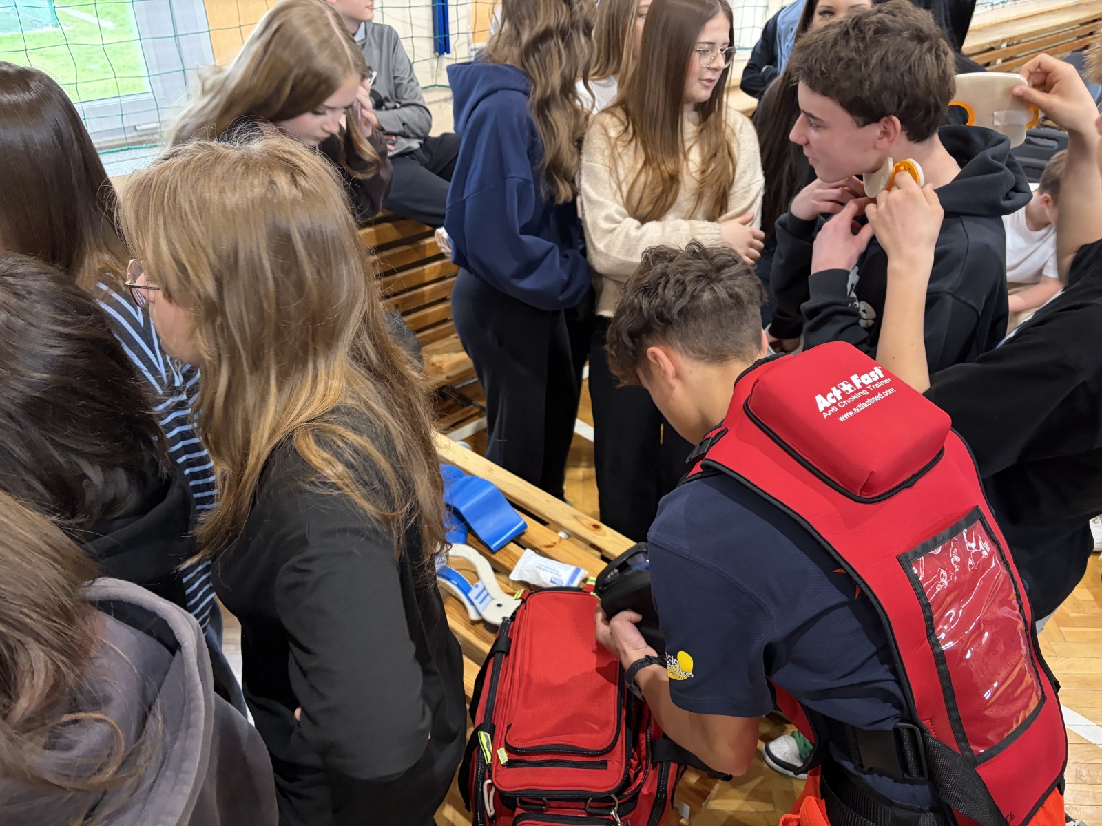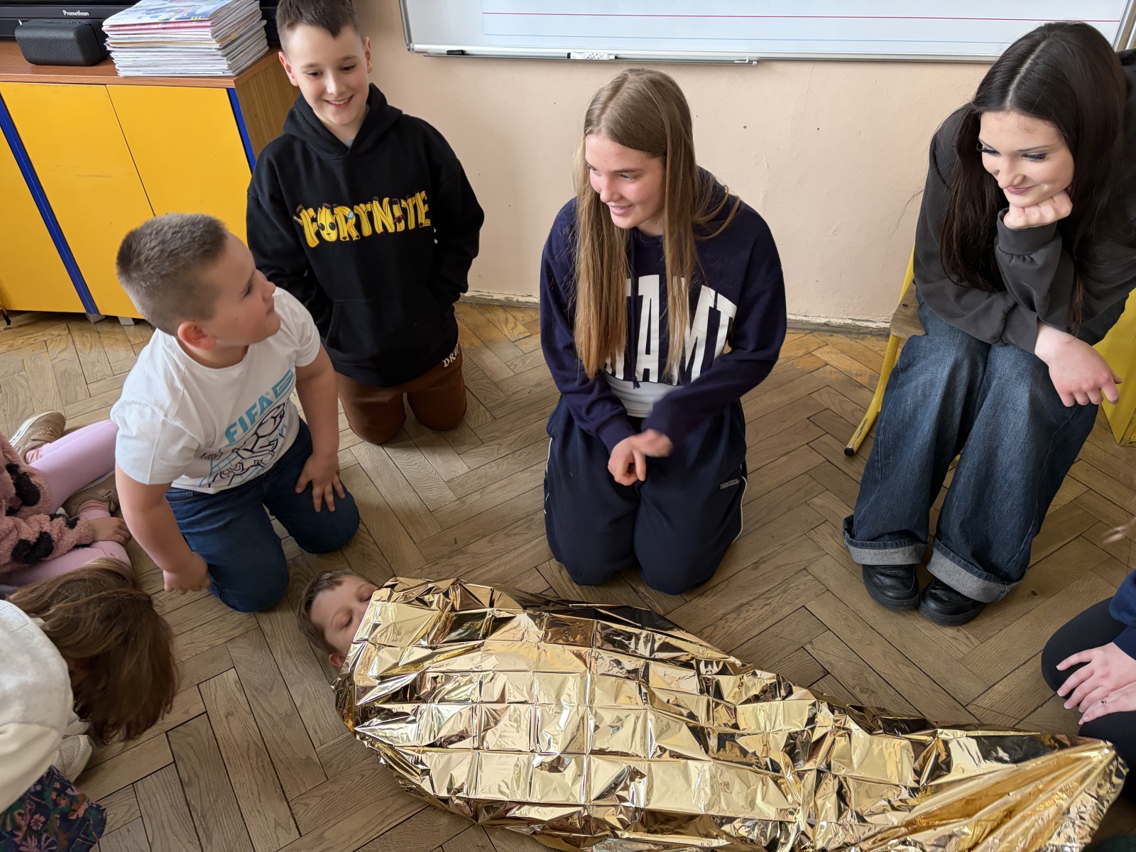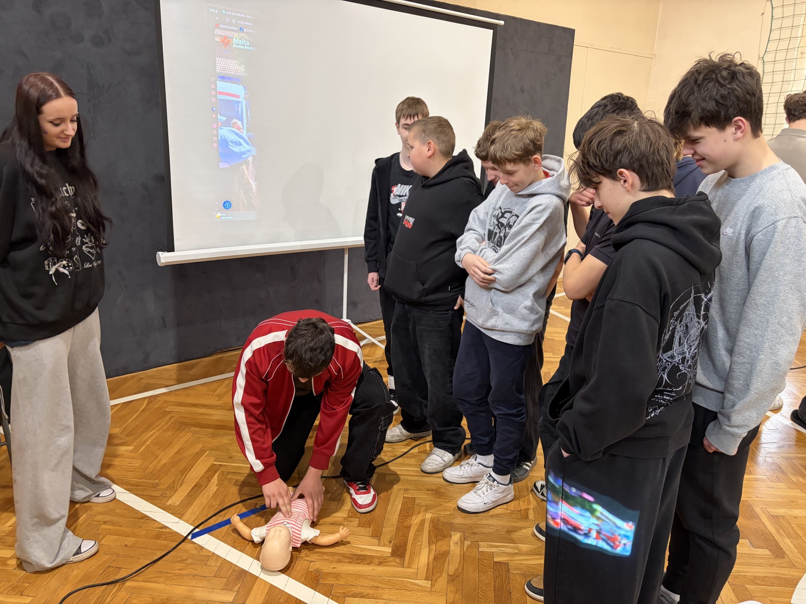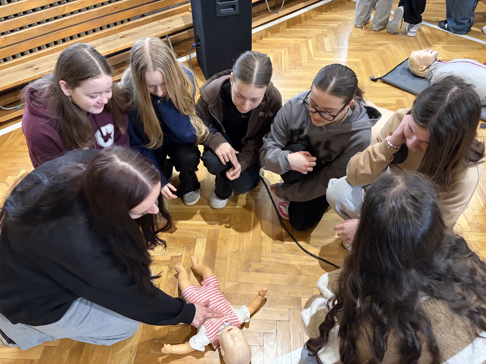 -przygotowania i przeprowadzenia pokazu pierwszej pomocy w holu szkoły dla całej społeczności,