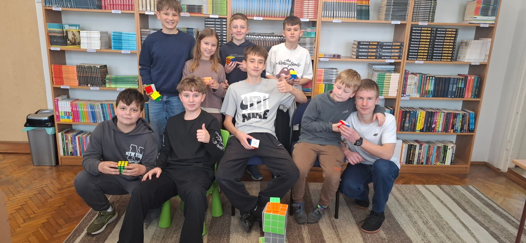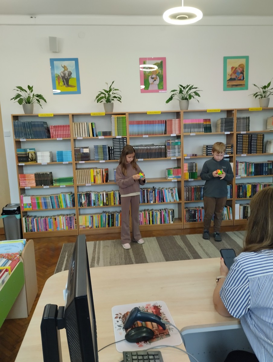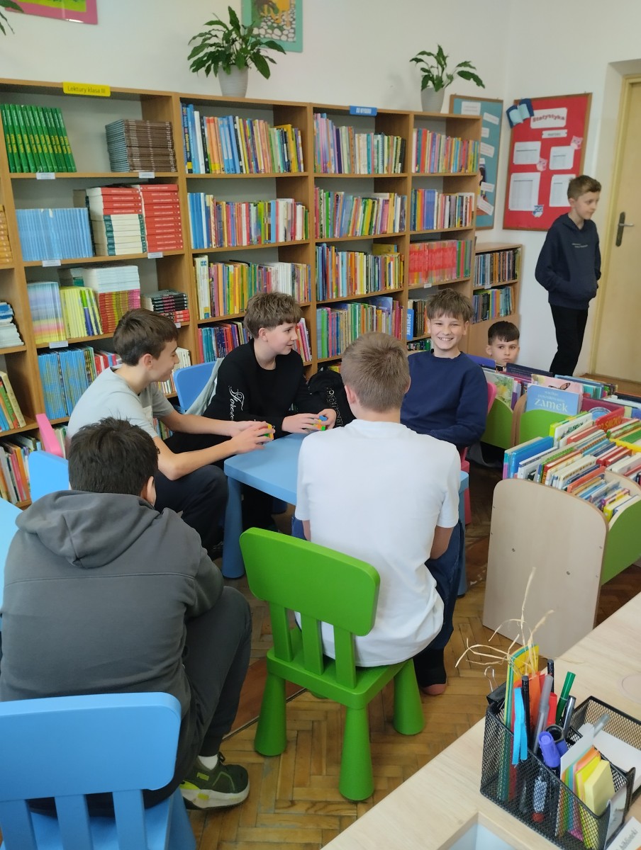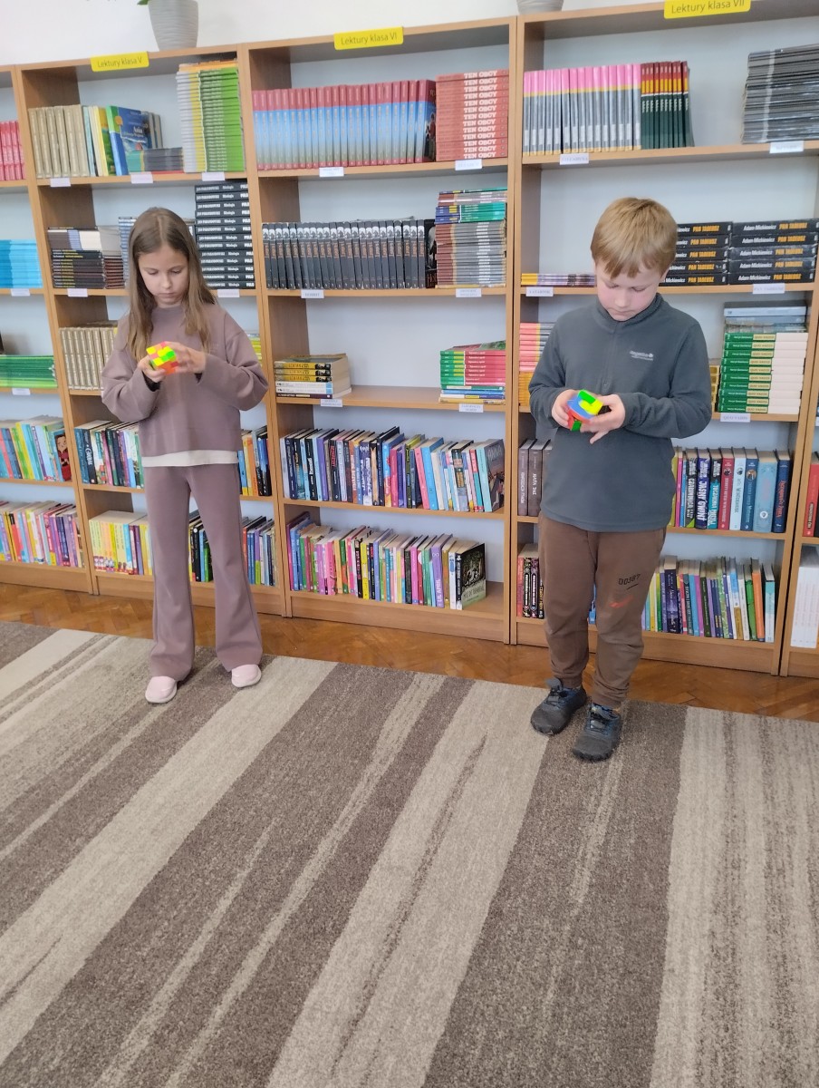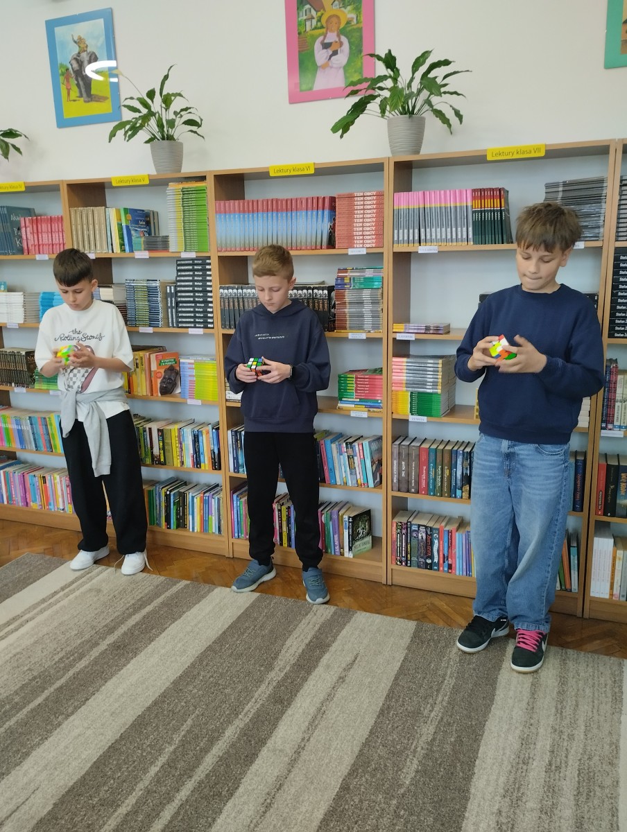 17 kwietnia w bibliotece szkolnej odbyła się kolejna edycja turnieju układania kostki Rubika na czas skierowana do uczniów klas I–VIII. Wydarzenie cieszyło się dużym zainteresowaniem, zarówno wśród najmłodszych, którzy dopiero rozpoczynają swoją przygodę z logicznymi łamigłówkami, jak i starszych uczniów, którzy doskonalą swoje umiejętności. Celem turnieju było nie tylko wyłonienie najszybszych zawodników, ale także rozwijanie logicznego myślenia, cierpliwości oraz zdrowej rywalizacji. Uczestnicy mieli okazję zaprezentować swoje techniki układania kostki, a także wymienić się doświadczeniami.