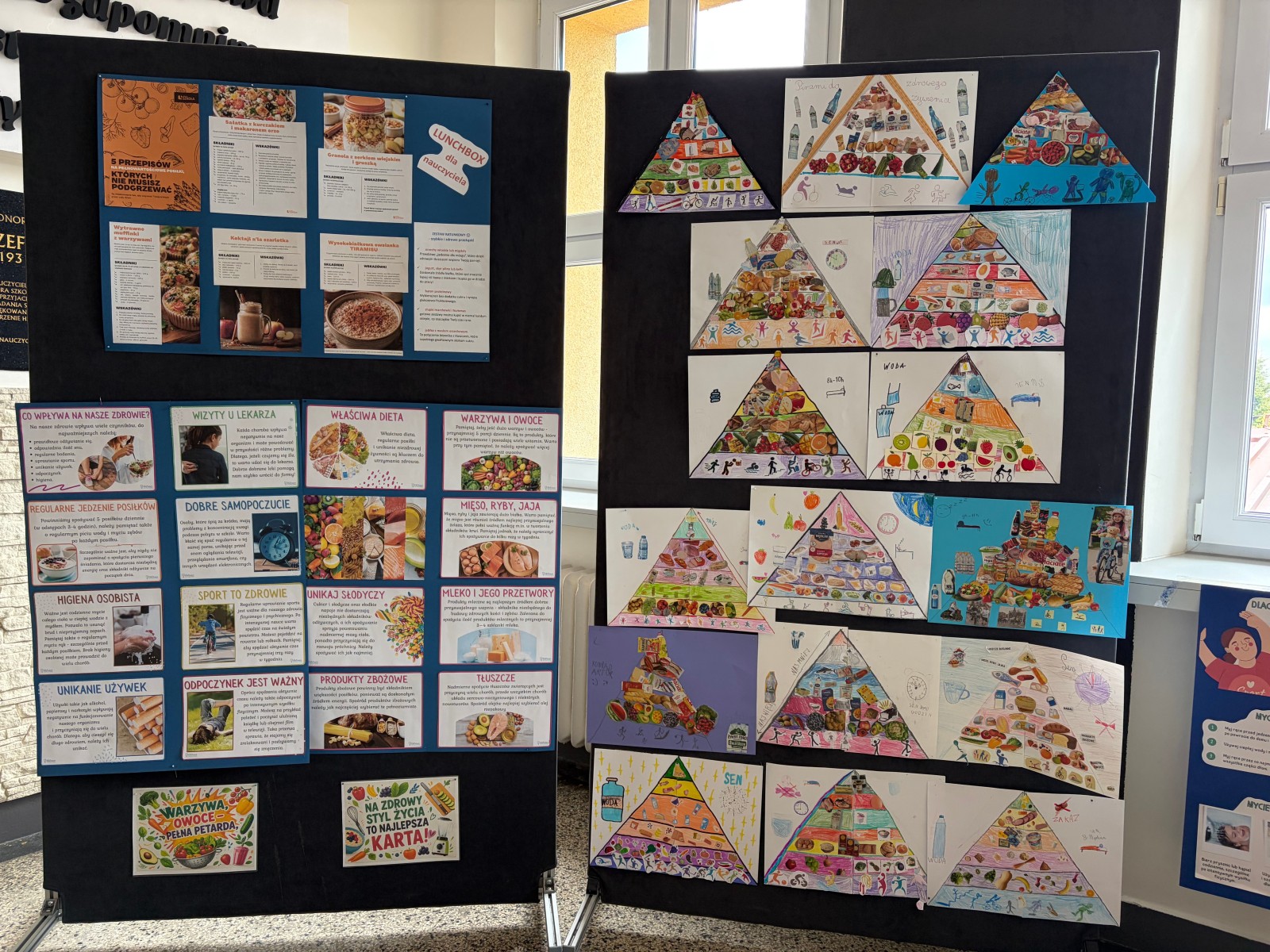 W holu szkoły pojawiły się również gazetki tematyczne poświęcone Światowemu Dniu Zdrowia, które wzbogaciły wiedzę uczniów na temat zdrowego stylu życia. Uczniowie klas drugich przygotowali natomiast piramidy zdrowego żywienia i aktywności fizycznej – ich prace zaprezentowano w formie wystawy, stanowiącej ciekawą i wartościową część całego przedsięwzięcia.